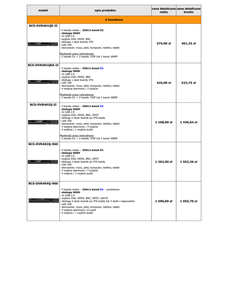 model opis produktu cena detaliczna cena detaliczna netto brutto 4 kanałowe BCS-DVR401QE-II - 4 kanały wideo – 25kl/s kanał D1 obsługa 960H 2x USB 2.0 wyjścia VGA, HDMI, BNC obsługa 1 dysk twardy 4Tb LAN 100 sterowanie: mysz, pilot, komputer, telefon, tablet 375,00 zł 461,25 zł 425,00 zł 522,75 zł 1 168,00 zł 1 436,64 zł 1 262,00 zł 1 552,26 zł 1 590,00 zł 1 955,70 zł Możliwość pracy hybrydowej: - 2 kanały D1 + 2 kanały 720P lub 1 kanał 1080P BCS-DVR401QEA-II - 4 kanały wideo – 25kl/s kanał D1 obsługa 960H 2x USB 2.0 wyjścia VGA, HDMI, BNC obsługa 1 dysk twardy 4Tb LAN 100 sterowanie: mysz, pilot, komputer, telefon, tablet 4 wejścia alarmowe / 3 wyjścia Możliwość pracy hybrydowej: - 2 kanały D1 + 2 kanały 720P lub 1 kanał 1080P BCS-DVR402Q-II - 4 kanały wideo – 25kl/s kanał D1 obsługa 960H 2x USB 2.0 wyjścia VGA, HDMI, BNC, SPOT obsługa 2 dyski twarde po 4Tb każdy LAN 100 sterowanie: mysz, pilot, komputer, telefon, tablet 4 wejścia alarmowe / 3 wyjścia 4 wejścia / 1 wyjście audio Możliwość pracy hybrydowej: - 2 kanały D1 + 2 kanały 720P lub 1 kanał 1080P BCS-DVR402Q-960 - 4 kanały wideo – 25kl/s kanał D1 obsługa 960H 2x USB 2.0 wyjścia VGA, HDMI, BNC, SPOT obsługa 2 dyski twarde po 4Tb każdy LAN 100 sterowanie: mysz, pilot, komputer, telefon, tablet 4 wejścia alarmowe / 3 wyjścia 4 wejścia / 1 wyjście audio BCS-DVR404Q-960 - 4 kanały wideo – 25kl/s kanał D1 – przelotowe - obsługa 960H - 2x USB 2.0 - wyjścia VGA, HDMI, BNC, SPOT, eSATA - obsługa 4 dyski twarde po 4Tb każdy lub 3 dyski i nagrywarka - LAN 100 - sterowanie: mysz, pilot, komputer, telefon, tablet - 4 wejścia alarmowe / 6 wyjść - 4 wejścia / 1 wyjście audio model opis produktu cena detaliczna cena detaliczna netto brutto 8 kanałowe BCS-DVR801QE-II - 8 kanałów wideo - 25kl/s kanał D1 obsługa 960H 2x USB 2.0 wyjścia VGA, HDMI, BNC obsługa 1 dysk twardy 4Tb LAN 100 sterowanie: mysz, pilot, komputer, telefon, tablet 650,00 zł 799,50 zł 715,00 zł 879,45 zł 1 602,00 zł 1 970,46 zł 1 790,00 zł 2 201,70 zł 2 036,00 zł 2 504,28 zł 2 252,00 zł 2 769,96 zł Możliwość pracy hybrydowej: - 6 kanałów D1 + 2 kanały 720P lub 1 kanał 1080P BCS-DVR801QEA-II - 8 kanałów wideo - 25kl/s kanał D1 - obsługa 960H 2x USB 2.0 wyjścia VGA, HDMI, BNC obsługa 1 dysk twardy 4Tb LAN 100 sterowanie: mysz, pilot, komputer, telefon, tablet 8 wejść alarmowych / 3 wyjścia Możliwość pracy hybrydowej: - 6 kanałów D1 + 2 kanały 720P lub 1 kanał 1080P BCS-DVR802Q-II - 8 kanałów wideo - 25kl/s kanał D1 - obsługa 960H - 2x USB 2.0 - wyjścia VGA, HDMI, BNC, SPOT - obsługa 2 dyski twarde po 4Tb każdy - LAN 100 - sterowanie: mysz, pilot, komputer, telefon, tablet - 8 wejść alarmowych / 3 wyjścia - 8 wejść / 1 wyjście audio Możliwość pracy hybrydowej: - 6 kanałów D1 + 2 kanały 720P lub 1 kanał 1080P BCS-DVR802Q-960 - 8 kanałów wideo - 25kl/s kanał D1 - obsługa 960H - 2x USB 2.0 - wyjścia VGA, HDMI, BNC, SPOT - obsługa 2 dyski twarde po 4Tb każdy - LAN 100 - sterowanie: mysz, pilot, komputer, telefon, tablet - 8 wejść alarmowych / 3 wyjścia - 8 wejść / 1 wyjście audio BCS-DVR804Q-II - 8 kanałów wideo - 25kl/s kanał D1 obsługa 960H 2x USB 2.0 wyjścia VGA, HDMI, BNC, SPOT, eSATA obsługa 4 dyski twarde po 4Tb każdy lub 3 dyski i nagrywarka LAN 100 sterowanie: mysz, pilot, komputer, telefon, tablet 8 wejść alarmowych / 3 wyjścia 4 wejścia / 1 wyjście audio Możliwość pracy hybrydowej: - 6 kanałów D1 + 2 kanały 720P lub 1 kanał 1080P BCS-DVR804Q-960 - 8 kanałów wideo - 25kl/s kanał D1 obsługa 960H 2x USB 2.0 wyjścia VGA, HDMI, BNC, SPOT, eSATA obsługa 4 dyski twarde po 4Tb każdy lub 3 dyski i nagrywarka LAN 100 sterowanie: mysz, pilot, komputer, telefon, tablet 8 wejść alarmowych / 3 wyjścia 4 wejścia / 1 wyjście audio model opis produktu cena detaliczna cena detaliczna netto brutto 16 kanałowe BCS-DVR1601ME-II - 16 kanałów wideo - 12kl/s kanał D1 obsługa 960H 2x USB 2.0 wyjścia VGA, HDMI, BNC obsługa 1 dysk twardy 4Tb LAN 100 sterowanie: mysz, pilot, komputer, telefon, tablet 753,00 zł 926,19 zł 812,00 zł 998,76 zł 1 061,00 zł 1 305,03 zł 1 169,00 zł 1 437,87 zł 2 017,00 zł 2 480,91 zł 2 111,00 zł 2 596,53 zł Możliwość pracy hybrydowej: - 14 kanałów D1 + 2 kanały 720P lub 1 kanał 1080P - 12 kanałów D1 + 4 kanały 720P lub 2 kanały 1080P BCS-DVR1601MEA- 16 kanałów wideo - 12kl/s kanał D1 II - obsługa 960H - 2x USB 2.0 wyjścia VGA, HDMI, BNC obsługa 1 dysk twardy 4Tb LAN 100 sterowanie: mysz, pilot, komputer, telefon, tablet 16 wyjść alarmowych Możliwość pracy hybrydowej: - 14 kanałów D1 + 2 kanały 720P lub 1 kanał 1080P - 12 kanałów D1 + 4 kanały 720P lub 2 kanały 1080P BCS-DVR1601QE-II - 16 kanałów wideo – 25kl/s kanał D1 obsługa 960H 2x USB 2.0 wyjścia VGA, HDMI, BNC obsługa 1 dysk twardy 4Tb LAN 100 sterowanie: mysz, pilot, komputer, telefon, tablet Możliwość pracy hybrydowej: - 14 kanałów D1 + 2 kanały 720P lub 1 kanał 1080P - 12 kanałów D1 + 4 kanały 720P lub 2 kanały 1080P BCS-DVR1601QEA- 16 kanałów wideo – 25kl/s kanał D1 II - obsługa 960H - 2x USB 2.0 wyjścia VGA, HDMI, BNC obsługa 1 dysk twardy 4Tb LAN 100 sterowanie: mysz, pilot, komputer, telefon, tablet 16 wyjść alarmowych Możliwość pracy hybrydowej: - 14 kanałów D1 + 2 kanały 720P lub 1 kanał 1080P - 12 kanałów D1 + 4 kanały 720P lub 2 kanały 1080P BCS-DVR1602Q-II - 16 kanałów wideo – 25kl/s kanał D1 - obsługa 960H 2x USB 2.0 wyjścia VGA, HDMI, BNC, SPOT obsługa 2 dyski twarde 4Tb każdy LAN 100 sterowanie: mysz, pilot, komputer, telefon, tablet 4 wejścia / 1 wyjście audio 16 wejść / 3 wyjścia alarmowe Możliwość pracy hybrydowej: - 14 kanałów D1 + 2 kanały 720P lub 1 kanał 1080P - 12 kanałów D1 + 4 kanały 720P lub 2 kanały 1080P BCS-DVR1602Q-960 - 16 kanałów wideo – 25kl/s kanał D1 obsługa 960H 2x USB 2.0 wyjścia V