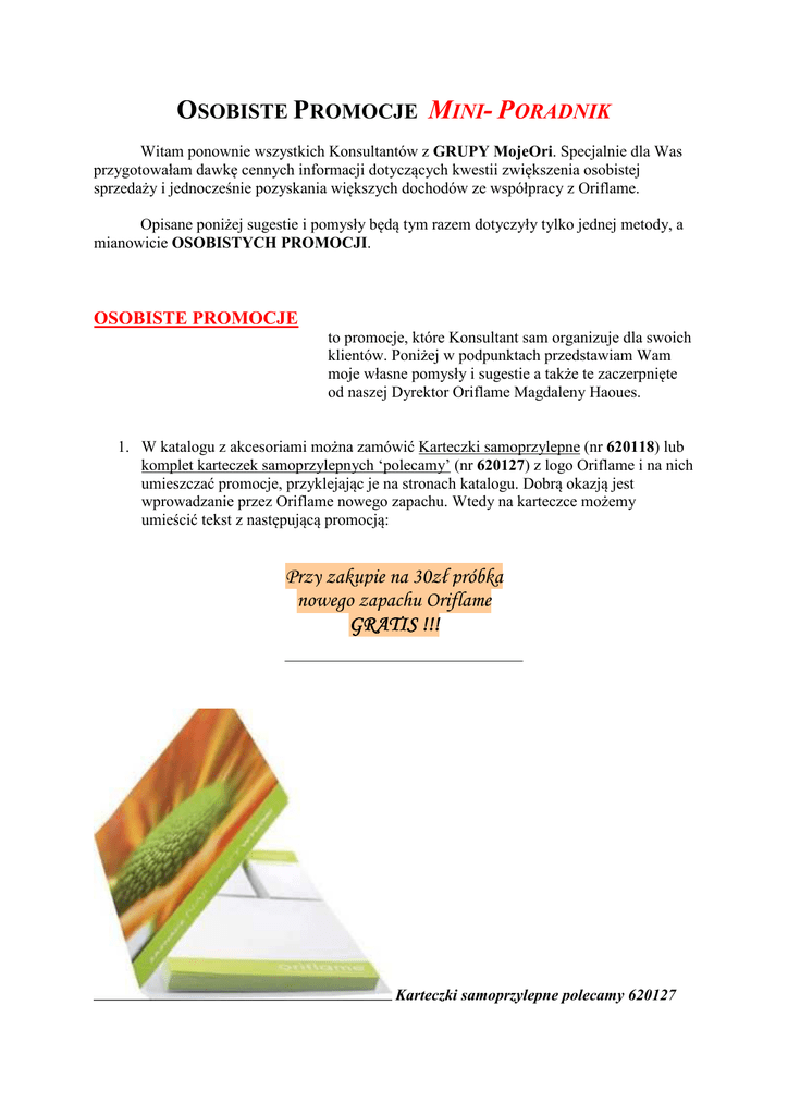 OSOBISTE PROMOCJE MINI- PORADNIK Witam ponownie wszystkich Konsultantów z GRUPY MojeOri. Specjalnie dla Was przygotowałam dawkę cennych informacji dotyczących kwestii zwiększenia osobistej sprzedaży i jednocześnie pozyskania większych dochodów ze współpracy z Oriflame. Opisane poniżej sugestie i pomysły będą tym razem dotyczyły tylko jednej metody, a mianowicie OSOBISTYCH PROMOCJI. OSOBISTE PROMOCJE to promocje, które Konsultant sam organizuje dla swoich klientów. Poniżej w podpunktach przedstawiam Wam moje własne pomysły i sugestie a także te zaczerpnięte od naszej Dyrektor Oriflame Magdaleny Haoues. 1. W katalogu z akcesoriami można zamówić Karteczki samoprzylepne (nr 620118) lub komplet karteczek samoprzylepnych ‘polecamy’ (nr 620127) z logo Oriflame i na nich umieszczać promocje, przyklejając je na stronach katalogu. Dobrą okazją jest wprowadzanie przez Oriflame nowego zapachu. Wtedy na karteczce możemy umieścić tekst z następującą promocją: Przy zakupie na 30zł próbka nowego zapachu Oriflame GRATIS !!! Karteczki samoprzylepne polecamy 620127 Karteczki samoprzylepne 620118 2. Gdy chcemy zachęcić naszych klientów na zrobienie jeszcze większych zakupów, dobrze jest zakupić wcześniej więcej kosmetyczek z ULOTEK ZE ZNIŻKAMI, o ktorych każdy Konsultant jest informowany i które są do pobrania na głównej stronie Oriflame pod koniec trwania każdego katalogu. Można kupić kosmetyczki nawet za 4,00 zł – za sztukę. Wtedy treść karteczki może wyglądać w następujący sposób: Za zakupy na kwotę 70zł kosmetyczka Oriflame GRATIS !!! 3. Z katalogu „Akcesoria” możemy również zamówić Kartę stałego klienta (nr 620692). Ma ona na celu ‘przytrzymanie’ klienta przy naszych produktach i jednocześnie zapoznanie go z tymi produktami. Zakładamy taką kartę klientowi i informujemy o korzyściach jej posiadania. Klient kupuje u nas 10 produktów (nie musi w 1 katalogu, tylko zbiera je i dopisuje na listę w swojej karcie). Następnie nagradzamy go rabatem 5 % zniżki na zamówienie z następnego katalogu. (Rabat naliczamy od całkowitej kwoty 10-ciu zamówionych produktów). Po zrealizowaniu pierwszej karty możemy założyć jeszcze dwie następne na rabaty kolejno 8 % i 10 %. Pamiętaj, że Ty kupisz te kosmetyki z rabatem 30 %. Dzięki takiej karcie klient będzie zmotywowany do regularnego składania zamówień, pozna kosmetyki i w przyszłości chętnie wróci do tych samych, wcześniej zamówionych. Wpisując kod Karty stałego klienta zamawiamy 10 szt. Karta stałego klienta 620692 4. NOWOŚĆ możemy sprzedawać po cenie w jakiej ją kupujemy (czyli cenie handlowej – tzn. – 30 % ). Opłaca się to jednak jedynie w przypadku wysoko punktowanych produktów, zwłaszcza wód toaletowych. Weźmy za przykład wodę perfumowaną Grace – nowość w katalogu 15, która ma aż 30 PP. Na pewno sprzedamy ich więcej (klient pozna zapach, gdyż strony z nowym zapachem są zawsze perfumowane) gdy różnica cenowa, którą zaproponujemy będzie aż tak duża. Co zyskujemy? PUNKTY! Wystarczy sprzedać 3 wody Grace i już zyskujemy 90 PP, a 100 PP potrzebujemy by otrzymać darmową dostawę paczki do domu czy też by uczestniczyć w specjalnych programach i zdobywać nagrody. 5. W przypadku oferty z kremami gdzie mamy z tej samej linii przecenione kremy na dzień i na noc, możemy zrobić następującą promocję: Przy zakupie kremu na dzień krem na noc 30 % taniej ! I tutaj obniżamy kwotę za krem na noc do -30% czyli sprzedajemy go za taką samą cenę, za jaką go nabyjemy. W ten sposób zwiększamy szansę na podwójne punkty, a zadowolony klient zyskuje cały komplet ulubionego kremu w korzystnej cenie. 79,00 zł 79,00 zł 54,90 zł 54,00 zł 42,00 zł 6. Oferta na szampony/balsamy/mydełka/żele do kąpieli/płyny do kąpieli : Kup 2 a trzeci otrzymasz GRATIS !!! GRATIS + 7. OFERTY WIĄZANE: Wiążemy produkty z tej samej linii i kategorii, np: Kupując cień GIORDANI GOLD za tusz GIORDANI GOLD zapłacisz mniej ! I tutaj obniżamy cenę tuszu np – 15%. Tak samo możemy zrobić z szamponem i odżywką czy serum do zniszczonych końcówek. PODSUMOWANIE: Mam gorącą nadzieję, że zestawione przeze mnie pomysły okażą się dla Was pomocne w zwiększeniu sprzedaży produktów Oriflame i większość z nich wcielicie w życie. Pamiętajcie jednak, żeby nie robić zbyt wiele takich promocji na jeden katalog (w końcu Oriflame też organizuje w nim mnóstwo promocji). Jestem pewna, że powyższe sugestie na Osobiste Promocje przyciągną i zachęcą Waszych klientów do kupowania kosmetyków właśnie od Was. P.S. Będzie mi miło, gdy skomentujecie niniejszy poradnik bądź sami wykażecie się inwencją i zaproponujecie swoje pomysły na Osobiste Promocje. Pozdrawiam serdecznie, Kinga, grupa MojeOri