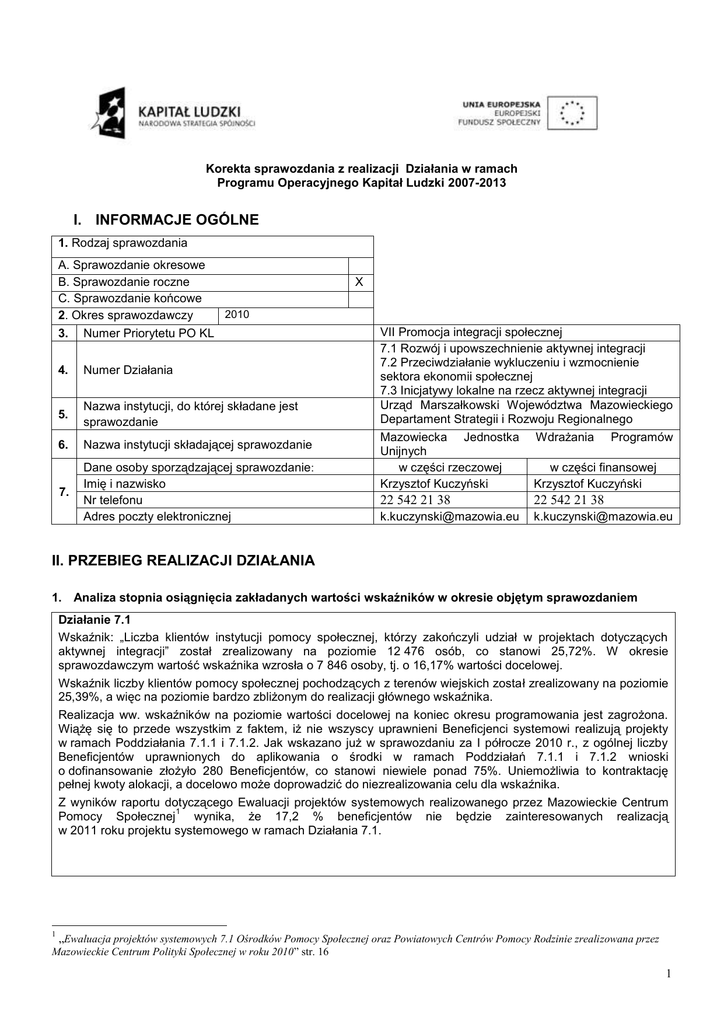 Korekta sprawozdania z realizacji Działania w ramach Programu Operacyjnego Kapitał Ludzki 2007-2013 I. INFORMACJE OGÓLNE 1. Rodzaj sprawozdania A. Sprawozdanie okresowe B. Sprawozdanie roczne C. Sprawozdanie końcowe 2. Okres sprawozdawczy X 2010 3. Numer Priorytetu PO KL 4. Numer Działania 5. Nazwa instytucji, do której składane jest sprawozdanie 6. Nazwa instytucji składającej sprawozdanie 7. Dane osoby sporządzającej sprawozdanie: Imię i nazwisko Nr telefonu Adres poczty elektronicznej VII Promocja integracji społecznej 7.1 Rozwój i upowszechnienie aktywnej integracji 7.2 Przeciwdziałanie wykluczeniu i wzmocnienie sektora ekonomii społecznej 7.3 Inicjatywy lokalne na rzecz aktywnej integracji Urząd Marszałkowski Województwa Mazowieckiego Departament Strategii i Rozwoju Regionalnego Mazowiecka Jednostka Unijnych w części rzeczowej Krzysztof Kuczyński Wdrażania Programów w części finansowej Krzysztof Kuczyński 22 542 21 38 22 542 21 38 [email protected] [email protected] II. PRZEBIEG REALIZACJI DZIAŁANIA 1. Analiza stopnia osiągnięcia zakładanych wartości wskaźników w okresie objętym sprawozdaniem Działanie 7.1 Wskaźnik: „Liczba klientów instytucji pomocy społecznej, którzy zakończyli udział w projektach dotyczących aktywnej integracji” został zrealizowany na poziomie 12 476 osób, co stanowi 25,72%. W okresie sprawozdawczym wartość wskaźnika wzrosła o 7 846 osoby, tj. o 16,17% wartości docelowej. Wskaźnik liczby klientów pomocy społecznej pochodzących z terenów wiejskich został zrealizowany na poziomie 25,39%, a więc na poziomie bardzo zbliżonym do realizacji głównego wskaźnika. Realizacja ww. wskaźników na poziomie wartości docelowej na koniec okresu programowania jest zagrożona. Wiążę się to przede wszystkim z faktem, iż nie wszyscy uprawnieni Beneficjenci systemowi realizują projekty w ramach Poddziałania 7.1.1 i 7.1.2. Jak wskazano już w sprawozdaniu za I półrocze 2010 r., z ogólnej liczby Beneficjentów uprawnionych do aplikowania o środki w ramach Poddziałań 7.1.1 i 7.1.2 wnioski o dofinansowanie złożyło 280 Beneficjentów, co stanowi niewiele ponad 75%. Uniemożliwia to kontraktację pełnej kwoty alokacji, a docelowo może doprowadzić do niezrealizowania celu dla wskaźnika. Z wyników raportu dotyczącego Ewaluacji projektów systemowych realizowanego przez Mazowieckie Centrum 1 Pomocy Społecznej wynika, że 17,2 % beneficjentów nie będzie zainteresowanych realizacją w 2011 roku projektu systemowego w ramach Działania 7.1. 1 „Ewaluacja projektów systemowych 7.1 Ośrodków Pomocy Społecznej oraz Powiatowych Centrów Pomocy Rodzinie zrealizowana przez Mazowieckie Centrum Polityki Społecznej w roku 2010” str. 16 1 Wskaźnik: „Liczba klientów instytucji pomocy społecznej objętych kontraktami socjalnymi w ramach realizowanych projektów” został zrealizowany na poziomie 12 992 osób, co stanowi 39,97 %. W okresie sprawozdawczym wartośc wskaźnika wzrosła o 9 478 osób. Realizacja wartości tego wskaźnika podlega tym samym zagrożeniom wykonania, jak wskaźnik „Liczba klientów instytucji pomocy społecznej, którzy zakończyli udział w projektach dotyczących aktywnej integracji” związanym z brakiem zainteresowania realizacją projektów wśród części ośrodków pomocy społecznej. Wskaźnik ten został już jednak zrealizowany w prawie 40% więc ryzyko jest stosunkowo niskie. Wskaźnik: „Liczba pracowników instytucji pomocy i integracji społecznej bezpośrednio zajmujących się aktywną integracją, którzy w wyniku wsparcia z EFS podnieśli swoje kwalifikacje w systemie pozaszkolnym” został zrealizowany na poziomie 2 915 pracowników, co stanowi 238,74 % realizacji. W okresie sprawozdawczym wartość wskaźnika wzrosła o 9 pracowników. Działanie 7.2 Wskaźnik: „Liczba osób zagrożonych wykluczeniem społecznym, które zakończyły udział w Działaniu” został zrealizowany na poziomie 3 893 osób, co stanowi 35,61 %. W okresie sprawozdawczym wartośc wskaźnika wzrosła skokowo o 3 265 osoby, tj. 29% wartości docelowej. Jednocześnie stopień certyfikacji wydatków kwalifikowalnych we wnioskach o płatność na poziomie IP2 wyniósł odpowiednio 23,57% dla Poddziałania 7.2.1 oraz 13% dla Poddziałania 7.2.2. Biorąc pod uwagę charakter wskaźnika i wynikający z niego sposób liczenia jego przyrostu na ostatnich etapach realizacji projektów, IP2 nie widzi w chwili obecnej zagrożenia dla osiągnięcia wartości docelowej określonej na koniec okresu realizacji programu. 2 Wskaźnik: „Liczba instytucji wspierających ekonomię społeczną, które otrzymały wsparcie w ramach Działania” zrealizowany został na poziomie 26 instytucji, co stanowi 866,66 % realizacji wskaźnika. Wartość wskaźnika po urealnieniu wzrosła w okresie sprawozdawczym o 12 instytucji. Wartość wskaźnika została znacznie przekroczona, a biorąc pod uwagę, że w ramach Poddziałanie 7.2.2 zakontraktowano 32,56% dostępnej alokacji istnieje potencjał do ponad dwukrotnego (po urealnieniu) wzrostu wskaźnika. Wskaźnik: „Liczba inicjatyw z zakresu ekonomii społecznej wspartych z EFS” został zrealizowany na poziomie 181 instytucji, co stanowi 754,17% realizacji wskaźnika. W okresie sprawozdawczym wartośc wskaźnika wzrosła po urealnieniu o 25 instytucji. Wartość docelowa wskaźnika jest niedoszacowana. Wskaźnik: „Liczba osób, które otrzymały wsparcie w ramach instytucji ekonomii społecznej” został zrealizowany na poziomie 2 832 osób, co stanowi 143,76 % realizacji założonego wskaźnika na poziomie 1 970 osób. W okresie sprawozdawczym wartośc wskaźnika wzrosła po urealnieniu o 1682 osoby. Wartość wskaźnika będzie rosła wraz z kontraktacją i certyfikacją pozostałej części alokacji. Działanie 7.3 Wskaźnik: „Liczba projektów wspierających rozwój inicjatyw na rzecz aktywizacji i integracji społeczności lokalnych” został zre
