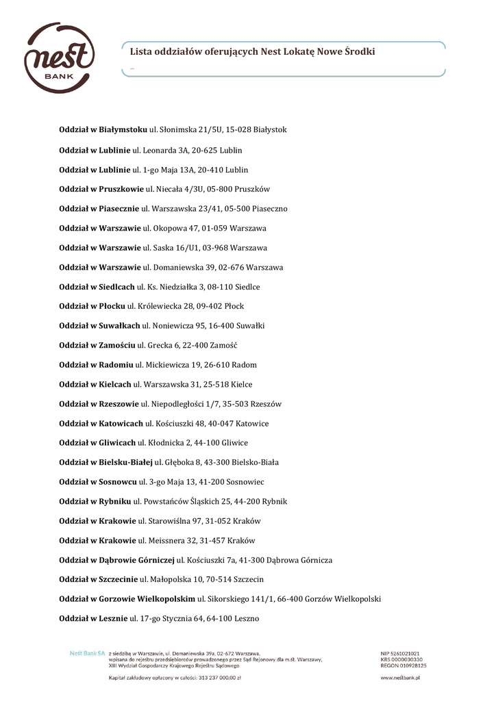 Lista oddziałów oferujących Nest Lokatę Nowe Środki D