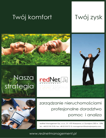 Twój komfort Twój zysk Nasza strategia zarządzanie nieruchomościami profesjonalne doradztwo pomoc i analiza redNet Management Sp. z o.o., 01- 470 Warszawa, ul. Dywizjonu 303 nr. 129b tel.: +48 22 318 72 00, fax: +48 22 318 72 10, [email protected] www.rednetmanagement.pl Szanowni Pa•stwo! Zdajemy sobie spraw', &e nie ma dwóch identycznych w#a"cicieli ani dwóch takich samych nieruchomo"ci. Dlatego zawsze s#uchamy naszych klientów i poznajemy ich cele. Nast'pnie opracowujemy biznesplany i podejmujemy decyzje, które pozwolaj$ nam osi$gn$% zamierzone rezultaty. Obs#uga nieruchomo"ci wymaga nieustannego poszukiwania nowych metod kontroli kosztów przy jednoczesnym ci$g#ym podnoszeniu warto"ci nieruchomo"ci. Staramy si' przy tym utrzymywa% najwy&szy poziomu satysfakcji w#a"cicieli nieruchomo"ci oraz najemców. Mam prawdziw• przyjemno•• zaprezentowa• Pa•stwu •rm• redNet Management Sp. z o.o. oraz przedstawi• jej us!ugi w zakresie zarz•dzania nieruchomo•ciami. Nasi specjali"ci przygotowuj$ projekty rocznych bud&etów dla ka&dej nieruchomo"ci, co umo&liwia klientom poznanie przewidywanych kosztów za- Jeste"my spó#k$ dzia#aj$c$ w ramach redNet rz$dzania nieruchomo"ci$, wydatków sta#ych oraz Property Group. Korzystamy z wiedzy i do- prognozowanych zysków. Ka&dy z naszych klientów "wiadczenia ca#ej Grupy. Zostali"my powo#ani ma mo&liwo"% skonsultowania si' w ka&dej chwili jako oddzielna spó#ka, aby zarz$dza% nierucho- z naszymi specjalistami w zakresie administrowania, mo"ciami (osiedlami i domami). zarz$dzania oraz utrzymania nieruchomo"ci. Naszym celem jest zapewnienie ka&dej nieruchomo"ci najwy&szej klasy obs#ugi, przy jedno- Elastyczno"% i innowacyjno"% w zarz$dzaniu nieruchomo"ciami – to nasza specjalno"%. czesnym utrzymywaniu ponoszonych kosztów na jak najni&szym poziomie. Z powa&aniem redNet Management dzia#a na rynku nieruchomo"ci ju& od wielu lat. Ka°o roku poszerzamy nasz$ ofert' dostosowuj$c j$ do stale zmieniaj$cych si' i rosn$cych wymogów rynku. – Iwona Janus W naszej pracy pos#ugujemy si' sprawdzonymi prezes Zarz$du i efektywnymi metodami oraz optymalnie dobranymi narz'dziami. Ksi'gowo"% Ksi'gowo"% jest jednym z kluczowych i naj- przypominaj$c mailowo i telefonicznie o uregulo- bardziej skomplikowanych elementów zarz$- waniu zad#u&enia, jak równie& twardej – poprzez dzania wspólnot$ mieszkaniow$. Dobrze, je"li wezwania do zap#aty, post'powanie s$dowe jest prowadzona przez wyspecjalizowan$ *rm'. i egzekucj' komornicz$. Takie rozwi$zanie jest bezpieczne i gwarantuje, &e wszystkie czynno"ci wykonywane b'd$ profe- Zapewniamy: sjonalnie i w zgodzie z obowi$zuj$cymi przepisa- § ewidencj' wp#at zaliczek; mi *nansowo-ksi'gowymi. § ewidencj' wydatków zwi$zanych z utrzymaniem cz'"ci wspólnych; § analiz' wp#ywów i wydatków; Nowoczesne oprogramowanie ksi'gowe, z któ- § doradztwo w zakresie optymalizacji wydatków; rego korzystamy, gwarantuje dok#adno"% rozlicze•, § przygotowanie okresowych raportów obrazuj$cych stan rozlicze• *nansowych; u#atwia ich poprawne raportowanie oraz umo&liwia § e-kartotek'. cz#onkom wspólnoty bie&$cy dost'p do ich kont za po"rednictwem tzw. e-kartoteki. Wa&n$ i delikatn$ kwesti$ jest równie& windykacja zaleg#ych p#atno"ci od cz#onków wspólnoty. Stosujemy metody tzw. windykacji mi'kkiej, 1 Administrowanie W ramach us#ugi zapewniamy pe#n$ obs#u- Jednocze"nie sprawowany jest bie&$cy nad- g' administracyjn$ nieruchomo"ci lub osiedla. zór nad realizacj$ zada• wynikaj$cych z za- Wykonywane s$ wszelkie czynno"ci zapew- wartych umów. Prowadzona jest równie& niaj$ce sprawne funkcjonowanie obiektu, ewidencja zu&ycia mediów (wody, energii m.in. zawieranie umów zwi$zanych z prawi- elektrycznej, gazu, itd.) wraz z okresow$ d#owym funkcjonowaniem nieruchomo"ci, kontrol$ wskaza• urz$dze• pomiarowych. tj. umów zwi$zanych z dostaw$ mediów, us#u- Pilnowane s$ tak&e okresy ubezpieczenia gami porz$dkowymi, us#ugami technicznymi itp. obiektu od zdarze• losowych, kradzie&y i in. Sprawujemy ca#o"ciowy nadzór nad stanem technicznym nieruchomo"ci. Zakres naszych obowi$zków obejmuje tak&e identy*kacj' usterek, czyli ogólny nadzór na stanem technicznym o"wietlenia, domofonów, posadzek, drzwi wej"ciowych do budynku, drzwi wewn'trznych, "cian itp. 2 Sprz$tanie terenu nieruchomo"ci Jednym z elementów komfortu i wizerunku osiedla jest efektywne organizowanie prac porz•dkowych i utrzymania czysto•ci. Naszym zadaniem jest dbanie o czysto•• i porz•dek budynków mieszkalnych oraz najbli"szego otoczenia. Us!uga polega na utrzymaniu czysto•ci cz••ci wspólnych budynków mieszkalnych wspólnoty mieszkaniowej oraz przylegaj•cego terenu zewn•trznego wraz z terenem zielonym. Przy realizacji us#ug stosujemy w#asny park ma- Staramy si', aby zakres i cz'stotliwo"% prac wy- szyn oraz markowe "rodki chemiczne, przyjazne chodzi#y naprzeciw potrzebom i oczekiwaniom "rodowisku. Do sprz$tania maszynowego i do mieszka•ców. Naszym biznesowym celem jest mycia r'cznego wykorzystujemy sprz't reno- "wiadczenie wysokiej jako"ci us#ug, wykonywanych mowanych *rm: Comac, Fimap, Numatic, Taski, rzetelnie i z najwy&sz$ zawodow$ staranno"ci$. Filmop, RCM. W celu zapewnienia w#a"ciwej jako"ci us#ug sprawujemy sta#y nadzór nad naszymi pracownikami. Kierownik, który kontroluje wykonanie prac, na bie&$co zg#asza równie& usterki zauwa&one na terenie osiedla. Zapewnia on te& sta#y kontakt z serwisem sprz$taj$cym. 3 Zarz$dzanie wspólnot$ mieszkaniow$ W ramach obs!ugi oferujemy realizacj• wybranych lub kompleksowych us!ug, niezb•dnych dla prawid!owego funkcjonowania wspólnoty – w zale"no•ci od potrzeb zleceniodawcy. KSI+GOWO/0 I ADMINISTROWANIE W ramach obs!ugi zapewniamy m.in.: § ewidencj' wp#at zaliczek oraz ewidencj' wydatków; § analiz' wp#ywów i wydatków; § doradztwo w zakresie optymalizacji kosztów; § przygotowanie okresowych raportów *nansowych; § e-kartotek' (dost'p dla mieszka•ców do ich kont popr