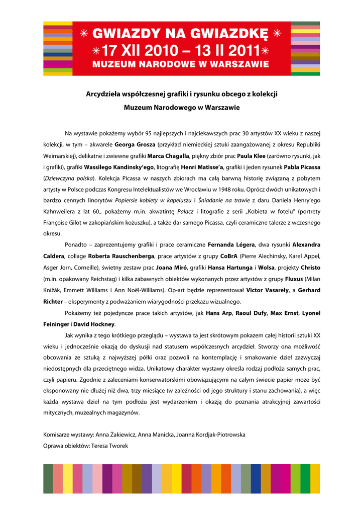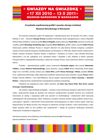 Arcydzieła współczesnej grafiki i rysunku obcego z kolekcji Muzeum Narodowego w Warszawie Na wystawie pokażemy wybór 95 najlepszych i najciekawszych prac 30 artystów XX wieku z naszej kolekcji, w tym – akwarele Georga Grosza (przykład niemieckiej sztuki zaangażowanej z okresu Republiki Weimarskiej), delikatne i zwiewne grafiki Marca Chagalla, piękny zbiór prac Paula Klee (zarówno rysunki, jak i grafiki), grafiki Wassilego Kandinsky’ego, litografię Henri Matisse’a, grafiki i jeden rysunek Pabla Picassa (Dziewczyna polska). Kolekcja Picassa w naszych zbiorach ma całą barwną historię związaną z pobytem artysty w Polsce podczas Kongresu Intelektualistów we Wrocławiu w 1948 roku. Oprócz dwóch unikatowych i bardzo cennych linorytów Popiersie kobiety w kapeluszu i Śniadanie na trawie z daru Daniela Henry’ego Kahnweilera z lat 60., pokażemy m.in. akwatintę Palacz i litografie z serii „Kobieta w fotelu” (portrety Françoise Gilot w zakopiańskim kożuszku), a także dar samego Picassa, czyli ceramiczne talerze z wczesnego okresu. Ponadto – zaprezentujemy grafiki i prace ceramiczne Fernanda Légera, dwa rysunki Alexandra Caldera, collage Roberta Rauschenberga, prace artystów z grupy CoBrA (Pierre Alechinsky, Karel Appel, Asger Jorn, Corneille), świetny zestaw prac Joana Miró, grafiki Hansa Hartunga i Wolsa, projekty Christo (m.in. opakowany Reichstag) i kilka zabawnych obiektów wykonanych przez artystów z grupy Fluxus (Milan Knížák, Emmett Williams i Ann Noël-Williams). Op-art będzie reprezentował Victor Vasarely, a Gerhard Richter – eksperymenty z podważaniem wiarygodności przekazu wizualnego. Pokażemy też pojedyncze prace takich artystów, jak Hans Arp, Raoul Dufy, Max Ernst, Lyonel Feininger i David Hockney. Jak wynika z tego krótkiego przeglądu – wystawa ta jest skrótowym pokazem całej historii sztuki XX wieku i jednocześnie okazją do dyskusji nad statusem współczesnych arcydzieł. Stworzy ona możliwość obcowania ze sztuką z najwyższej półki oraz pozwoli na kontemplację i smakowanie dzieł zazwyczaj niedostępnych dla przeciętnego widza. Unikatowy charakter wystawy określa rodzaj podłoża samych prac, czyli papieru. Zgodnie z zaleceniami konserwatorskimi obowiązującymi na całym świecie papier może być eksponowany nie dłużej niż dwa, trzy miesiące (w zależności od jego struktury i stanu zachowania), a więc każda wystawa dzieł na tym podłożu jest wydarzeniem i okazją do poznania atrakcyjnej zawartości mitycznych, muzealnych magazynów. Komisarze wystawy: Anna Żakiewicz, Anna Manicka, Joanna Kordjak-Piotrowska Oprawa obiektów: Teresa Tworek