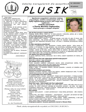 Szkolny nieregularnik dla wszystkich PLUSIK Dzień dobry, Minęła jesień, nadeszła zima… A „Plusika” jak ni ma, tak ni ma… No, faktycznie, z dużym opóźnieniem pojawiamy się w tym roku, ale też usprawiedliwia nas nasz nadtytuł: „Nieregularnik”. Mam nadzieję, że ten pierwszy numer tegoroczny przyjmiecie ciepło i włączycie się do redagowania. Im więcej nas będzie, tym weselej. Proszę wszystkich, którzy piszą, chcą się tym pisaniem dzielić o kontakt ze mną. Najczęściej jestem w sali 201. A dzisiejszy numer, jak przystało, poświęcamy w dużej części Świętom Bożego Narodzenia. Polecam Wam wywiadzik z Panią Moniką. Mam też wiele pięknych tekstów, które pojawiły się wcześniej i czekały na publikację. Jak zwykle – są też zagadki i krzyżówki. Prezentujemy też klasę VID – zdjęcie, bo jak się okazało, jeszcze nie gościła na naszych łamach. Zapraszam więc do lektury. Zachęcam do współpracy. Wszystkim życzę pięknych i spokojnych Świąt. Jolanta Makuch Dlaczego jest święto Bożego Narodzenia? Dlaczego wpatrujemy się w gwiazdę na niebie? Dlaczego śpiewamy kolędy? Dlatego, żeby się uczyć miłości do Pana Jezusa. Dlatego, żeby podawać sobie ręce. Dlatego, żeby się uśmiechać do siebie. Dlatego, żeby sobie przebaczać. ks. Jan Twardowski Nr 1/2012/2013 Rok piętnasty ... Spotkanie wszystkich członków rodziny przy jednym, wielkim świątecznym stole. To byłby najpiękniejszy prezent, jaki mogę sobie wyobrazić… nieduży wywiadzik z Panią Moniką Cegłowską, która pracuje w naszym sklepiku Jak się Pani pracuje w naszej szkole? Dziękuję, bardzo dobrze. Dzieci są w miarę grzeczne i kulturalne, jednak, jak w każdej szkole, bywają różne sytuacje, czasem lepsze czasem gorsze. Co jest najtrudniejsze w Pani pracy? Różnie wygląda praca z dziećmi… Ja jednak pracuję z nimi tylko 10, góra 15 minut, więc jakoś wytrzymuję . Nie powiem jednak, że nigdy nie straciłam cierpliwości i właśnie cierpliwość jest najbardziej potrzebną cechą do pracy z młodzieżą (przynajmniej według mnie). Co daje największą satysfakcję? Pracując w podstawówce, mam odczynienia z bardzo małymi dziećmi , które nawet nie wiedzą, co ile kosztuje i ile mają pieniędzy, więc przychodzą, wykładają pieniążki i pytają : proszę pani, a co mogę za to??? Jeśli mają większą sumę, to mówię im, co mogą kupić i uciekają , jednak są też takie, którym starczy tylko na cukierka. Ale kiedy zobaczą tego cukierka, to mają takie uśmiechnięte i radosne oczy i to jest to, co najbardziej lubię u dzieci . Taka radość dzieci niby z niczego jest największą satysfakcją !!! Jak spędza Pani Boże Narodzenie? W gronie najbliższej rodziny, zazwyczaj u nas w domu, czasem wyjeżdżamy do rodziny, do Rzeszowa. Które potrawy Pani lubi najbardziej spośród tradycyjnych? Barszczyk z uszkami i bigos staropolski. Jak ozdabia Pani swoją choinkę? Przede wszystkim ozdobami wykonanymi ręcznie, sama przygotowuje ozdoby, które zawieszam na choince. Staram się, żeby ozdoby były urozmaicone. Najciekawsze wspomnienie bożonarodzeniowe. Święta u babci ze wszystkim bliskimi, pierwsza gwiazdka i prezenty od dziadków pod choinką dla każdego. Wymarzony prezent pod choinkę. Spotkanie wszystkich członków rodziny przy jednym, wielkim świątecznym stole. To byłby najpiękniejszy prezent, jaki mogę sobie wyobrazić. O co poprosiłaby Pani złotą rybkę? O spełnienie moich 3 marzeń, oczywiście!!! Kiedyś nawet rozmawiałam z 4 klasą na temat marzeń i pytali mnie, o czym marzę, więc powiedziałam, że chcę czerwone ferrari. Chłopcy obiecali, że mi taki „załatwią” i rzeczywiście, dwa dni później przybiegli i mówią, że mają dla mnie mój wymarzony samochód!!! Było ferrari!!!! Czerwone!!!! Tylko takie malutkie, taki resorek !!!!!! Hahahaha!!!! Dużo Pani czyta. Jakie książki lubi Pani najbardziej? O tak, dużo. Moja praca to umożliwia, ale czytam także w domu, jeśli tylko czas mi na to pozwala. Do moich ulubionych zaliczają się oczywiście romanse , ale lubię też książki przygodowe, historyczne i popularno-naukowe. Jednak jeśli mam do wyboru, to oczywiście dobry romans, bujany fotel, ciepły kominek . Mini ankieta Ulubione danie gnocchi z sosem pomidorowym i dużą ilością parmezanu albo smażony łosoś. Ulubiony film: „Kac Vegas w Bangkoku”, „Uprowadzona” , „Zły skręt”, ale kocham też bajki „Pingwiny z Madagaskaru” , „Epoka lodowcowa” , „Skok przez płot”. Ulubiony zespół/wykonawca muzyczny: Kiedyś lubiłam Kalibra, Paktofonikę, a dziś jeśli słucham muzyki to albo w radiu, albo w TV, więc słucham, co tam leci …. Kolor: czarny, biały i wszystkie odcienie brązu Dziękujemy pięknie i życzymy spełnienia marzeń w Nowym Roku Plusik, szkolny nieregularnik dla wszystkich, nr1/2012/2013, 20 XII 2012 r. DO POCZYTANIA Wita Was klasa VI D z wychowawczynią Przysłowia na Boże Narodzenie i Nowy Rok: Gdy w dzień Adama i Ewy mróz i pięknie, zima wcześnie pęknie. Jakiś w Wigilię, takiś cały rok. Jak w Wigilię z dachu ciecze, jeszcze się zima długo się powlecze. Nowy Rok pogodny - zbiór będzie dorodny. Na pasterkę po wodzie, rezurekcja po lodzie. Nowy Rok jaki, cały rok taki. Trochę o tradycjach Bożego Narodzenia (wyszukane w Internecie) Zanim jednak rozpoczną się święta większość z nas wysyła najbliższym osobom, znajomym, czy krewnym świąteczne kartki. Pierwszą taką kartkę z życzeniami z okazji świąt Bożego Narodzenia wysłał w 1842 r. szesnastoletni londyński artysta, William Maw Egley. Z każdym kolejnym rokiem pomysł nastolatka zyskiwał większą popularność. W Polsce kartki świąteczne pojawiły się pod koniec XIX w., najwcześniej Słowo "wigilia" pochodzi z języka łacińskiego i oznacza na terenie Galicji. czuwanie. Taki był dawniej zwyczaj w Kościele, ze Obecnie coroczna produkcja karte