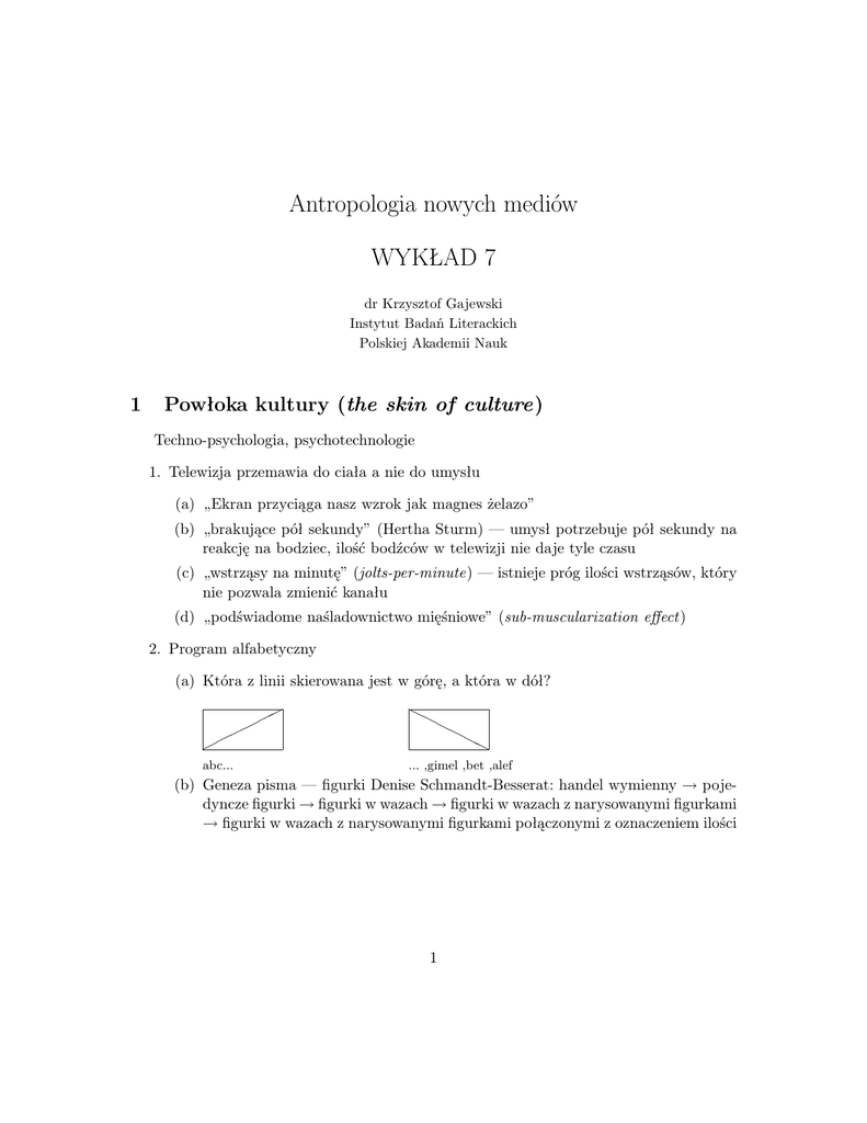Antropologia nowych mediów WYKŁAD 7 dr Krzysztof Gajewski Instytut Badań Literackich Polskiej Akademii Nauk 1 Powłoka kultury (the skin of culture) Techno-psychologia, psychotechnologie 1. Telewizja przemawia do ciała a nie do umysłu (a) „Ekran przyciąga nasz wzrok jak magnes żelazo” (b) „brakujące pół sekundy” (Hertha Sturm) — umysł potrzebuje pół sekundy na reakcję na bodziec, ilość bodźców w telewizji nie daje tyle czasu (c) „wstrząsy na minutę” (jolts-per-minute) — istnieje próg ilości wstrząsów, który nie pozwala zmienić kanału (d) „podświadome naśladownictwo mięśniowe” (sub-muscularization effect) 2. Program alfabetyczny (a) Która z linii skierowana jest w górę, a która w dół? abc... HH HH HH ... ,gimel ,bet ,alef (b) Geneza pisma — figurki Denise Schmandt-Besserat: handel wymienny → pojedyncze figurki → figurki w wazach → figurki w wazach z narysowanymi figurkami → figurki w wazach z narysowanymi figurkami połączonymi z oznaczeniem ilości 1 Antropologia nowych mediów (c) Kierunek pisma a mózg alfabety bezsamogłoskowe np. alfabety semickie od prawej do lewej brzemienie i znaczenie ciągów liter zależne od kontekstu kształt analiza alfabety ściśle fonetyczne alfabety ściśle fonetyczne od lewej do prawej jednoznaczne dekodowanie brzmienia kolejność synteza (d) Alfabet doprowadził do wynalezienia perspektywy, czyli umieszczenia czasu w przestrzeni — renesansowa perspektywa była wynalazkiem, a nie odkryciem (Leon Battista Alberti) 3. Słuch oralny a słuch pisemny (a) uwolnienie od tyranii oka: zamknąć oczy na zatłoczonej imprezie towarzyskiej: ile rozmów można śledzić jednocześnie? To samo z otwartymi oczyma. i. wzrok pobiera kilkanaście razy więcej energii psychicznej niż słuch ii. wzrokiem łatwiej i szybciej można przyswajać informacje (b) słuchać, słyszeć — patrzeć, widzieć, zobaczyć, oglądać, dostrzec, obserwować, gapić się, spostrzegać, spozierać, spoglądać (c) kobiety słyszą lepiej niż mężczyźni (próg słyszalności od 1 dB niższy), mężczyźni mają lepszy wzrok 4. Inteligencja zbiorowa (collective intelligence) (a) Ewolucja inteligencji idzie w parze z rozwojem techniki (b) Pismo pozwala odłączyć dźwięki od osób i manipulować dźwiękami — przechowywać je (c) W kulturze oralnej język kontroluje ludzi i ich zachowania, w kulturze piśmiennej ludzie panują nad językiem. (d) Pisma ściśle fonetyczne pozwalają na precyzyjniejsze użycie języka niż pisma spółgłoskowe; te są pomocnikami pamięci, a tamte narzędziami myślenia. (e) Pamiętnik pozwala na zdefiniowanie swego kontaktu z rzeczywistością i swego punktu widzenia, jest lustrem inteligencji. (f) Pieniądze — jedno z ważniejszych narzędzi ludzkiej inteligencji: uniwersalny język, na który można przetłumaczyć większość dóbr i usług. Technologie informatyczne w edukacji i w organizacjach pozarządowych 2 Antropologia nowych mediów Morał de Kerckhove’a Najlepszą obroną przed psychotechnologiami, które chciałyby zmienić nas we własne przedłużenia jest włączenie ich samych w naszę osobistą psychikę. Tworzy się nowy rodzaj ludzki. Derrick de Kerckhove, Powłoka kultury. Odkrywanie nowej elektronicznej rzeczywistości, (1995) 2 Inteligencja otwarta (connected ) 1. Refutacja inteligencji zbiorowej na rzecz inteligencji otwartej (connected ), por. collective intelligence (Pierre Lévy) 2. Sieć daje dostęp do inteligencji otwartej 3. Interaktywność + Hipertekst + Komunikacyjność = Inteligencja otwarta (a) Interaktywność to dotyk i. Interaktywność pojawiła się z wynalezieniem koła, ale rozwita wraz z komputeryzacją, gdyż komputer nie jest tylko rozszerzeniem ciała, ale staje się agentem ii. Cyborgizacja, bionizm: interfejs atakuje ciało i zmysł dotyku (b) Hipertekst przekształca pamięć jednego człowieka w pamięć wszystkich ludzi, Sieć jest pamięcią ogólnoświatową (c) Komunikacyjność — nie tylko pozwala, ale zachęca do wkładu jednostek w zbiorowe medium, prowokując działania zbiorowe; książki sprzyjają rozwojowi indywidualizmu i pozbawione są otwartości 4. Kolaboratorium: warsztat inteligencji otwartej Derrick de Kerckhove, Inteligencja otwarta. Narodziny społeczeństwa sieciowego, (1997) Literatura [1] Derrick de Kerckhove, Powłoka kultury. Odkrywanie nowej elektronicznej rzeczywistości, przeł. W. Sikorski, P. Nowakowski, Warszawa 1996. [2] Derrick de Kerckhove, Inteligencja otwarta. Narodziny społeczeństwa sieciowego, przeł. A. Hildebrandt, R. Glegoła, Warszawa 2001. Technologie informatyczne w edukacji i w organizacjach pozarządowych 3