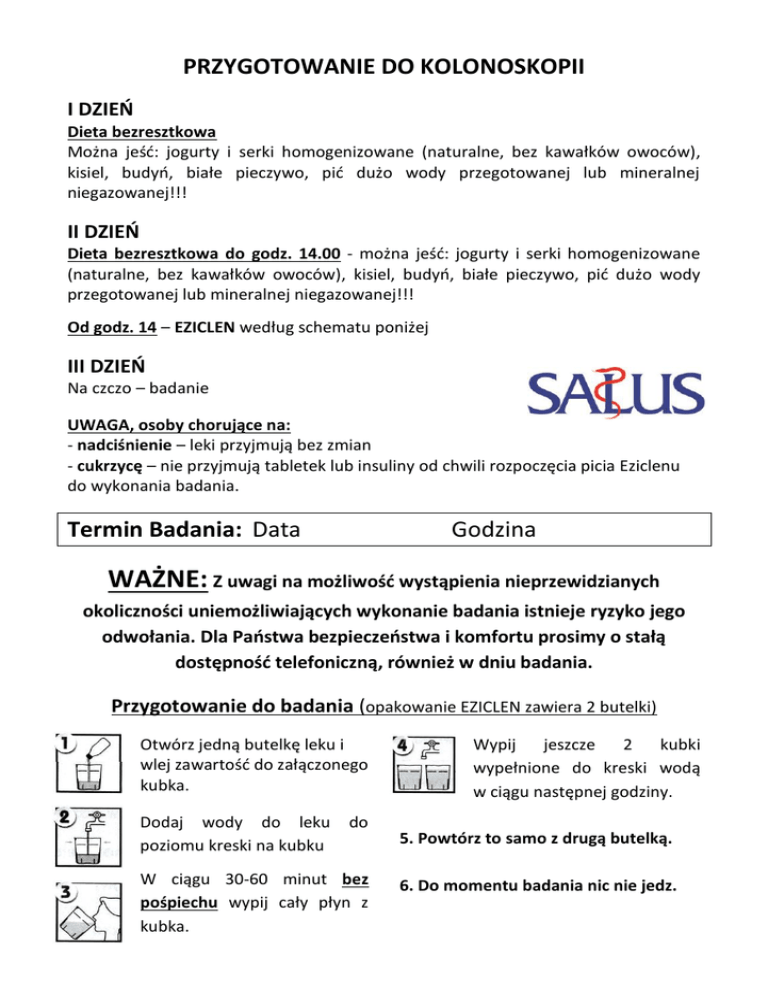 PRZYGOTOWANIE DO KOLONOSKOPII I DZIEŃ Dieta bezresztkowa Można jeść: jogurty i serki homogenizowane (naturalne, bez kawałków owoców), kisiel, budyń, białe pieczywo, pić dużo wody przegotowanej lub mineralnej niegazowanej!!! II DZIEŃ Dieta bezresztkowa do godz. 14.00 - można jeść: jogurty i serki homogenizowane (naturalne, bez kawałków owoców), kisiel, budyń, białe pieczywo, pić dużo wody przegotowanej lub mineralnej niegazowanej!!! Od godz. 14 – EZICLEN według schematu poniżej III DZIEŃ Na czczo – badanie UWAGA, osoby chorujące na: - nadciśnienie – leki przyjmują bez zmian - cukrzycę – nie przyjmują tabletek lub insuliny od chwili rozpoczęcia picia Eziclenu do wykonania badania. Termin Badania: Data Godzina WAŻNE: Z uwagi na możliwość wystąpienia nieprzewidzianych okoliczności uniemożliwiających wykonanie badania istnieje ryzyko jego odwołania. Dla Państwa bezpieczeństwa i komfortu prosimy o stałą dostępność telefoniczną, również w dniu badania. Przygotowanie do badania (opakowanie EZICLEN zawiera 2 butelki) Otwórz jedną butelkę leku i wlej zawartość do załączonego kubka. Dodaj wody do leku poziomu kreski na kubku do W ciągu 30-60 minut bez pośpiechu wypij cały płyn z kubka. Wypij jeszcze 2 kubki wypełnione do kreski wodą w ciągu następnej godziny. 5. Powtórz to samo z drugą butelką. 6. Do momentu badania nic nie jedz.