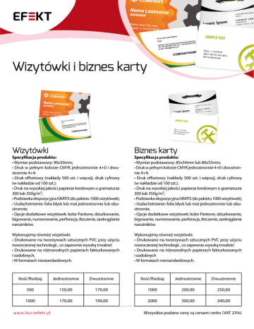 Wizytówki i biznes karty Wizytówki Biznes karty Specyfikacja produktu: • Wymiar podstawowy: 90x50mm; • Druk w pełnym kolorze CMYK jednostronnie 4+0 i dwustronnie 4+4; • Druk offsetowy (nakłady 500 szt. i więcej), druk cyfrowy (w nakładzie od 100 szt.); • Druk na wysokiej jakości papierze kredowym o gramaturze 300 lub 350g/m²; • Podstawka ekspozycyjna GRATIS (do pakietu 1000 wizytówek); • Uszlachetnienie: folia błysk lub mat jednostronnie lub obustronnie; • Opcje dodatkowe wizytówek: kolor Pantone, dziurkowanie, bigowanie, numerowanie, perforacja, tłoczenie, zaokrąglanie narożników. Specyfikacja produktu: • Wymiar podstawowy: 85x54mm lub 80x55mm; • Druk w pełnym kolorze CMYK jednostronnie 4+0 i dwustronnie 4+4; • Druk offsetowy (nakłady 500 szt. i więcej), druk cyfrowy (w nakładzie od 100 szt.); • Druk na wysokiej jakości papierze kredowym o gramaturze 300 lub 350g/m²; • Podstawka ekspozycyjna GRATIS (do pakietu 1000 wizytówek); • Uszlachetnienie: folia błysk lub mat jednostronnie lub obustronnie; • Opcje dodatkowe wizytówek: kolor Pantone, dziurkowanie, bigowanie, numerowanie, perforacja, tłoczenie, zaokrąglanie narożników. Wykonujemy również wizytówki: • Drukowane na tworzywach sztucznych PVC przy użyciu nowoczesnej technologii , co zapewnia wysoką trwałość • Drukowane na różnorodnych papierach fakturkowanych i ozdobnych, • W formatach niestandardowych. Wykonujemy również wizytówki: • Drukowane na tworzywach sztucznych PVC przy użyciu nowoczesnej technologii , co zapewnia wysoką trwałość • Drukowane na różnorodnych papierach fakturkowanych i ozdobnych • W formatach niestandardowych. Ilość/Rodzaj Jednostronne Dwustronne Ilość/Rodzaj Jednostronne Dwustronne 500 150,00 170,00 1000 200,00 250,00 1000 170,00 190,00 2000 300,00 340,00 www.biuroefekt.pl Wszystkie podane ceny są cenami netto (VAT 23%)