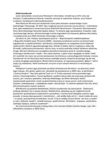 Rafał Szamburski autor opowiadao, scenariuszy filmowych i dramatów. Urodził się w 1971 roku we Wrześni. Z wykształcenia historyk, mieszka i pracuje w rodzinnym mieście; uczy historii w jednej z tamtejszych szkół podstawowych. Mieszkaocom Wrześni jest doskonale znany jako animator amatorskiego ruchu teatralnego i filmowego. W 2007 roku mogło go poznad znacznie szersze grono – miłośników kina, jako współautora scenariusza (wraz Robertem Bruttnerem i Tomaszem Wiszniewskim) filmu Wiszniewskiego Wszystko będzie dobrze. To właśnie jego opowiadanie, Pawełek, stało się kanwą tego obrazu, uhonorowanego trzema nagrodami (za reżyserię, główną rolę męską i muzykę) przez jury XXXII Festiwalu Filmowego w Gdyni. Zarówno to, jak i kolejne opowiadanie pisarza – Wypracowanie nadobowiązkowe z Bogumiła Hrabala (wyd. Września 2009) – dowodzą wrażliwości autora na dramat ludzi zagubionych w społeczeostwie i samotnych, pozostających na marginesie życia lokalnych społeczności, bliskich egzystencjalnego dna. Jednak to ludzie, którzy znajdują w sobie siłę do walki i pokonania przeciwności, którzy chcą i w koocu potrafią znaleźd każdemu właściwą drogę. Siłą tych tekstów jest szczególna atmosfera kreowana przez R. Szamburskiego, emanująca serdecznośd i ciepło – lecz także dystans, z jakim autor spogląda na świat i ludzi. Ich czytelnik nie może się ustrzec porównaniu tej literatury z prozą Bogumiła Hrabala; zresztą Szamburski nie tai fascynacji twórczością czeskiego pisarza, otwarcie przyznając się do niej w tytule drugiego opowiadania. Można domniemywad, że najnowszą powieśd, Bękart – która ukaże się niebawem, Rafał Szamburski utrzyma w tym samym klimacie co wcześniejsze utwory. Odrębnym nurtem jego pisarstwa są teksty dramatyczne dla teatru. Już pierwszy utwór tego rodzaju, Wir gehen, gehen wir, doczekał się wystawienia w 2000 roku, w berlioskim „Teatrze Kreatur”. Dwa lata później Teatr im. A. Fredry wystawił czarną komedię tego autora, Przed pogrzebem. Tamto spotkanie z publicznością stało się inspiracją zarówno dla autora, jak i reżysera spektaklu, Andrzeja Malickiego: po blisko dziesięciu latach zaowocowało powrotem sztuki na gnieźnieoską scenę w nowej wersji i pod zmienionym tytułem, rozbudowanej o dodatkowe wątki i aktualizacje. To właśnie spektakl Cha-cha, który dziś prezentujemy naszym widzom. Bohaterami są paostwo Nowakowie, którym przydarzyło się nieszczęście . Zaskoczeni, próbują odnaleźd się w nowej sytuacji. Wielokrotnie odwołują się do tragikomicznych porównao i groteskowych wspomnieo z przeszłości. Z komicznych dialogów wyziera naga prawda o naszej obyczajowości i mentalności. „ Jak wódka była od 13 – mówi matka do syna – to ojciec, przynajmniej od południa nie pił. A teraz wódkę można dostad od rana, a nawet w nocy. Żadnych zasad!!! Upadła komuna, upadł dramat. Wchodzisz , kupujesz, wychodzisz, żadnego napięcia, żadnych oczekiwao”. Na sceniczną konkretyzację czekają także inne dramaty Rafała Szamburskiego: Lipa, Akt i Odwiedziny (wydane w 2003 roku).