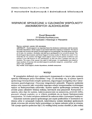 wyraźnie widoczna (l). Rola Wspólnoty Anonimowych Alkoholików jako skutecznego źródła wsparciajest szeroko omawiana (10, 15, 12). Znalazło to potwierdzenie