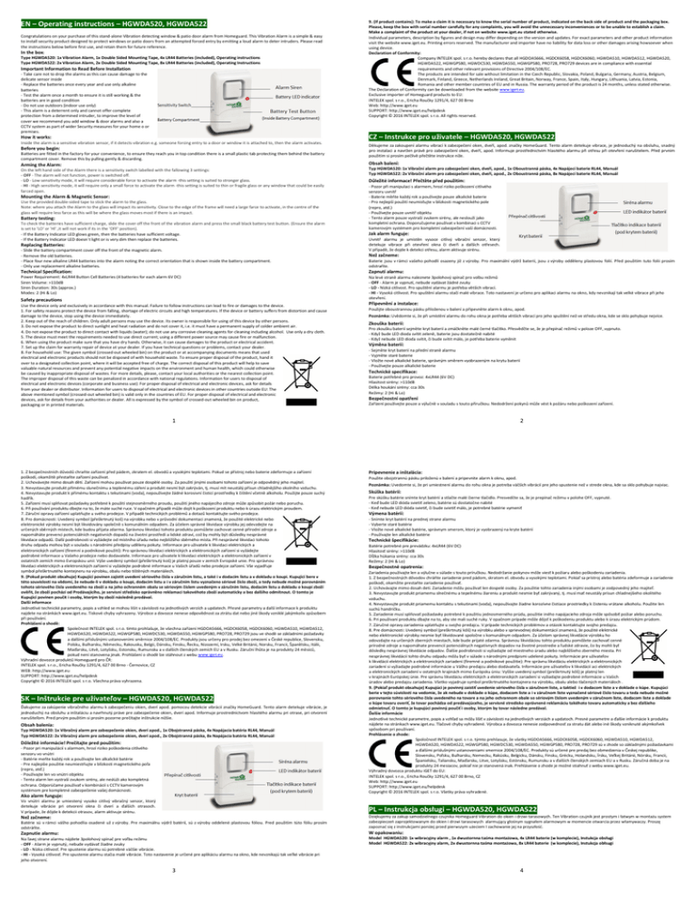 EN – Operating instructions – HGWDA520, HGWDA522 Congratulations on your purchase of this stand-alone Vibration detecting window & patio door alarm from Homeguard. This Vibration Alarm is a simple & easy to install security product designed to protect windows or patio doors from an attempted forced entry by emitting a loud alarm to deter intruders. Please read the instructions below before first use, and retain them for future reference. In the box: Type HGWDA520: 1x Vibration Alarm, 1x Double Sided Mounting Tape, 4x LR44 Batteries (included), Operating instructions Type HGWDA522: 2x Vibration Alarm, 2x Double Sided Mounting Tape, 8x LR44 Batteries (included), Operating Instructions Important Information to Read Before Installation - Take care not to drop the alarms as this can cause damage to the delicate sensor inside - Replace the batteries once every year and use only alkaline batteries - Test the alarm once a month to ensure it is still working & the batteries are in good condition - Do not use outdoors (indoor use only) - This alarm is a deterrent only and cannot offer complete protection from a determined intruder, to improve the level of cover we recommend you add window & door alarms and also a CCTV system as part of wider Security measures for your home o or premises. 9. (If product contains): To make a claim it is necessary to know the serial number of product, indicated on the back side of product and the packaging box. Please, keep the box with serial number carefully for any complaints, you will avoid the unnecessary inconveniences or to be unable to establish a claim. Make a complaint of the product at your dealer, if not on website www.iget.eu stated otherwise. Individual parameters, description by figures and design may differ depending on the version and updates. For exact parameters and other product information visit the website www.iget.eu. Printing errors reserved. The manufacturer and importer have no liability for data loss or other damages arising howsoever when using device. Declaration of Conformity: Company INTELEK spol. s r.o. hereby declares that all HGDOA5666, HGDCK6058, HGDCK6060, HGWDA510, HGWDA512, HGWDA520, HGWDA522, HGWGP580, HGWDC530, HGWDA550, HGWGP580, PRO728, PRO729 devices are in compliance with essential requirements and other relevant provisions of Directive 2004/108/EC. The products are intended for sale without limitation in the Czech Republic, Slovakia, Poland, Bulgaria, Germany, Austria, Belgium, Denmark, Finland, Greece, Netherlands Ireland, Great Britain, Norway, France, Spain, Italy, Hungary, Lithuania, Latvia, Estonia, Romania and other member countries of EU and in Russia. The warranty period of the product is 24 months, unless stated otherwise. The Declaration of Conformity can be downloaded from the website www.iget.eu. Exclusive importer of Homeguard products to EU: INTELEK spol. s r.o., Ericha Roučky 1291/4, 627 00 Brno Web: http://www.iget.eu SUPPORT: http://www.iget.eu/helpdesk Copyright © 2016 INTELEK spol. s r.o. All rights reserved. CZ – Instrukce pro uživatele – HGWDA520, HGWDA522 How it works: Inside the alarm is a sensitive vibration sensor, if it detects vibration e.g. someone forcing entry to a door or window it is attached to, then the alarm activates. Before you begin: Batteries are fitted in the factory for your convenience, to ensure they reach you in top condition there is a small plastic tab protecting them behind the battery compartment cover. Remove this by pulling gently & discarding. Děkujeme za zakoupení alarmu vibrací k zabezpečení oken, dveří, apod. značky HomeGuard. Tento alarm detekuje vibrace, je jednoduchý na obsluhu, snadný pro instalaci a navržen právě pro zabezpečení oken, dveří, apod. Informuje prostřednictvím hlasitého alarmu při otřesu při otevření narušitelem. Před prvním použitím si prosím pečlivě přečtěte instrukce níže. Obsah balení: Arming the Alarm: On the left hand side of the Alarm there is a sensitivity switch labelled with the fallowing 3 settings: - OFF - The alarm will not function, power is switched off. - LO - Low sensitivity mode, it will require considerable force to activate the alarm -this setting is suited to stronger glass. - HI - High sensitivity mode, it will require only a small force to activate the alarm -this setting is suited to thin or fragile glass or any window that could be easily farced open. Mounting the Alarm & Magnetic Sensor: Use the provided double-sided tape to stick the alarm to the glass. Note: where you attach the Alarm to the glass will impact its sensitivity. Close to the edge of the frame will need a large farce to activate, in the centre of the glass will require less farce as this will be where the glass moves most if there is an impact. Battery testing: To check the batteries have sufficient charge, slide the cover off the front of the vibration alarm and press the small black battery test button. (Ensure the alarm is set to 'LO' or 'Hl' ,it will not work if its in the 'OFF' position). - If the Battery Indicator LED glows green, then the batteries have sufficient voltage. - If the Battery Indicator LED doesn´t light or is very dim then replace the batteries. Replacing Batteries: Typ HGWDA520: 1x Vibrační alarm pro zabezpečení oken, dveří, apod., 1x Oboustranná páska, 4x Napájecí baterie RL44, Manuál Typ HGWDA522: 2x Vibrační alarm pro zabezpečení oken, dveří, apod., 2x Oboustranná páska, 8x Napájecí baterie RL44, Manuál Důležité informace! Přečtěte před použitím: - Pozor při manipulaci s alarmem, hrozí riziko poškození citlivého senzoru uvnitř - Baterie měňte každý rok a používejte pouze alkalické baterie - Pro nejlepší použití neumisťujte v blízkosti magnetického pole (repro, atd.) - Používejte pouze uvnitř objektu - Tento alarm pouze vystraší zvukem sirény, ale neslouží jako kompletní ochrana. Doporučujeme používat v kombinaci s CCTV kamero
