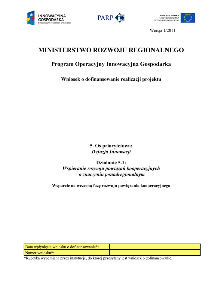 Wersja 1/2011 MINISTERSTWO ROZWOJU REGIONALNEGO Program Operacyjny Innowacyjna Gospodarka Wniosek o dofinansowanie realizacji projektu 5. Oś priorytetowa: Dyfuzja Innowacji Działanie 5.1: Wspieranie rozwoju powiązań kooperacyjnych o znaczeniu ponadregionalnym Wsparcie na wczesną fazę rozwoju powiązania kooperacyjnego Data wpłynięcia wniosku o dofinansowanie*: Numer wniosku*: *Rubryka wypełniana przez instytucję, do której przesyłany jest wniosek o dofinansowanie. I. INFORMACJE OGÓLNE O PROJEKCIE 1. Tytuł projektu 2. Identyfikacja rodzaju interwencji Program Operacyjny Innowacyjna Gospodarka Oś Priorytetowa 5. Dyfuzja innowacji Działanie 5.1 Wspieranie rozwoju powiązań kooperacyjnych o znaczeniu ponadregionalnym 3. Klasyfikacja projektu Temat priorytetowy Kod Wartość 03 Forma finansowania Obszar realizacji Dział gospodarki 01 00 Transfer technologii i udoskonalanie sieci współpracy między MSP, między MSP a innymi przedsiębiorstwami, uczelniami, wszelkiego rodzaju instytucjami na poziomie szkolnictwa pomaturalnego, władzami regionalnymi, ośrodkami badawczymi oraz biegunami naukowymi i technologicznymi (parkami naukowymi i technologicznymi, technopoliami, itd.) Pomoc bezzwrotna Nie dotyczy 4. Typ projektu TAK NIE Czy stanowi duży projekt w rozumieniu rozporządzenia 1083/2006 TAK NIE Planowany cross-financing 5. Wpływ projektu na polityki horyzontalne Unii Europejskiej wymienione w art. 16 lub 17 rozporządzenia 1083/2006 - wpływ projektu na zrównoważony rozwój Uzasadnienie - wpływ projektu na równość szans Uzasadnienie II.INFORMACJE O WNIOSKODAWCY 6. Dane Wnioskodawcy Nazwa Wnioskodawcy NIP Numer REGON Numer w: a) Krajowym Rejestrze Sądowym b) Ewidencji Działalności Gospodarczej NEUTRALNY POZYTYWNY NEUTRALNY POZYTYWNY Wnioskodawca prowadzi działalność na terytorium RP tak Adres siedziby: Województwo Powiat Gmina Miejscowość Ulica Nr budynku Nr lokalu Kod pocztowy Numer telefonu Numer faksu Adres poczty elektronicznej Adres strony internetowej 7. Forma prawna prowadzonej działalności … 8. Data rejestracji działalności Wnioskodawcy (miesiąc/rok) 9. Kod PKD/EKD podstawowej działalności Wnioskodawcy oraz działalność, której dotyczy projekt (jeśli inna niż podstawowa) 10. Cel przeznaczenia wypracowanych zysków 11. Opis działalności Wnioskodawcy 12. Zasoby i potencjał Wnioskodawcy a) Liczba pracowników ogółem: - w tym liczba pracowników skierowanych do realizacji projektu: - planowana liczba pracowników pozyskanych do realizacji projektu - Opis kwalifikacji ww. pracowników, niezbędnych do świadczenia usług na rzecz uczestników powiązania kooperacyjnego b) warunki techniczno-organizacyjne Wnioskodawcy - pomieszczenia niezbędne do realizacji projektu: powierzchnia biurowa, liczba i powierzchnia pomieszczeń, inne zasoby lokalowe - środki trwałe, które zostaną wykorzystane do realizacji projektu (należy podać ilość i rodzaj środków): zestawy komputerowe, łącze internetowe, linie telefoniczne, kserokopiarki, faksy, inne zasoby techniczne nie właściwe dla charakteru realizowanych działań: - inne zasoby techniczne niezbędne do realizacji projektu i uzależnione od jego specyfiki c) Czy Wnioskodawca brał udział w działaniach informacyjno-promocyjnych, badawczych oraz szkoleniowych (jakich?) d) Czy Wnioskodawca Krajowego Systemu Usług należy tak nie (opis) do tak nie (opis) e) Czy Wnioskodawca prowadzi współpracę z innymi powiązaniami tak kooperacyjnymi o podobnym profilu (opis) branżowym w kraju i za granicą? nie 13. Dane osoby/osób upoważnionych przez Wnioskodawcę do kontaktów Imię i nazwisko: Stanowisko: Numer telefonu/fax: Adres poczty elektronicznej: III. INFORMACJE O POWIĄZANIU KOOPERACYJNYM 14. Nazwa powiązania kooperacyjnego: 15. Data podpisania porozumienia/umowy powiązania kooperacyjnego (dd/mm/rrrr) 16. Adres strony internetowej 17. Profil branżowy powiązania kooperacyjnego 18. Lokalizacja powiązania kooperacyjnego: województwo/województwa (podać jakie): a) Lokalizacja na terenie o wysokim potencjale innowacyjnym b) Powiązanie kooperacyjne ma kluczowe znaczenie dla rozwoju regionu/ów, na którym/których jest zlokalizowane 19. Produkowane wyroby, usługi (główne) 20. Sposób finansowania działalności powiązania fundusze publiczne fundusze prywatne a) składki członkowskie b) pożyczki, kredyty inne (jakie) ………………………….. tak nie (opis) tak nie (opis) 21. Charakterystyka powiązania kooperacyjnego a) Liczba członków powiązania kooperacyjnego, którzy podpisali porozumienie/umowę zgodnie z pkt 15: w tym przedsiębiorcy: % przedsiębiorców z sektora małych i średnich przedsiębiorstw w stosunku do liczby członków ogółem: b) Profile członków powiązania kooperacyjnego liczba przedsiębiorstw mikro: liczba przedsiębiorstw małych: liczba przedsiębiorstw średnich: liczba przedsiębiorstw dużych: liczba organizacji badawczych (ogółem) liczba organizacji badawczych posiadających kategorię A lub A+ zgodnie z ustawą o zasadach finansowania nauki liczba jednostek administracji samorządowej: liczba instytucji otoczenia biznesu: inne (liczba, jakie): 22. Udział przychodów ze sprzedaży poza obszar na którym zlokalizowane jest powiązanie kooperacyjne w sprzedaży ogółem (w %): 23. Opis profilu działalności powiązania kooperacyjnego 24. Lista podmiotów wchodzących w skład powiązania kooperacyjnego Lp. Nazwa podmiotu 1. 2. 3. Województwo Miejscowość 25. Lista podmiotów deklarujących chęć przystąpienia do powiązania kooperacyjnego Lp. Nazwa podmiotu 1. 2. 3. Województwo Miejscowość IV. PODMIOTY FUNKCJONUJĄCE W RAMACH POWIĄZANIA KOOPERACYJNEGO1 1 pkt IV należy wypełnić dla każdego podmiotu funkcjonującego w ramach powiązania kooperacyjnego, który podpisał porozumienie/umowę powiązania . 26. Dane podmiotu Nazwa podmiotu NIP REGON: Numer w: a) Krajowym Rejestrze Sądowym: b) Ewidencji Działalności Gospodarc