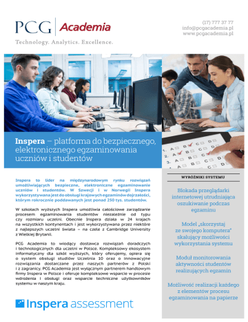 (17) 777 37 77 [email protected] www.pcgacademia.pl Inspera – platforma do bezpiecznego, elektronicznego egzaminowania uczniów i studentów Inspera to lider na międzynarodowym rynku rozwiązań umożliwiających bezpieczne, elektroniczne egzaminowanie uczniów i studentów. W Szwecji i w Norwegii Inspera wykorzystywana jest do obsługi krajowych egzaminów dojrzałości, którym rokrocznie poddawanych jest ponad 250 tys. studentów. W szkołach wyższych Inspera umożliwia całościowe zarządzanie procesem egzaminowania studentów niezależnie od typu czy rozmiaru uczelni. Obecnie Inspera działa w 24 krajach na wszystkich kontynentach i jest wykorzystywana przez niektóre z najlepszych uczelni świata – na czele z Cambridge University z Wielkiej Brytanii. PCG Academia to wiodący dostawca rozwiązań doradczych i technologicznych dla uczelni w Polsce. Kompleksowy ekosystem informatyczny dla szkół wyższych, który oferujemy, opiera się o system obsługi studiów Uczelnia 10 oraz o innowacyjne rozwiązania dostarczane przez naszych partnerów z Polski i z zagranicy. PCG Academia jest wyłącznym partnerem handlowym firmy Inspera w Polsce i oferuje kompleksowe wsparcie w procesie wdrożenia i obsługi oraz wsparcie techniczne użytkowników systemu w naszym kraju. WYRÓŻNIKI SYSTEMU Blokada przeglądarki internetowej utrudniająca oszukiwanie podczas egzaminu Model „skorzystaj ze swojego komputera” skalujący możliwości wykorzystania systemu Moduł monitorowania aktywności studentów realizujących egzamin Możliwość realizacji każdego z elementów procesu egzaminowania na papierze Kompleksowa obsługa procesu egzaminowania Inspera jest dostarczana jako usługa za pośrednictwem Internetu, a jej wdrożenie sprowadza się do konfiguracji systemu do potrzeb uczelni, rejestracji użytkowników i integracji z uczelnianymi rozwiązaniami IT tj. system dziekanatowy, system antyplagiatowy, czy system pojedynczego logowania (SSO). Planowanie egzaminu Zaawansowane możliwości konfiguracji systemu w zakresie trybu realizacji egzaminu, sposobu wyświetlania pytań (sekwencyjnie lub losowo), wsparcia dla studentów ze specjalnymi potrzebami (dodatkowy czas, sprawdzanie pisowni) czy kontroli antyplagiatowej. Przydział użytkowników Możliwość konfiguracji ról i uprawnień dla administratorów systemu, dla nauczycieli tworzących i oceniających pytania i dla osób nadzorujących realizację egzaminu oraz wspierających pracę studentów. Realizacja egzaminu Prowadzenie egzaminów elektronicznie, na papierze lub w formie mieszanej – na komputerach należących do uczelni lub do studentów w zależności od potrzeb i możliwości. Ocenianie egzaminu Automatyczny lub manualny tryb oceniania egzaminu z możliwością przekazania komentarzy i informacji zwrotnej do studenta za pośrednictwem systemu. Tworzenie pytań 14 różnych schematów tworzenia pytań, a wśród nich pytania wielokrotnego wyboru, opisowe, formuły matematyczne, wzory chemiczne, kompilacja kodu i możliwość nagrywania odpowiedzi ustnych. System umożliwia tworzenie i dzielenie banków pytań. Przydział studentów Możliwość importu danych studentów z systemu dziekanatowego i eksportu uzyskanych wyników egzaminacyjnych w systemie Inspera z powrotem do systemu dziekanatowego. Monitorowanie egzaminu Panel kontrolny informujący nauczycieli i administratorów o bieżących postępach studentów i ich aktywności w systemie w trakcie trwania egzaminu. Analiza wyników Automatycznie generowane raporty i analizy prezentujące dystrybucję ocen uzyskanych przez studentów i statystyki związane z realizacją egzaminu. Prezentacja systemu Istnieje wiele możliwości zapoznania się z funkcjonalnością systemu Inspera przed podjęciem ostatecznej decyzji o zakupie oprogramowania: Prezentacja w siedzibie uczelni lub przez system wideokonferencyjny Uzyskanie bezpłatnego, czasowego dostępu demonstracyjnego do systemu dla 3 użytkowników Przeprowadzenie płatnego pilotażu w uczelni dla uzgodnionej grupy użytkowników Skontaktuj się z nami, aby zapytać o szczegóły oferty Inspera +48 (17) 777 37 77 [email protected] Copyright by PCG Academia sp. z o.o.
