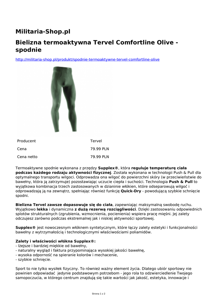 Militaria-Shop.pl Bielizna termoaktywna Tervel Comfortline Olive spodnie http://militaria-shop.pl/produkt/spodnie-termoaktywne-tervel-comfortline-olive Producent Tervel Cena 79.99 PLN Cena netto 79.99 PLN Termoaktywne spodnie wykonana z przędzy Supplex®, która reguluje temperaturę ciała podczas każdego rodzaju aktywności fizycznej. Została wykonana w technologii Push & Pull dla optymalnego transportu wilgoci. Odprowadza ona wilgoć do powierzchni skóry (w przeciwieństwie do bawełny, która ją zatrzymuje) pozostawiając uczucie ciepła i suchości. Technologia Push & Pull to wyjątkowa kombinacja trzech zastosowanych w dzianinie włókien, które odseparowują wilgoć i odprowadzają ją na zewnątrz, spełniając również funkcję Quick-Dry - powodującą szybkie schnięcie spodni. Bielizna Tervel zawsze dopasowuje się do ciała, zapewniając maksymalną swobodę ruchu. Wyjątkowo lekka i dynamiczna z dużą rezerwą rozciągliwości. Dzięki zastosowaniu odpowiednich splotów strukturalnych (zgrubienia, wzmocnienia, pocienienia) wspiera pracę mięśni. Jej zalety odczujesz zarówno podczas ekstremalnej jak i niskiej aktywności sportowej. Supplex® jest nowoczesnym włóknem syntetycznym, które łączy zalety estetyki i funkcjonalności bawełny z wytrzymałością i technologicznymi właściwościami poliamidów. Zalety i właściwości włókna Supplex®: - lżejsze i bardziej miękkie od bawełny, - naturalny wygląd i faktura przypominająca wysokiej jakości bawełnę, - wysoka odporność na spieranie kolorów i mechacenie, - szybkie schnięcie. Sport to nie tylko wysiłek fizyczny. To również ważny element życia. Dlatego ubiór sportowy nie powinien odpowiadać jedynie podstawowym potrzebom - jego rola to odzwierciedlenie Twojego samopoczucia, w którego centrum znajdują się takie wartości jak jakość, estetyka, innowacje i Strona 1 z 2 emocje. Te kryteria z pewnością spełni bielizna Tervel. Producent: Tervel, Polska ROZMIAR WZROST (cm) OBWÓD KLATKI (cm) OBWÓD PASA (cm) S/M 166-178 82-98 80-90 L/XL 176-188 98-112 90-100 XXL 186-198 112-126 100-110 Dane w tabeli nie są wymiarami odzieży - dotyczą wymiarów osoby, na którą ma zostać dobrana koszulka/spodnie. Strona 2 z 2