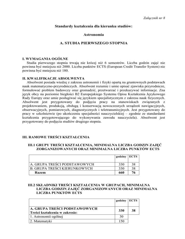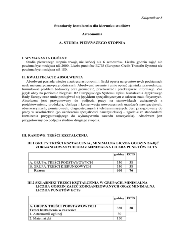 Załącznik nr 8 Standardy kształcenia dla kierunku studiów: Astronomia A. STUDIA PIERWSZEGO STOPNIA I. WYMAGANIA OGÓLNE Studia pierwszego stopnia trwają nie krócej niŜ 6 semestrów. Liczba godzin zajęć nie powinna być mniejsza niŜ 2000. Liczba punktów ECTS (European Credit Transfer System) nie powinna być mniejsza niŜ 180. II. KWALIFIKACJE ABSOLWENTA Absolwent posiada wiedzę z zakresu astronomii i fizyki opartą na gruntownych podstawach nauk matematyczno-przyrodniczych. Absolwent rozumie i umie opisać zjawiska przyrodnicze, formułować problem badawczy oraz gromadzić, przetwarzać i przekazywać informacje. Zna język obcy na poziomie biegłości B2 Europejskiego Systemu Opisu Kształcenia Językowego Rady Europy oraz umie posługiwać się językiem specjalistycznym z zakresu nauk fizycznych. Absolwent jest przygotowany do podjęcia pracy na stanowiskach związanych z projektowaniem, produkcją, obsługą i konserwacją nowoczesnych urządzeń nawigacyjnych, obserwacyjnych, pomiarowych, diagnostycznych i teletransmisyjnych. Jest przygotowany do pracy w szkolnictwie (po ukończeniu specjalności nauczycielskiej – zgodnie ze standardami kształcenia przygotowującego do wykonywania zawodu nauczyciela). Absolwent jest przygotowany do podjęcia studiów drugiego stopnia. III. RAMOWE TREŚCI KSZTAŁCENIA III.1 GRUPY TREŚCI KSZTAŁCENIA, MINIMALNA LICZBA GODZIN ZAJĘĆ ZORGANIZOWANYCH ORAZ MINIMALNA LICZBA PUNKTÓW ECTS godziny ECTS A. GRUPA TREŚCI PODSTAWOWYCH B. GRUPA TREŚCI KIERUNKOWYCH Razem 330 330 660 38 38 76 III.2 SKŁADNIKI TREŚCI KSZTAŁCENIA W GRUPACH, MINIMALNA LICZBA GODZIN ZAJĘĆ ZORGANIZOWANYCH ORAZ MINIMALNA LICZBA PUNKTÓW ECTS godziny ECTS A. GRUPA TREŚCI PODSTAWOWYCH Treści kształcenia w zakresie: 1. Astronomii ogólnej 2. Matematyki 330 30 150 38 3. Fizyki B. GRUPA TREŚCI KIERUNKOWYCH Treści kształcenia w zakresie: 1. Elektrodynamiki 2. Fizyki kwantowej 3. Laboratorium fizycznego 4. Mechaniki klasycznej i relatywistycznej 5. Obserwacji astronomicznych 6. Fizyki układów planetarnych 150 330 38 III.3 WYSZCZEGÓLNIENIE TREŚCI I EFEKTÓW KSZTAŁCENIA A. GRUPA TREŚCI PODSTAWOWYCH 1. Kształcenie w zakresie astronomii ogólnej Treści kształcenia: WaŜniejsze odkrycia astronomiczne do połowy XIX wieku. Nośniki informacji o Wszechświecie. Fizyka i ewolucja gwiazd. Materia międzygwiazdowa. Budowa Galaktyki. Astronomia pozagalaktyczna. Elementy kosmologii. Efekty kształcenia – umiejętności i kompetencje: rozumienia zjawisk astronomicznych i praw rządzących zjawiskami astronomicznymi; posługiwania się terminologią astronomiczną; posługiwania się aktualną wiedzą astronomiczną. 2. Kształcenie w zakresie matematyki Treści kształcenia: Algebra – Układy równań liniowych. Macierze. Wyznaczniki. Wybrane struktury algebraiczne – grupy, pierścienie, ciała. Przestrzenie liniowe rzeczywiste i zespolone. Odwzorowania liniowe – ich własności. Zagadnienie wartości własnych. Formy liniowe, biliniowe i hermitowskie. Przestrzenie z iloczynem skalarnym. Przestrzenie unitarne. Analiza matematyczna – Indukcja matematyczna. Rachunek zbiorów. Odwzorowania – ich własności. Elementy topologii w przestrzeniach metrycznych. Ciągi liczbowe. Granica i ciągłość funkcji. Rachunek róŜniczkowy funkcji jednej zmiennej i funkcji wielu zmiennych. Całka nieoznaczona i całka oznaczona funkcji jednej zmiennej. Zastosowania rachunku całkowego. Szeregi liczbowe. Ciągi i szeregi funkcyjne. Równania róŜniczkowe zwyczajne i cząstkowe w zakresie niezbędnym dla mechaniki punktów i pól. Zagadnienia graniczne – początkowe i brzegowe. Szeregi i całki Fouriera. Elementy teorii przestrzeni Hilberta. Elementy analizy wektorowej. Funkcje zespolone. Efekty kształcenia – umiejętności i kompetencje: posługiwania się aparatem matematycznym i metodami matematycznymi w opisie i modelowaniu zjawisk i procesów fizycznych. 3. Kształcenie w zakresie Podstaw fizyki Treści kształcenia: Mechanika – Podstawowe wielkości fizyczne i ich pomiar. Międzynarodowy układ jednostek SI. Wektory i wielkości wektorowe w fizyce. Ruch prostoliniowy. Ruch w dwóch i trzech wymiarach. Siła i ruch. Zasady dynamiki Newtona. Energia kinetyczna i praca. Energia potencjalna i zachowanie energii. Zderzenia. Ruch obrotowy brył sztywnych. Statyka i dynamika płynów. Drgania mechaniczne i fale. Oddziaływanie grawitacyjne i pole grawitacyjne. Transformacja Lorentza. Termodynamika – temperatura, energia wewnętrzna, entropia. Procesy odwracalne i nieodwracalne. Równowaga termodynamiczna. Zasady termodynamiki. Przewodnictwo cieplne. Elementy mechaniki statystycznej. Elektryczność i magnetyzm – Ładunek elektryczny i pole elektryczne. Prawo Coulomba. Prawo Gaussa. Potencjał elektryczny. Dielektryk w polu elektrycznym. Kondensatory. Prąd elektryczny, prawa przepływu prądu. Obwody elektryczne. Pola magnetyczne. Prawo Ampera. Indukcja i indukcyjność. Drgania elektromagnetyczne. Prąd zmienny. Równania Maxwella. Fale 2 elektromagnetyczne. Optyka – Fala świetlna na granicy dwóch ośrodków. Polaryzacja światła. Dyfrakcja i interferencja światła. Prędkość światła. Współczynnik załamania światła i jego dyspersja. Klasyczne i nieklasyczne źródła światła. Detektory optyczne. Budowa materii – Nieklasyczne zjawiska i koncepcja fotonu. Stabilność atomu i model Rutherforda-Bohra. Fale de Broglie’a. Równanie Schrödingera. Atom wodoru. Obiekty kwantowe w polach zewnętrznych. Modele jądrowe. Promieniotwórczość. Klasyfikacja cząstek elementarnych. Efekty kształcenia – umiejętności i kompetencje: rozumienia podstawowych zjawisk fizycznych w przyrodzie; opisu zjawisk fizycznych, formułowania problemu oraz wykorzystywania metodyki badań fizycznych (eksperymentalnych i teoretycznych) do jego rozwiązywania. B. GRUPA TREŚCI KIERUNKOWYCH 1. Kształcenie w zakresie elektrodynamiki Treści kształcenia: Elektrostatyka 