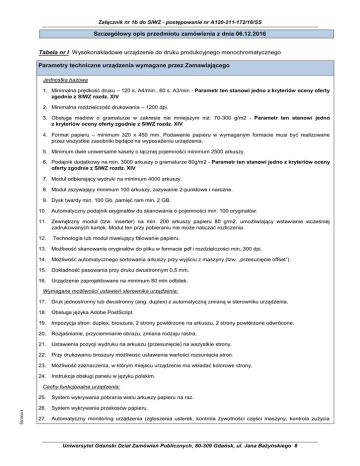 Załącznik nr 1b do SIWZ - postępowanie nr A120-211-172/16/SS Szczegółowy opis przedmiotu zamówienia z dnia 06.12.2016 Tabela nr I Wysokonakładowe urządzenie do druku produkcyjnego monochromatycznego Parametry techniczne urządzenia wymagane przez Zamawiającego Jednostka bazowa 1. Minimalna prędkość druku – 120 s. A4/min., 60 s. A3/min - Parametr ten stanowi jedno z kryteriów oceny oferty zgodnie z SIWZ rozdz. XIV 2. Minimalna rozdzielczość drukowania – 1200 dpi. 3. Obsługa mediów o gramaturze w zakresie nie mniejszym niż: 70-300 g/m2 - Parametr ten stanowi jedno z kryteriów oceny oferty zgodnie z SIWZ rozdz. XIV 4. Format papieru – minimum 320 x 450 mm. Podawanie papieru w wymaganym formacie musi być realizowane przez wszystkie zasobniki będące na wyposażeniu urządzenia. 5. Minimum dwie uniwersalne kasety o łącznej pojemności minimum 2500 arkuszy. 6. Podajnik dodatkowy na min. 3000 arkuszy o gramaturze 80g/m2 - Parametr ten stanowi jedno z kryteriów oceny oferty zgodnie z SIWZ rozdz. XIV 7. Moduł odbierający wydruki na minimum 4000 arkuszy. 8. Moduł zszywający minimum 100 arkuszy, zszywanie 2-punktowe i narożne. 9. Dysk twardy min. 100 Gb, pamięć ram min. 2 GB. 10. Automatyczny podajnik oryginałów do skanowania o pojemności min. 100 oryginałów. 11. Zewnętrzny moduł (tzw. inserter) na min. 200 arkuszy papieru 80 g/m2. umożliwiający wstawianie wcześniej zadrukowanych kartek. Moduł ten przy pobieraniu nie może naliczać rozliczenia. 12. Technologia lub moduł niwelujący falowanie papieru. 13. Możliwość skanowania oryginałów do pliku w formacie pdf i rozdzielczości min. 300 dpi. 14. Możliwość automatycznego sortowania arkuszy przy wyjściu z maszyny (tzw. „przesunięcie offset”). 15. Dokładność pasowania przy druku dwustronnym 0,5 mm. 16. Urządzenie zaprojektowane na minimum 80 mln odbitek. Wymagane możliwości ustawień sterownika urządzenia: 17. Druk jednostronny lub dwustronny (ang. duplex) z automatyczną zmianą w sterowniku urządzenia. 18. Obsługa języka Adobe PostScript. 19. Impozycja stron: duplex, broszura, 2 strony powtórzone na arkuszu, 2 strony powtórzone odwrócone. 20. Rozjaśnianie, przyciemnianie obrazu, zmiana rodzaju rastra. 21. Ustawienia pozycji wydruku na arkuszu (przesunięcie) na wszystkie strony. 22. Przy drukowaniu broszury możliwość ustawienia wartości rozsunięcia stron. 23. Możliwość zaznaczenia, w którym miejscu urządzenie ma wkładać kolorowe strony. 24. Instrukcja obsługi panelu w języku polskim. Strona1 Cechy funkcjonalne urządzenia: 25. System wykrywania pobrania wielu arkuszy papieru na raz. 26. System wykrywania przekosów papieru. 27. Automatyczny monitoring urządzenia (zgłoszenia usterek, kontrola żywotności części maszyny, kontrola zużycia Uniwersytet Gdański Dział Zamówień Publicznych, 80-309 Gdańsk, ul. Jana Bażyńskiego 8 Załącznik nr 1b do SIWZ - postępowanie nr A120-211-172/16/SS materiałów eksploatacyjnych) bez ingerencji użytkownika. 28. Pozostawianie nieskończonych prac w pamięci po wyłączeniu maszyny i możliwość wznowienia od momentu przerwania druku po włączeniu maszyny. 29. Możliwość wstrzymania drukowanej pracy i zmiany ustawień na panelu sterowniczym (marginesy, przesunięcie lub przycięcie stron na arkuszu, pozycjonowanie stron). Tabela nr II Wysokonakładowe urządzenie do druku produkcyjnego kolorowego Parametry techniczne sprzętu wymagane przez Zamawiającego Jednostka bazowa 1. Minimalna prędkość druku w kolorze – 70 s. A4/min., 30 s. A3/min 2. Minimalna rozdzielczość drukowania – 1200 dpi. 3. Obsługa mediów o gramaturze w zakresie nie mniejszym niż: 70-300 g/m2. 4. Format papieru – minimum 320 x 450 mm. Podawanie papieru w wymaganym formacie musi być realizowane przez wszystkie zasobniki będące na wyposażeniu urządzenia. 5. Co najmniej jeden uniwersalny podajnik o łącznej pojemności min. 1500 arkuszy papieru 80 g/m2 6. Podajnik dodatkowy o pojemności min. 2500 arkuszy 80 g/m2. 7. Dedykowany moduł lub wbudowane rozwiązanie umożliwiające druk kopert o rozmiarach w standardzie min. C6, C5, C4, DL i gramaturze w zakresie nie mniejszym niż: 70-100 g/m2. 8. Moduł odbierający wydruki (ang. finisher) na minimum 4000 arkuszy. 9. Moduł zszywający minimum 100 arkuszy, zszywanie 2-puntowe i narożne. 10. Dysk twardy min. 100 GB. 11. Automatyczny podajnik oryginałów do skanowania o pojemności min. 100 oryginałów 12. Możliwość skanowania oryginałów do pliku w formacie pdf i rozdzielczości min. 300 dpi. 13. Technologia lub moduł niwelujący falowanie papieru. 14. Spektrofotometr z oprogramowaniem do linearyzacji maszyny. 15. Dokładność pasowania przy druku dwustronnym 1 mm. 16. Urządzenie zaprojektowane na minimum 5 mln odbitek. Wymagane możliwości ustawień sterownika urządzenia: 17. Druk jednostronny lub dwustronny (ang. duplex) z automatyczną zmianą w sterowniku urządzenia. 18. Obsługa języka Adobe PostScript. 19. Możliwość wstrzymania drukowanej pracy i zmiany ustawień na panelu sterowniczym (marginesy, przesunięcie lub przycięcie stron na arkuszu, pozycjonowanie stron). Cechy funkcjonalne urządzenia: 20. System wykrywania pobrania wielu arkuszy papieru na raz. 21. System wykrywania przekosów papieru. Strona2 22. Kontrola odkształceń obrazów w druku dwustronnym. 23. Automatyczny monitoring urządzenia (zgłoszenia usterek, kontrola żywotności części maszyny, kontrola zużycia materiałów eksploatacyjnych) bez ingerencji użytkownika. Uniwersytet Gdański Dział Zamówień Publicznych, 80-309 Gdańsk, ul. Jana Bażyńskiego 8 Załącznik nr 1b do SIWZ - postępowanie nr A120-211-172/16/SS 24. Możliwość druku na papierach fakturowanych o gramaturze minimum 300 g/m2. Tabela nr III Oprogramowanie do sterowania urządzeniami Parametry techniczne sprzętu wymagane przez Zamawiającego 1. Możliwość wykorzystania oprogramowania na urządzeniach z tabel I 