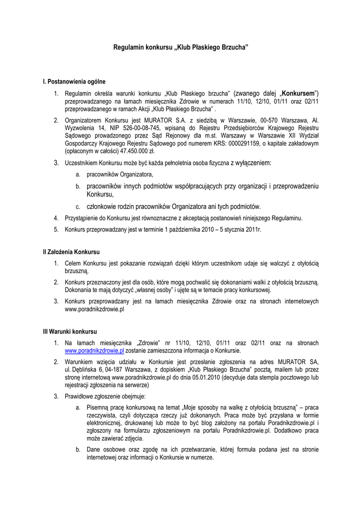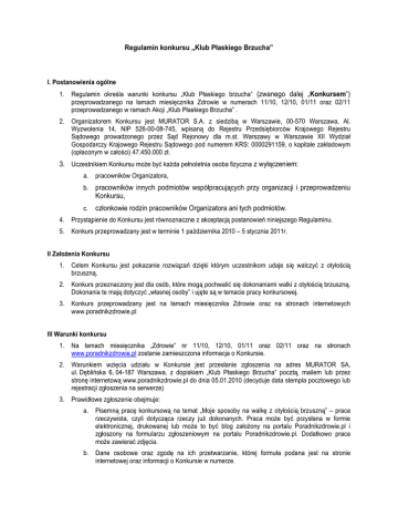Regulamin konkursu „Klub Płaskiego Brzucha” I. Postanowienia ogólne 1. Regulamin określa warunki konkursu „Klub Płaskiego brzucha” (zwanego dalej „Konkursem”) przeprowadzanego na łamach miesięcznika Zdrowie w numerach 11/10, 12/10, 01/11 oraz 02/11 przeprowadzanego w ramach Akcji „Klub Płaskiego Brzucha” . 2. Organizatorem Konkursu jest MURATOR S.A. z siedzibą w Warszawie, 00-570 Warszawa, Al. Wyzwolenia 14, NIP 526-00-08-745, wpisaną do Rejestru Przedsiębiorców Krajowego Rejestru Sądowego prowadzonego przez Sąd Rejonowy dla m.st. Warszawy w Warszawie XII Wydział Gospodarczy Krajowego Rejestru Sądowego pod numerem KRS: 0000291159, o kapitale zakładowym (opłaconym w całości) 47.450.000 zł. 3. Uczestnikiem Konkursu może być każda pełnoletnia osoba fizyczna z wyłączeniem: a. pracowników Organizatora, b. pracowników innych podmiotów współpracujących przy organizacji i przeprowadzeniu Konkursu, c. członkowie rodzin pracowników Organizatora ani tych podmiotów. 4. Przystąpienie do Konkursu jest równoznaczne z akceptacją postanowień niniejszego Regulaminu. 5. Konkurs przeprowadzany jest w terminie 1 października 2010 – 5 stycznia 2011r. II Założenia Konkursu 1. Celem Konkursu jest pokazanie rozwiązań dzięki którym uczestnikom udaje się walczyć z otyłością brzuszną. 2. Konkurs przeznaczony jest dla osób, które mogą pochwalić się dokonaniami walki z otyłością brzuszną. Dokonania te mają dotyczyć „własnej osoby” i ujęte są w temacie pracy konkursowej. 3. Konkurs przeprowadzany jest na łamach miesięcznika Zdrowie oraz na stronach internetowych www.poradnikzdrowie.pl III Warunki konkursu 1. Na łamach miesięcznika „Zdrowie” nr 11/10, 12/10, 01/11 oraz 02/11 oraz na stronach www.poradnikzdrowie.pl zostanie zamieszczona informacja o Konkursie. 2. Warunkiem wzięcia udziału w Konkursie jest przesłanie zgłoszenia na adres MURATOR SA, ul. Dęblińska 6, 04-187 Warszawa, z dopiskiem „Klub Płaskiego Brzucha” pocztą, mailem lub przez stronę internetową www.poradnikzdrowie.pl do dnia 05.01.2010 (decyduje data stempla pocztowego lub rejestracji zgłoszenia na serwerze) 3. Prawidłowe zgłoszenie obejmuje: a. Pisemną pracę konkursową na temat „Moje sposoby na walkę z otyłością brzuszną” – praca rzeczywista, czyli dotycząca rzeczy już dokonanych. Praca może być przysłana w formie elektronicznej, drukowanej lub może to być blog założony na portalu Poradnikzdrowie.pl i zgłoszony na formularzu zgłoszeniowym na portalu Poradnikzdrowie.pl. Dodatkowo praca może zawierać zdjęcia. b. Dane osobowe oraz zgodę na ich przetwarzanie, której formuła podana jest na stronie internetowej oraz informacji o Konkursie w numerze. 4. Zgłoszenia nie zawierające któregokolwiek z wyżej wymienionych elementów będą traktowane jako nieważne i nie będą uwzględniane przez Jury. 5. Przesłane prace nie podlegają zwrotowi. 6. Zasady wyboru laureatów: Spośród nadesłanych prac Jury wybiera, prace osób które aktywnie walczą lub walczyły z otyłością brzuszną i które najciekawiej opiszą swoje działania. 7. Jury oceni prace pod kątem oryginalności odpowiedzi na prace konkursowe i spośród nadesłanych prac wyłonionych zostanie szesnaście osób w kolejności ważności co jest jednoznaczne z przyznaniem najwyższej, I nagrody osobie, która zajęła I miejsce. 8. Laureaci poinformowani zostaną o nagrodzie telefonicznie lub listownie. 9. Lista nagrodzonych będzie opublikowana na stronie Internetowej, a całościowa (wszyscy laureaci) opublikowana zostanie w miesięczniku „Zdrowie” nr 4/11i zawierać będzie imiona i nazwiska laureatów oraz ich miejscowość zamieszkania. 10. Zgodnie z obowiązującymi przepisami prawa podatkowego, Zwycięzca jest zobowiązany do odprowadzenia - za pośrednictwem Organizatora – zryczałtowanego podatku dochodowego od osób fizycznych od nagród, których wartość przekracza 760 zł brutto. Przed wydaniem takiej nagrody Zwycięzca zobowiązany jest przekazać Organizatorowi – na konto BPH S.A. 07 1060 0076 0000 3210 0014 8955 -kwotę zryczałtowanego podatku w wysokości 10% wartości nagrody, co stanowi warunek wydania nagrody. 11. W przypadku nieodebrania nagrody przez zwycięzcę, nagroda przechodzi na własność MURATOR S.A. IV Jury Konkursu W skład Jury konkursu wchodzą przedstawiciele Organizatorów Konkursu V. Nagrody, zasady odbioru 1. W Konkursie przyznane zostaną nagrody: 1.1 Pobyt w SPA w Hotelu Farmona Business & , Farmona Wellness & SPA położonym w Krakowie, przy ul. Jugowickiej 10 c obejmujący: a. 4 noclegi w pokoju jednoosobowym b. pełne wyżywienie od kolacji w dniu przyjazdu do śniadania w dniu wyjazdu c. program zabiegów: Dzień 1 Modelujący Dar Natury dla ciała Drenaż Limfatyczny Dzień 2 Mangir - Głęboki Detox Drenaż limfatyczny Sesja z glinkami w łaźni błotnej Dzień 3 Modelujący Dar Natury dla ciała Drenaż Limfatyczny (2 sztuki/1 uczestnik=1 pobyt o wartości brutto 3310,00 zł) 1.2 12 tygodniowy program żywieniowy pod okiem dietetyka (1 sztuka o wartości brutto 1860,00 zł) 1.3 cykloergometr magnetyczny C301 York Fitness (1 sztuka o wartości brutto 1799,00 zł) 1.4 Miesięczny pakiet 10-cio treningowy z trenerem osobistym w Warszawie (1 pakiet o wartości brutto 1550,00 zł) 1.5 Zestaw suplementów firmy Pharma Nord, w skład których wchodzą: a. Bio-CLA z zieloną herbatą (90 kaps) b. Bio-Chrom (60 tabl) c. Bio-Błonnik (60 tabl) d. BioActive Q10 Uniqinol (30 kaps) e. Bio-Witamina D3 (40 kaps) f. Bio-Uroda (60 tabl) (5 zestawów/1 uczestnik=1 zestaw o wartości brutto 216,01 zł) 1.6 Zestaw kosmetyków firmy Farmona, w skład którego wchodzą: a. Wyszczuplająca sól antycellulitowa do kąpieli b. Drenujący peeling antycellulitowy do mycia ciała c. Antycellulitowy krem wyszczuplająco-ujędrniający do ciała d. Liftingujące serum modelujące biust PushUP e. Aktywne serum modelujące brzu
