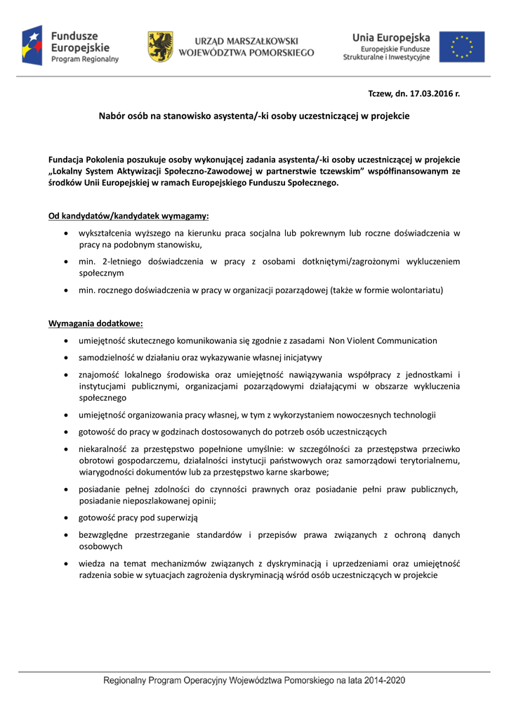 Tczew, dn. 17.03.2016 r. Nabór osób na stanowisko asystenta/-ki osoby uczestniczącej w projekcie Fundacja Pokolenia poszukuje osoby wykonującej zadania asystenta/-ki osoby uczestniczącej w projekcie „Lokalny System Aktywizacji Społeczno-Zawodowej w partnerstwie tczewskim” współfinansowanym ze środków Unii Europejskiej w ramach Europejskiego Funduszu Społecznego. Od kandydatów/kandydatek wymagamy: wykształcenia wyższego na kierunku praca socjalna lub pokrewnym lub roczne doświadczenia w pracy na podobnym stanowisku, min. 2-letniego doświadczenia w pracy z osobami dotkniętymi/zagrożonymi wykluczeniem społecznym min. rocznego doświadczenia w pracy w organizacji pozarządowej (także w formie wolontariatu) Wymagania dodatkowe: umiejętność skutecznego komunikowania się zgodnie z zasadami Non Violent Communication samodzielność w działaniu oraz wykazywanie własnej inicjatywy znajomość lokalnego środowiska oraz umiejętność nawiązywania współpracy z jednostkami i instytucjami publicznymi, organizacjami pozarządowymi działającymi w obszarze wykluczenia społecznego umiejętność organizowania pracy własnej, w tym z wykorzystaniem nowoczesnych technologii gotowość do pracy w godzinach dostosowanych do potrzeb osób uczestniczących niekaralność za przestępstwo popełnione umyślnie: w szczególności za przestępstwa przeciwko obrotowi gospodarczemu, działalności instytucji państwowych oraz samorządowi terytorialnemu, wiarygodności dokumentów lub za przestępstwo karne skarbowe; posiadanie pełnej zdolności do czynności prawnych oraz posiadanie pełni praw publicznych, posiadanie nieposzlakowanej opinii; gotowość pracy pod superwizją bezwzględne przestrzeganie standardów i przepisów prawa związanych z ochroną danych osobowych wiedza na temat mechanizmów związanych z dyskryminacją i uprzedzeniami oraz umiejętność radzenia sobie w sytuacjach zagrożenia dyskryminacją wśród osób uczestniczących w projekcie Mile widziane: doświadczenie w pracy jako streetworker/-ka umiejętności z zakresu planowania i prowadzenia treningu budżetowego osób dotkniętych wykluczeniem społecznym doświadczenie w pracy z osobami dotkniętymi bezdomnością, wychodzącymi z uzależnienia, doświadczającymi przemocy komunikatywna znajomość języka angielskiego Osoba na tym stanowisku będzie odpowiedzialna przede wszystkim za: asystenturę w realizacji Indywidualnych Planów Wsparcia osób uczestniczących w projekcie współpracę z lokalnymi instytucjami i organizacjami pozarządowymi w celu bieżącego informowania się o stanie realizacji Indywidualnych Planów Wsparcia realizację programów treningu mieszkaniowego w ramach mieszkania treningowego ścisła współpraca ze specjalistami zatrudnionymi w projekcie – psychologami, pracownikami socjalnymi, doradcami specjalistycznymi, brokerami Pobudzanie społecznej aktywności i inspirowanie działań samopomocowych w zaspokajaniu niezbędnych potrzeb życiowych osób uczestniczących w projekcie udział w spotkaniach zespołów interdyscyplinarnych dot. osób uczestniczących w projekcie praca interwencyjna tj. reagowanie na sytuacje nagłe, kryzysowe będące udziałem osób uczestniczących w projekcie prowadzenie comiesięcznej dokumentacji związanej z wykonywanymi obowiązkami Wymiar i termin pracy: praca w wymiarze całego etatu (umowa o pracę), termin rozpoczęcia 01.kwietnia 2016 r. Miejsce wykonania prac: Fundacja Pokolenia, ul. Obrońców Westerplatte 6, 83-110 Tczew Kandydat/kandydatka powinien/powinna złożyć ofertę, która zawiera: CV Dokumentację potwierdzającą kwalifikacje i doświadczenie w zakresie wymogów określonych w ogłoszeniu Prosimy o dopisanie następującej klauzuli: „Wyrażam zgodę na przetwarzanie moich danych osobowych zawartych w mojej ofercie pracy dla potrzeb niezbędnych do realizacji procesu rekrutacji (zgodnie z ustawą z dn. 29.08.1997 r. o ochronie danych osobowych Dz. U. nr 101 z 2002 r. poz. 926 z późn. zm.)”. List motywacyjny, uwzględniający specyfikę niniejszego ogłoszenia Rekomendacja (minimum jedna), sporządzona przez pracodawcę i/lub organizację pozarządową korzystającą z wolontariatu świadczonego przez kandydatkę/kandydata poświadczająca umiejętności, predyspozycje związane z wymaganiami przedstawionymi w niniejszym ogłoszeniu oświadczenie o korzystaniu z pełni praw publicznych i o niekaralności za przestępstwo popełnione umyślnie; oświadczenie o wyrażeniu zgody na przetwarzanie danych osobowych na potrzeby związane z ogłoszonym naborem. Termin składania ofert: Osoby zainteresowane prosimy o przesyłanie ww. dokumentów na [email protected] lub złożenia osobiście w terminie do 31 marca 2016 roku. Informacji udziela Grzegorz Pawlikowski pod nr tel. 58 352 45 46 lub w biurze Fundacji Pokolenia przy ul. Obrońców Westerplatte 6 w Tczewie w godz. 09.00-16.00. adres osobiście Wszystkim zainteresowanym osobom dziękujemy za zgłoszenia. Uprzejmie informujemy, że skontaktujemy się jedynie z wybranymi kandydatami/kandydatkami Informacje dodatkowe: Nazwa projektu: Lokalny System Aktywizacji Społeczno-Zawodowej w partnerstwie tczewskim Czas trwania: 01.03.2016-31.10.2018 Skład partnerska: Fundacja Pokolenia (partner wiodący), Gmina Miejska Tczew, w tym Miejski Ośrodek Pomocy Społecznej w Tczewie, Gmina Wiejska Tczew/Gminny Ośrodek Pomocy Społecznej, Stowarzyszenie na rzecz Szkolnictwa Specjalnego w Tczewie, NZOZ Centrum Leczenia Uzależnień "Zapowiednik" oraz Fundacja DASZRADĘ im. Barbary Karaczyńskiej. Partnerzy nieformalnymi: Powiatowy Urząd Pracy w Tczewie oraz Powiatowe Centrum Pomocy Rodzinie w Tczewie. Cele projektu Zmniejszenie ubóstwa i włączenie społeczne poprzez wzrost aktywności społecznej i zawodowej osób wykluczonych społecznie oraz ich otoczenia zam. obszar gminy wiejskiej i miejskiej Tczew, a także powiatu tczewskiego. Cele szczegółowe to: Zadania Zwiększenie sz