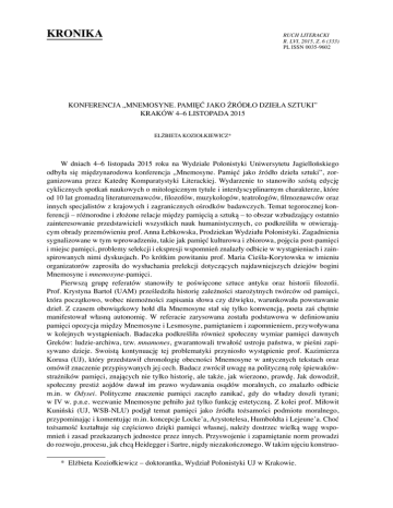 KRONIKA RUCH LITERACKI R. LVI, 2015, Z. 6 (333) PL ISSN 0035-9602 KONFERENCJA „MNEMOSYNE. PAMIĘĆ JAKO ŹRÓDŁO DZIEŁA SZTUKI” KRAKÓW 4–6 LISTOPADA 2015 ELŻBIETA KOZIOŁKIEWICZ* W dniach 4–6 listopada 2015 roku na Wydziale Polonistyki Uniwersytetu Jagiellońskiego odbyła się międzynarodowa konferencja „Mnemosyne. Pamięć jako źródło dzieła sztuki”, zorganizowana przez Katedrę Komparatystyki Literackiej. Wydarzenie to stanowiło szóstą edycję cyklicznych spotkań naukowych o mitologicznym tytule i interdyscyplinarnym charakterze, które od 10 lat gromadzą literaturoznawców, filozofów, muzykologów, teatrologów, filmoznawców oraz innych specjalistów z krajowych i zagranicznych ośrodków badawczych. Temat tegorocznej konferencji – różnorodne i złożone relacje między pamięcią a sztuką – to obszar wzbudzający ostatnio zainteresowanie przedstawicieli wszystkich nauk humanistycznych, co podkreśliła w otwierającym obrady przemówieniu prof. Anna Łebkowska, Prodziekan Wydziału Polonistyki. Zagadnienia sygnalizowane w tym wprowadzeniu, takie jak pamięć kulturowa i zbiorowa, pojęcia post-pamięci i miejsc pamięci, problemy selekcji i ekspresji wspomnień znalazły odbicie w wystąpieniach i zainspirowanych nimi dyskusjach. Po krótkim powitaniu prof. Maria Cieśla-Korytowska w imieniu organizatorów zaprosiła do wysłuchania prelekcji dotyczących najdawniejszych dziejów bogini Mnemosyne i mnemosyne-pamięci. Pierwszą grupę referatów stanowiły te poświęcone sztuce antyku oraz historii filozofii. Prof. Krystyna Bartol (UAM) prześledziła historię zależności starożytnych twórców od pamięci, która początkowo, wobec niemożności zapisania słowa czy dźwięku, warunkowała powstawanie dzieł. Z czasem obowiązkowy hołd dla Mnemosyne stał się tylko konwencją, poeta zaś chętnie manifestował własną autonomię. W referacie zarysowana została podstawowa w definiowaniu pamięci opozycja między Mnemosyne i Lesmosyne, pamiętaniem i zapomnieniem, przywoływana w kolejnych wystąpieniach. Badaczka podkreśliła również społeczny wymiar pamięci dawnych Greków: ludzie-archiwa, tzw. mnamones, gwarantowali trwałość ustroju państwa, w pieśni zapisywano dzieje. Swoistą kontynuację tej problematyki przyniosło wystąpienie prof. Kazimierza Korusa (UJ), który przedstawił chronologię obecności Mnemosyne w antycznych tekstach oraz omówił znaczenie przypisywanych jej cech. Badacz zwrócił uwagę na polityczną rolę śpiewakówstrażników pamięci, znających nie tylko historię, ale także, jak wierzono, prawdę. Jak dowodził, społeczny prestiż aojdów dawał im prawo wydawania osądów moralnych, co znalazło odbicie m.in. w Odysei. Polityczne znaczenie pamięci zaczęło zanikać, gdy do władzy doszli tyrani; w IV w. p.n.e. wezwanie Mnemosyne pełniło już tylko funkcję estetyczną. Z kolei prof. Miłowit Kuniński (UJ, WSB-NLU) podjął temat pamięci jako źródła tożsamości podmiotu moralnego, przypominając i komentując m.in. koncepcje Locke’a, Arystotelesa, Humboldta i Lejeune’a. Choć tożsamość kształtuje się częściowo dzięki pamięci własnej, należy dostrzec wielką wagę wspomnień i zasad przekazanych jednostce przez innych. Przyswojenie i zapamiętanie norm prowadzi do rozwoju, procesu, jak chcą Heidegger i Sartre, nigdy niezakończonego. W takim ujęciu konstruo* Elżbieta Koziołkiewicz – doktorantka, Wydział Polonistyki UJ w Krakowie. 644 Kronika wanie własnego „ja” jest analogiczne do tworzenia dzieła sztuki, autonarracja, którą układamy dla samych siebie, funkcjonuje podobnie jak spisana autobiografia. Kolejne wystąpienia poświęcono kulturze średniowiecza i renesansu. Prof. Dorothy Figueira (University of Georgia) rozwinęła sygnalizowany w porannych obradach temat mnemoniki w kontekście działalności jezuickich misjonarzy w Azji. Głównym bohaterem referatu był Matteo Ricci, którego postawę wobec obcej kultury badaczka uznała za bliską dążeniom współczesnych komparatystów. Dla włoskiego mnicha pamięć łączyła się z etyką i duchowością, a wypracowane w kulturze europejskiej mnemotechniki pozwoliły mu pozyskać szacunek lokalnej ludności. W rezultacie sukces, jaki Ricci odniósł, nawracając Chińczyków, został przedstawiony jako rezultat nie tylko utożsamienia katolicyzmu z wiedzą i władzą, ale także jego starań, by upodobnić się do miejscowych. Referat prof. Andrzeja Borowskiego (UJ) dotyczył sposobów konstruowania wizerunków średniowiecza w literaturze wczesnonowożytnej. Badacz podkreślił metaforyczny charakter pojęcia „wieki średnie”, powstałego, tak jak nazwy innych okresów w dziejach kultury, w celu zaznaczenia dystansu wobec przeszłości rozumianej jako coś innego i, czasem, gorszego. Ukształtowany w dynamicznym starciu pamięci i zapominania uproszczony obraz średniowiecza jako „wieków ciemnych” skonfrontowano z opisem piękna tego okresu. Zasygnalizowane zostało także istnienie alternatywnej nowożytnej wizji średniowiecza jako epoki romantycznej i rycerskiej. Przykłady interesujących wytworów kultury wieków średnich pojawiły się w wystąpieniu prof. Jana K. Ostrowskiego (UJ), który omówił mało znane sposoby wizualnego upamiętniania zmarłych w średniowiecznej i nowożytnej Europie. Liczne zabytki z wielu krajów – publiczność miała okazję obejrzeć kilkadziesiąt zdjęć – należały do dwóch kategorii przedstawień. Tablice heraldyczne (powstające również dziś) i achievements (rynsztunek zmarłego rycerza) to reprezentacja pars pro toto, alegoryczny znak osoby. Portrety trumienne, chorągwie i kapy nagrobne oraz różnego rodzaju portrety i figury stanowiły natomiast naturalistyczne wizerunki zmarłego. Dr Wojciech Ryczek (UJ) omówił szeroko komentowany przez renesansowych humanistów dialog Cycerona, w którym pamięć zestawiono z zapisaną woskową tablic