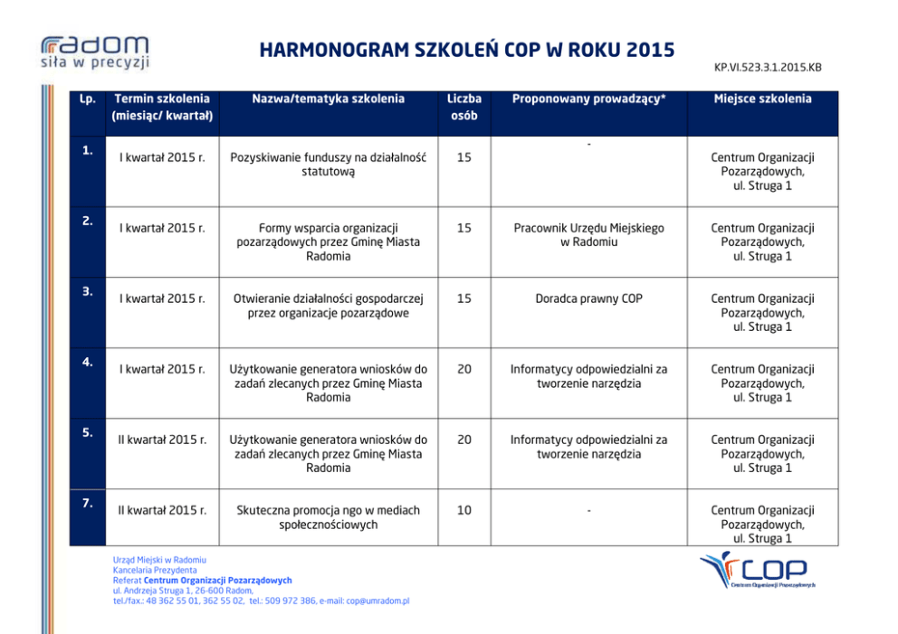 HARMONOGRAM SZKOLEŃ COP W ROKU 2015 KP.VI.523.3.1.2015.KB Lp. 1. 2. 3. 4. 5. 7. Termin szkolenia (miesiąc/ kwartał) Nazwa/tematyka szkolenia Liczba osób Proponowany prowadzący* Miejsce szkolenia I kwartał 2015 r. Pozyskiwanie funduszy na działalność statutową 15 I kwartał 2015 r. Formy wsparcia organizacji pozarządowych przez Gminę Miasta Radomia 15 Pracownik Urzędu Miejskiego w Radomiu Centrum Organizacji Pozarządowych, ul. Struga 1 I kwartał 2015 r. Otwieranie działalności gospodarczej przez organizacje pozarządowe 15 Doradca prawny COP Centrum Organizacji Pozarządowych, ul. Struga 1 I kwartał 2015 r. Użytkowanie generatora wniosków do zadań zlecanych przez Gminę Miasta Radomia 20 Informatycy odpowiedzialni za tworzenie narzędzia Centrum Organizacji Pozarządowych, ul. Struga 1 II kwartał 2015 r. Użytkowanie generatora wniosków do zadań zlecanych przez Gminę Miasta Radomia 20 Informatycy odpowiedzialni za tworzenie narzędzia Centrum Organizacji Pozarządowych, ul. Struga 1 II kwartał 2015 r. Skuteczna promocja ngo w mediach społecznościowych 10 - Centrum Organizacji Pozarządowych, ul. Struga 1 - Urząd Miejski w Radomiu Kancelaria Prezydenta Referat Centrum Organizacji Pozarządowych ul. Andrzeja Struga 1, 26-600 Radom, tel./fax.: 48 362 55 01, 362 55 02, tel.: 509 972 386, e-mail: [email protected] Centrum Organizacji Pozarządowych, ul. Struga 1 HARMONOGRAM SZKOLEŃ COP W ROKU 2015 KP.VI.523.3.1.2015.KB 8. 9. 10. 11. 12. II kwartał 2015 r. Warsztat doradczy: Wszystko co należy wiedzieć o statucie organizacji (zmiany statutu, organy statutowe) 5 Doradca prawny COP Centrum Organizacji Pozarządowych, ul. Struga 1 II kwartał 2015 r. Kontrola finansowa w ngo 10 Pracownik Urzędu Miejskiego w Radomiu Centrum Organizacji Pozarządowych, ul. Struga 1 III kwartał 2015 r. Warsztat doradczy: Rozliczanie zadań zlecanych przez Gminę Miasta Radomia 5 Pracownik Urzędu Miejskiego w Radomiu Centrum Organizacji Pozarządowych, ul. Struga 1 III kwartał 2015 r. Wolontariat w organizacji pozarządowej 10 - Centrum Organizacji Pozarządowych, ul. Struga 1 IV kwartał 2015 r. Pozyskiwanie środków unijnych – nowy okres programowania 5 - Centrum Organizacji Pozarządowych, ul. Struga 1 Harmonogram szkoleń COP w 2015 r. może ulec zmianie, w zależności od potrzeb organizacji pozarządowych. *Prowadzący szkolenie będzie wybierany w toku postępowania zgodnego z ustawą prawo zamówień publicznych oraz w oparciu o kryteria zawarte w „Księdze Standardów Usług Współpracy Gminy Miasta Radomia z Organizacjami Pozarządowymi”, według której: Urząd Miejski w Radomiu Kancelaria Prezydenta Referat Centrum Organizacji Pozarządowych ul. Andrzeja Struga 1, 26-600 Radom, tel./fax.: 48 362 55 01, 362 55 02, tel.: 509 972 386, e-mail: [email protected] HARMONOGRAM SZKOLEŃ COP W ROKU 2015 KP.VI.523.3.1.2015.KB Kadra szkoleniowa powinna spełniać następujące warunki: Warunki podstawowe: wykształcenie wyższe w dziedzinie odpowiadającej tematyce szkoleń, doświadczenie zawodowe w zakresie problematyki i zakresu szkolenia, Warunki pożądane: odbyte szkolenia podnoszące kwalifikacje zawodowe w zakresie funkcjonowania organizacji pozarządowych, potwierdzone certyfikatami, inne uprawnienia i osiągniecia istotne dla procesu szkoleniowego. doświadczenie w realizacji podobnych przedsięwzięć. Kompetencje techniczne i osobiste: znajomość metod dydaktycznych, znajomość narzędzi internetowych, obsługa urządzeń biurowych, wysoka orientacja na efekty pracy, umiejętność poszukiwania rozwiązań problemów, komunikatywność. Urząd Miejski w Radomiu Kancelaria Prezydenta Referat Centrum Organizacji Pozarządowych ul. Andrzeja Struga 1, 26-600 Radom, tel./fax.: 48 362 55 01, 362 55 02, tel.: 509 972 386, e-mail: [email protected]