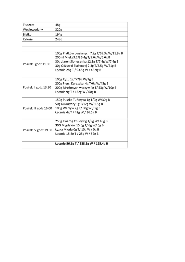 Tłuszcze 48g Węglowodany 320g Białko 194g Kalorie 2486 Posiłek