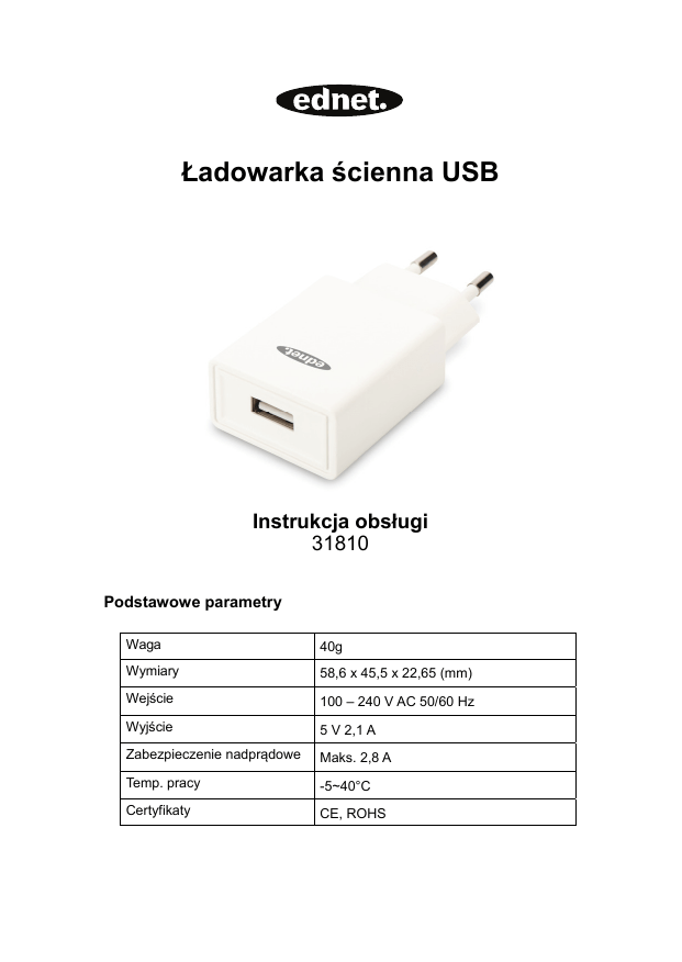 Ładowarka ścienna USB Instrukcja obsługi 31810 Podstawowe parametry Waga 40g Wymiary 58,6 x 45,5 x 22,65 (mm) Wejście 100 – 240 V AC 50/60 Hz Wyjście 5 V 2,1 A Zabezpieczenie nadprądowe Maks. 2,8 A Temp. pracy -5~40°C Certyfikaty CE, ROHS Metoda ładowania 1. Podłącz wtyczkę do gniazdka o napięciu 100-240 V. Ładowarka ścienna USB (31810) firmy ednet jest gotowa do użytku. 2. Podłącz przewód ładujący do wejścia USB A ładowarki. Przewód dostarczy zasilanie prądem stałym o napięciu do 5 V, 2,1 A Zgodność Ładowarka jest kompatybilna z urządzeniami iPad®/iPhone®, smartfonami/tabletami z systemem Android i innymi smartfonami, tabletami, przenośnymi głośnikami, kamerami itp. Konserwacja Aby przedłużyć cykl użytkowania produktu, należy postępować zgodnie z poniższymi wskazaniami: Przechowywać w suchym miejscu, z dala od wilgoci i substancji żrących. Nie rozkładać na części. Przechowywać w miejscu, które nie jest ani zbyt gorące, ani zbyt zimne. Nie stukać i nie uderzać w urządzenie. Wszystkie urządzenia pomyślnie przeszły testy i kontrolę jakości. W przypadku przegrzania, odkształcenia, uszkodzenia urządzenia lub w przypadku innych awarii, należy przestać korzystać z urządzenia i skontaktować się z agentem sprzedaży lub firmą ednet. Urządzenie nie może być utylizowane razem ze zwykłymi odpadami. Urządzenie musi zostać poddane recyklingowi. Wykorzystane symbole: Tylko do użytku domowego