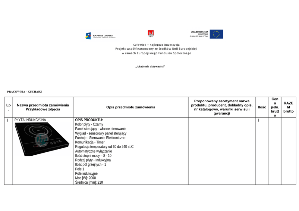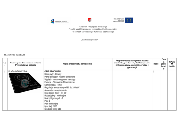 Człowiek – najlepsza inwestycja Projekt współfinansowany ze środków Unii Europejskiej „Akademia aktywności” w ramach Europejskiego Funduszu Społecznego „Akademia aktywności” PRACOWNIA - KUCHARZ Lp . 1 Nazwa przedmiotu zamówienia Przykładowe zdjęcia PŁYTA INDUKCYJNA Opis przedmiotu zamówienia OPIS PRODUKTU: Kolor płyty - Czarny Panel sterujący - własne sterowanie Wygląd - sensorowy panel sterujący Funkcje - Sterowanie Elektroniczne Komunikacja - Timer Regulacja temperatury od 60 do 240 st.C Automatyczne wyłączanie Ilość stopni mocy – 8 - 10 Rodzaj płyty - Indukcyjna Ilość pól grzejnych - 1 Pole 1 Pole indukcyjne Moc [W]: 2000 Średnica [mm]: 210 Proponowany asortyment nazwa produktu, producent, dokładny opis, nr katalogowy, warunki serwisu i gwarancji Ilość 1 Cen a jedn. brutt o RAZE M brutto Człowiek – najlepsza inwestycja Projekt współfinansowany ze środków Unii Europejskiej „Akademia aktywności” w ramach Europejskiego Funduszu Społecznego „Akademia aktywności” Techniczne Moc całkowita [W] – 2000 Gwarancja - minimum 24 m-ce; odbiór uszkodzonego sprzętu i dostarczenie po naprawie w ramach gwarancji w gestii sprzedającego 2 KUCHNIA ELEKTRYCZNA Dane techniczne - kuchnia elektryczna Wymiary (szer. x wys. x gł.) 60 x 85 x 60 cm Klasa energetyczna Minimum A Napięcie zasilania 400V Moc przyłączeniowa 8,5 kW Płyta grzewcza Rodzaj płyty grzewczej elektryczna Kolor płyty grzewczej czarny Pola grzewcze 4 pola ceramiczne Piekarnik Rodzaj piekarnika Kolor frontu piekarnika Pojemność Programator Liczba funkcji Grill (opiekacz) elektryczny srebrny 55 – 65 litrów elektroniczny Minimum 8 tak 2 Człowiek – najlepsza inwestycja Projekt współfinansowany ze środków Unii Europejskiej „Akademia aktywności” w ramach Europejskiego Funduszu Społecznego „Akademia aktywności” Termoobieg "Chłodne drzwi" piekarnika Wskaźnik ciepła resztkowego Wyposażenie tak tak w płycie grzewczej Minimum1 półka blaszana, 1 półka szklana, 1 półka siatkowa, instrukcja obsługi w języku polskim, 3 GARNKI DO PŁYTY INDUKCYJNEJ Gwarancja - minimum 24 m-ce; odbiór uszkodzonego sprzętu i dostarczenie po naprawie w ramach gwarancji w gestii sprzedającego Zestaw garnków ze stali nierdzewnej z uchwytami metalowymi JAKOŚC STALI NIERDZEWNEJ 18/10 , Parametry techniczne Liczba sztuk - 6 Średnice 24/20/18/16/14/24 cm (średnice garnków) Pojemności 5.5/3.2/2.2/1.6/1.0/2.5 l (pojemności garnków w litrach) 1 zestaw Człowiek – najlepsza inwestycja Projekt współfinansowany ze środków Unii Europejskiej „Akademia aktywności” w ramach Europejskiego Funduszu Społecznego „Akademia aktywności” Do kuchni ceramicznych, elektrycznych, indukcyjnych Rondel - tak Patelnia - tak Pokrywki szklane z uchwytami metalowymi Dno garnka – minimum potrójne Gwarancja - minimum 5 - 10 lat; odbiór uszkodzonego sprzętu i dostarczenie po naprawie w ramach gwarancji w gestii sprzedającego 4 5 Podgrzewacz do talerzy TERMOMETR GASTRONOMICZNY WRAZ Z SONDĄ • • • • Do ok. 65 °C Obudowa ze stali chromowanej Moc przyłączeniowa: 300 W / 230 V Urządzenie nie będzie przeznaczone do pracy ciągłej w zastosowaniu przemysłowym Podgrzewacz na 12 talerzy Gwarancja - minimum 24 m-ce; odbiór uszkodzonego sprzętu i dostarczenie po naprawie w ramach gwarancji w gestii sprzedającego • Zakres temperatury od -50 ºC do 300 ºC • Funkcja HOLD – zachowywanie temperatury chwilowej • Sonda ze stali nierdzewnej minimum 120 mm • Pomiar temperatury w ciągu sekundy • Samoczynne wyłączenie przyrządu po max 10 min 1 1 Człowiek – najlepsza inwestycja Projekt współfinansowany ze środków Unii Europejskiej „Akademia aktywności” w ramach Europejskiego Funduszu Społecznego „Akademia aktywności” • • 6 WAGA ELEKTRONICZNA 7 BLENDER Osłona sondy, szczelna z ergonomicznym uchwytem Jednostka pomiaru ºC lub ºF Gwarancja - minimum 24 m-ce; odbiór uszkodzonego sprzętu i dostarczenie po naprawie w ramach gwarancji w gestii sprzedającego Podstawowe cechy: Rodzaj wagi: Elektroniczna waga [g]: 4500 - 5000 Dokładność pomiaru: 1 g Gwarancja - minimum 24 m-ce; odbiór uszkodzonego sprzętu i dostarczenie po naprawie w ramach gwarancji w gestii sprzedającego Funkcja Turbo – tak Ilość prędkości – minimum 5 Pojemność miksera – minimum 0,75 l Konstrukcja - Długość przewodu [m]: minimum 1.3 Moc [W] – 700 Inne - Zabezpieczenie przed przegrzaniem Końcówka miksująca - Zdejmowana Stal nierdzewna Trzepaczka do ubijania – tak 1 1 Człowiek – najlepsza inwestycja Projekt współfinansowany ze środków Unii Europejskiej „Akademia aktywności” w ramach Europejskiego Funduszu Społecznego „Akademia aktywności” Pojemnik z ostrzem miksującym – duży i mały Dodatkowe wyposażenie - Kubek do miksowania minimum 1l z pokrywką Nóż do kruszenia lodu Gwarancja - minimum 24 m-ce; odbiór uszkodzonego sprzętu i dostarczenie po naprawie w ramach gwarancji w gestii sprzedającego 8 EKSPRES CIŚNIENIOWY Cechy produktu Ciśnieniowy system pompowania minimum 15 bar Moc: minimum 1600 W W pełni automatyczne przyrządzanie kawy zwykłej oraz espresso Funkcja spieniania mleka, funkcja gorąca woda Technologia dbająca o odpowiednią temperaturę parzonej kawy Systemem AromaPro Concept Skrócony czas podgrzewania Regulacja temperatury kawy: minimum 3-stopniowa Regulacja ilości kawy: od 7 do 10 g Młynek ceramiczny Regulacja stopnia zmielenia kawy: płynna Regulacja wysokości dystrybutora kawy 1 Człowiek – najlepsza inwestycja Projekt współfinansowany ze środków Unii Europejskiej „Akademia aktywności” w ramach Europejskiego Funduszu Społecznego „Akademia aktywności” Tekstowo-graficzny wyświetlacz LCD Podświetlane przyciski Wyjmowany pojemnik na wodę minimum 1.7 l Dwukrotne mielenie i parzenie kawy przy wyborze dwóch filiżanek Funkcja wstępnego zaparzania Czyszczenie przewodów po każdym parzeniu