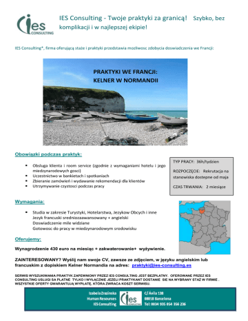 IES Consulting - Twoje praktyki za granicą! Szybko, bez komplikacji i w najlepszej ekipie! IES Consulting*, firma oferującą staże i praktyki przedstawia mozliwosc zdobycia doswiadczenia we Francji: PRAKTYKI WE FRANCJI: KELNER W NORMANDII Obowiązki podczas praktyk: TYP PRACY: 36h/tydzien Obsluga klienta i room service (zgodnie z wymaganiami hotelu i jego miedzynarodowych gosci) Uczestnictwo w bankietach i spotkaniach Zbieranie zamówień i wydawanie rekomendacji dla klientów Utrzymywanie czystosci podczas pracy ROZPOCZĘCIE: Rekrutacja na stanowiska dostepne od maja CZAS TRWANIA: 2 miesiące Wymagania: Studia w zakresie Turystyki, Hotelarstwa, Jezykow Obcych i inne Jezyk francuski sredniozaawansowany + angielski Doswiadczenie mile widziane Gotowosc do pracy w miedzynarodowym srodowisku Oferujemy: Wynagrodzenie 430 euro na miesiąc + zakwaterowanie+ wyŜywienie. ZAINTERESOWANY? Wyślij nam swoje CV, zawsze ze zdjęciem, w języku angielskim lub francuskim z dopiskiem Kelner Normandia na adres: [email protected] SERWIS WYSZUKIWANIA PRAKTYK ZAPEWNIONY PRZEZ IES CONSULTING JEST BEZPŁATNY. OFEROWANE PRZEZ IES CONSULTING USLUGI SA PLATNE TYLKO I WYŁĄCZNIE JEZELI PRAKTYKANT DOSTANIE SIE NA WYBRANY STAś W FIRMIE . WSZYSTKIE OFERTY GWARANTUJĄ WYPŁATĘ, KTÓRA ZWRACA KOSZT SERWISU.