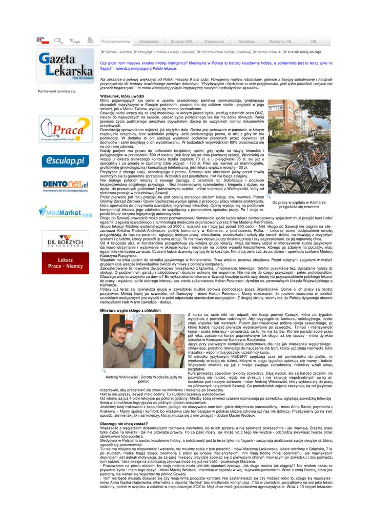 Gazeta Lekarska Przegląd numerów Gazety Lekarskiej Rocznik 2004 Gazety Lekarskiej Numer 2004-03 O krok bliżej do raju Czy grozi nam masowy exodus młodej inteligencji? Medycyna w Polsce to bardzo kosztowne hobby, a solidarność jest tu teraz tylko na flagach - twierdzą emigrujący z Polski lekarze. Partnerami serwisu są: Na obszarze o połowę większym od Polski mieszka 9 mln ludzi. Powojenny napływ robotników, głównie z Europy południowej i Finlandii, przyczynił się do budowy szwedzkiego państwa dobrobytu. "Przybywajcie i będziecie tu mile przyjmowani, jeśli tylko potraficie uczynić nas jeszcze bogatszymi" - to motto dzisiejszej polityki imigracyjnej naszych nadbałtyckich sąsiadów. Wizerunek, który uwodzi Mimo pojawiających się opinii o upadku szwedzkiego państwa opiekuńczego, gnębiącego obywateli najwyższymi w Europie podatkami, pacjent ma się całkiem nieźle i pogłoski o jego śmierci, jak u Marka Twaina, wydają się mocno przesadzone. Szwecję nadal uważa się za kraj modelowy, w którym jakość życia, według ostatnich ocen ONZ, należy do najwyższych na świecie. Jakość życia politycznego też nie ma sobie równych. Pełna jawność życia publicznego umożliwia obywatelom dostęp do wszystkich niemal dokumentów urzędowych. Demokrację sprowadzono najniżej, jak się tylko dało. Gmina jest państwem w państwie, w którym rządzą nie urzędnicy, lecz wybieralni politycy. Jeśli przestrzegają prawa, to nikt z góry im nie podskoczy. W dodatku to oni ustalają wysokość podatków płaconych przez obywateli od dochodów i sami decydują o ich wydatkowaniu. W budżetach wojewódzkich 89% przeznacza się na ochronę zdrowia. Każdy pacjent ma prawo do całkowicie bezpłatnej opieki, gdy wyda na wizyty lekarskie i pielęgnacyjne w przeliczeniu 500 zł rocznie (rok liczy się od dnia pierwszej opłaty). Wcześniej za wizytę u lekarza pierwszego kontaktu trzeba zapłacić 70 zł, a u pielęgniarki 35 zł, ale już u specjalisty i za poradę w szpitalnej izbie przyjęć - 130 zł. Płaci się również za mammografię, profilaktykę ginekologiczną i konsultację telefoniczną, jeśli lekarz wypisze receptę - 30 zł. Przybysza z obcego kraju, schodzącego z promu, Szwecja wita obrazkiem jakby przed chwilą skończyło się tu generalne sprzątanie. Wszystko jest poukładane, nikt nie biega zziajany. Nie brakuje polskich lekarzy z nowego zaciągu, z ostatnich lat. Stabilizacja i poczucie bezpieczeństwa socjalnego przyciąga. - Bez bezsensownej szamotaniny i biegania z dyżuru na dyżur, do prywatnych gabinetów i państwowych szpitali - mówi internista z Wielkopolski, który od niedawna pracuje w południowej Szwecji. Przez pierwsze pół roku pracuje się pod opieką starszego stażem kolegi, tzw. mentora. Potem Główny Zarząd Zdrowia i Opieki Społecznej wydaje opinię z przebiegu pracy lekarza-praktykanta, Do pracy w szpitalu w Kalmarze która upoważnia do otrzymania szwedzkiej legitymacji lekarskiej. Opinię wydaje się na podstawie przyjeżdża się rowerem kompetencji lekarza, jego zdolności do współpracy z personelem, sposobu pracy. Po 1 maja br. polski lekarz otrzyma legitymację automatycznie. Droga do Szwecji prowadzić może przez podwarszawski Konstancin, gdzie każdy lekarz zainteresowany wyjazdem musi przejść kurs i zdać egzamin z języka szwedzkiego z terminologią medyczną organizowany przez firmę Medena Rek Polska. Grupa lekarzy Medeny systematycznie od 2000 r. rozrasta się i liczy już ponad 200 osób. - Nikt nikogo do Szwecji nie ciągnie na siłę zauważa Kristina Podolak-Andersson, polityk komunalny w Kalmarze, z pochodzenia Polka. - Lekarze przed podpisaniem umowy przyjeżdżają do nas na parę dni, oglądają miejsca pracy, mieszkania, przedszkola i szkoły dla swoich dzieci, rozmawiają z przyszłymi szefami i z ludźmi, którzy przeszli tę samą drogę. Te rozmowy decydują czy dostaną pracę i czy są przekonani, że jej naprawdę chcą. Od 4 listopada ub.r. w Konstancinie przygotowuje się kolejna grupa lekarzy. Mają darmowy udział w intensywnym kursie językowym, darmowe utrzymanie i wyżywienie w okresie kursu i niezłe jak na polskie warunki kieszonkowe, którego po zdanym na początku maja egzaminie nie trzeba zwracać. Czasem ludzie dzwonią i pytają ile to kosztuje. Nie chcą uwierzyć, że za darmo - opowiada szefowa Medeny Katarzyna Raczyńska. Wpadam na kilka godzin do ośrodka językowego w Konstancinie. Trwa właśnie przerwa obiadowa. Przed kolejnymi zajęciami w małych grupach ktoś jeszcze indywidualnie ćwiczy wymowę z pomocą komputera. Zakwaterowanie to nowiutkie dwupokojowe mieszkanko z łazienką, umeblowane, telewizor i telefon oczywiście też. Sprzątanie należy do obsługi. O podziemnym garażu i całodobowym dozorze ochrony nie wspomnę. Nie ma się do czego przyczepić - pełen profesjonalizm! Dlaczego więc to wszystko za darmo? Bo wykształcenie lekarza w Szwecji kosztuje sześć razy drożej niż przysposobienie polskiego lekarza do pracy - wyjaśnia tajniki dobrego interesu bez cienia zażenowania Hakan Petersson, dyrektor ds. personalnych Urzędu Wojewódzkiego w Kalmarze. Polacy już teraz są największą grupą w szwedzkiej służbie zdrowia pochodzącą spoza Skandynawii. Opinie o ich pracy są bardzo pozytywne. Mówią lepiej po szwedzku niż Duńczycy - mówi Hakan Petersson. Mamy rozeznanie, że poziom nauczania w polskich uczelniach medycznych jest wysoki i w pełni odpowiada standardom europejskim. Z drugiej strony, wiemy też, że Polska dysponuje obecnie nadwyżkami kadr w tym zawodzie - dodaje. Mikstura węgierskiego z chińskim Z kursu na razie nikt nie odpadł, nie licząc pewnej Czeszki, która po tygodniu wyjechała z powodów rodzinnych. Aby przystąpić do konkursu selekcyjnego, trzeba znać angielski lub niemiecki. Potem jest dwudniowa próbna lekcja szwedzkiego, po której trzeba napisać pierwsze wypracowanie po szwedzku. Tempo i intensywność
