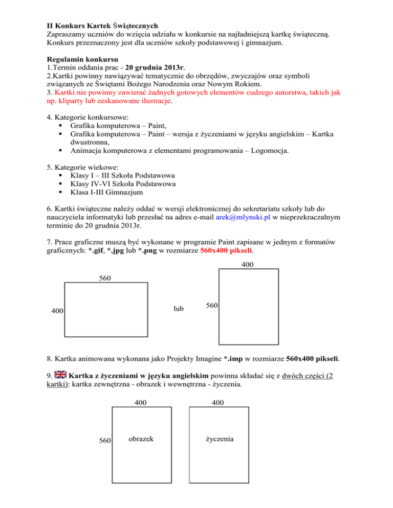 II Konkurs Kartek Świątecznych Zapraszamy uczniów do wzięcia udziału w konkursie na najładniejszą kartkę świąteczną. Konkurs przeznaczony jest dla uczniów szkoły podstawowej i gimnazjum. Regulamin konkursu 1.Termin oddania prac - 20 grudnia 2013r. 2.Kartki powinny nawiązywać tematycznie do obrzędów, zwyczajów oraz symboli związanych ze Świętami BoŜego Narodzenia oraz Nowym Rokiem. 3. Kartki nie powinny zawierać Ŝadnych gotowych elementów cudzego autorstwa, takich jak np. kliparty lub zeskanowane ilustracje. 4. Kategorie konkursowe: Grafika komputerowa – Paint, Grafika komputerowa – Paint – wersja z Ŝyczeniami w języku angielskim – Kartka dwustronna, Animacja komputerowa z elementami programowania – Logomocja. 5. Kategorie wiekowe: Klasy I – III Szkoła Podstawowa Klasy IV-VI Szkoła Podstawowa Klasa I-III Gimnazjum 6. Kartki świąteczne naleŜy oddać w wersji elektronicznej do sekretariatu szkoły lub do nauczyciela informatyki lub przesłać na adres e-mail [email protected] w nieprzekraczalnym terminie do 20 grudnia 2013r. 7. Prace graficzne muszą być wykonane w programie Paint zapisane w jednym z formatów graficznych: *.gif, *.jpg lub *.png w rozmiarze 560x400 pikseli. 400 560 lub 400 560 8. Kartka animowana wykonana jako Projekty Imagine *.imp w rozmiarze 560x400 pikseli. Kartka z Ŝyczeniami w języku angielskim powinna składać się z dwóch części (2 9. kartki): kartka zewnętrzna - obrazek i wewnętrzna - Ŝyczenia. 560 400 400 obrazek 560 Ŝyczenia 10. Pliki naleŜy nazywać według następujących zasad: małe litery, bez polskich znaków diakrytycznych, bez spacji, według wzorów imie_nazwisko.jpg, imie_nazwisko.gif, imie_nazwisko.imp. W wersji angielskiej (2 pliki): obrazek - imie_nazwisko1.jpg Ŝyczenia - imie_nazwisko2.jpg 12. KaŜdy uczeń moŜe nadesłać max. po jednej pracy z danej kategorii. Ogłoszenie wyników konkursu odbędzie się w styczniu 2014 roku na stronie szkoły www.otrebusy.edu.pl . Kartki będą oceniane przez komisję konkursową, powołaną przez dyrektora szkoły. Najlepsze prace zostaną wyróŜnione i nagrodzone. Kryteria oceny: 1. Oryginalność, pomysłowość, pracochłonność, estetyka wykonania. 2. Stopień nawiązania do tradycji. 3. Poprawność językowa. Uwagi końcowe: 1.Przesłanie pracy oznacza akceptację regulaminu. 2.Kartki nadesłane na konkurs przechodzą na własność Organizatorów 3.Organizatorzy zastrzegają sobie prawo dowolnego wykorzystania nadesłanych prac w całości lub części. 4. Organizator zastrzega sobie prawo do interpretacji niniejszego regulaminu. Konsultacje i pomoc merytoryczna: 1. Język angielski – p. Arleta Kowalska 2. Informatyka – p. Arkadiusz Młyński