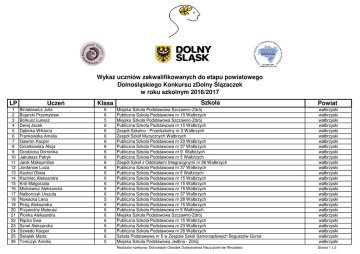 Wykaz uczniów zakwalifikowanych do etapu powiatowego Dolnośląskiego Konkursu zDolny Ślązaczek w roku szkolnym 2016/2017 LP 1 2 3 4 5 6 7 8 9 10 11 12 13 14 15 16 17 18 19 20 21 22 23 24 25 26 Uczeń Biniakiewicz Julia Bojarski Przemysław Borkusz Łukasz Derej Jacek Dębicka Wiktoria Frankowska Amelia Gawron Kacper Gniatkowska Alicja Grodzicka Dominika Jakubasz Patryk Janik Maksymilian Jordanow Luiza Kachel Oliwia Kaziniec Aleksandra Król Małgorzata Mickiewicz Aleksandra Nalborczyk Urszula Nowacka Lena Piróg Aleksandra Przywoźny Mateusz Płonka Aleksandra Rącka Ewa Sznel Aleksandra Szwedo Kacper Świątek Marta Tomczyk Amelia Klasa 6 6 5 6 6 6 6 6 6 6 6 6 6 6 6 6 6 5 6 6 6 6 6 6 6 5 Szkoła Powiat Miejska Szkoła Podstawowa Szczawno-Zdrój Publiczna Szkoła Podstawowa nr 15 Wałbrzych Miejska Szkoła Podstawowa Szczawno-Zdrój Publiczna Szkoła Podstawowa nr 15 Wałbrzych Zespół Szkolno - Przedszkolny nr 3 Wałbrzych Zespół Szkół Muzycznych Wałbrzych Publiczna Szkoła Podstawowa nr 23 Wałbrzych Publiczna Szkoła Podstawowa nr 37 Wałbrzych Publiczna Szkoła Podstawowa nr 9 Wałbrzych Publiczna Szkoła Podstawowa nr 5 Wałbrzych Zespół Szkół z Oddziałami Integracyjnymi nr 26 Wałbrzych Publiczna Szkoła Podstawowa nr 37 Wałbrzych Publiczna Szkoła Podstawowa nr 5 Wałbrzych Publiczna Szkoła Podstawowa nr 15 Wałbrzych Publiczna Szkoła Podstawowa nr 15 Wałbrzych Publiczna Szkoła Podstawowa nr 15 Wałbrzych Publiczna Szkoła Podstawowa nr 37 Wałbrzych Publiczna Szkoła Podstawowa nr 28 Wałbrzych Publiczna Szkoła Podstawowa nr 15 Wałbrzych Publiczna Szkoła Podstawowa nr 5 Wałbrzych Miejska Szkoła Podstawowa Szczawno-Zdrój Publiczna Szkoła Podstawowa nr 15 Wałbrzych Publiczna Szkoła Podstawowa nr 23 Wałbrzych Publiczna Szkoła Podstawowa nr 28 Wałbrzych Szkoła Podstawowa nr 5 w Zespole Szkół Samorządowych Boguszów-Gorce Miejska Szkoła Podstawowa Jedlina - Zdrój wałbrzyski wałbrzyski wałbrzyski wałbrzyski wałbrzyski wałbrzyski wałbrzyski wałbrzyski wałbrzyski wałbrzyski wałbrzyski wałbrzyski wałbrzyski wałbrzyski wałbrzyski wałbrzyski wałbrzyski wałbrzyski wałbrzyski wałbrzyski wałbrzyski wałbrzyski wałbrzyski wałbrzyski wałbrzyski wałbrzyski Realizator konkursu: Dolnośląski Ośrodek Doskonalenia Nauczycieli we Wrocławiu Strona 1 z 2 Wykaz uczniów zakwalifikowanych do etapu powiatowego Dolnośląskiego Konkursu zDolny Ślązaczek w roku szkolnym 2016/2017 27 Woszczek Kacper 28 Wyszowska Zofia 29 Żałobka Krzysztof 6 6 6 Publiczna Szkoła Podstawowa Mieroszów Publiczna Szkoła Podstawowa nr 28 Wałbrzych Publiczna Szkoła Podstawowa nr 28 Wałbrzych wałbrzyski wałbrzyski wałbrzyski Realizator konkursu: Dolnośląski Ośrodek Doskonalenia Nauczycieli we Wrocławiu Strona 2 z 2