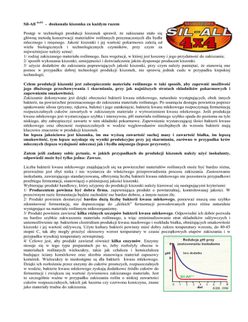 Sil-All 4x4® - doskonała kiszonka za kaŜdym razem Postęp w technologii produkcji kiszonek sprawił, Ŝe zakiszanie stało się główną metodą konserwacji materiałów roślinnych przeznaczonych dla bydła mlecznego i mięsnego. Jakość kiszonki i jej wartość pokarmowa zaleŜą od wielu biologicznych i technologicznych czynników, przy czym za najwaŜniejsze naleŜy uznać: 1/ rodzaj zakiszanego materiału roślinnego, faza wegetacji, w której jest koszony i jego przydatność do zakiszania; 2/ sposób wykonania kiszonki, umiejętności i doświadczenie jakim dysponuje producent kiszonki. 3/ uŜycie dodatków do zakiszania poprawiających jakość kiszonki, przy czym naleŜy pamiętać, Ŝe stanowią one pomoc w przypadku dobrej technologii produkcji kiszonek, nie sprawią jednak cudu w przypadku kiepskiej technologii. Celem produkcji kiszonki jest zabezpieczenie materiału roślinnego w taki sposób, aby zapewnić moŜliwość jego dłuŜszego przechowywania i skarmiania, przy jak najniŜszych stratach składników pokarmowych i zapewnieniu smakowitości. Zakiszanie dokonywane jest dzięki obecności bakterii kwasu mlekowego, naturalnie występujących, obok innych bakterii, na powierzchni przeznaczonego do zakiszenia materiału roślinnego. Po usunięciu dostępu powietrza poprzez upakowanie silosu (pryzmy, rękawa, balotu) i jego zamknięcie, bakterie kwasu mlekowego rozpoczynają fermentację rozpuszczalnych cukrów zawartych w zakiszanym materiale z wytworzeniem kwasu mlekowego. Jeśli produkcja kwasu mlekowego jest wystarczająco szybka i intensywna, pH materiału roślinnego szybko spada do poziomu na tyle niskiego, aby zabezpieczyć zawarte w nim składniki pokarmowe. Zapewnienie wystarczającej ilości bakterii kwasu mlekowego oraz obecność rozpuszczalnych w wodzie węglowodanów niezbędnych do wzrostu bakterii mają kluczowe znaczenie w produkcji kiszonek. Im lepsza jakościowo jest kiszonka, im ma wyŜszą zawartość suchej masy i zawartość białka, im lepszą smakowitość, tym lepsze uzyskuje się wyniki produkcyjne przy jej skarmianiu, zarówno w przypadku krów mlecznych (lepsza wydajność mleczna) jak i bydła mięsnego (lepsze przyrosty). Zatem jeśli zadamy sobie pytanie, w jakich przypadkach do produkcji kiszonek naleŜy uŜyć inokulanty, odpowiedź moŜe być tylko jedna: Zawsze. Liczba bakterii kwasu mlekowego znajdujących się na powierzchni materiałów roślinnych moŜe być bardzo róŜna, przewaŜnie jest zbyt niska i nie wystarcza do właściwego przeprowadzenia procesu zakiszania. Zastosowanie inokulanta, zawierającego standaryzowaną, olbrzymią liczbę bakterii kwasu mlekowego nie pozostawia przypadkowi przebiegu fermentacji, stanowiącej o późniejszej jakości kiszonki. Wybierając produkt handlowy, który uŜyjemy do produkcji kiszonki naleŜy kierować się następującymi kryteriami: 1/ Producentem powinna być dobra firma, zapewniająca produkt o powtarzalnej, kontrolowanej jakości. W przeciwnym razie fermentacja będzie zachodzić raz bardzo dobrze, a innym razem źle. 2/ Produkt powinien dostarczyć bardzo duŜą liczbę bakterii kwasu mlekowego, poniewaŜ muszą one szybko zdominować fermentację, nie dopuszczając do „dzikich” fermentacji powodowanych przez róŜne naturalnie występujące na materiale roślinnym mikroorganizmy. 3/ Produkt powinien zawierać kilka róŜnych szczepów bakterii kwasu mlekowego. Odpowiedni ich dobór pozwala na bardzo szybkie zakwaszenie materiału roślinnego, a więc zminimalizowanie strat składników odŜywczych i uniemoŜliwienie np. bakteriom clostridium produkcji kwasu masłowego i rozkładu białka, obniŜających smakowitość kiszonki i jej wartość odŜywczą. UŜyte kultury bakterii powinny mieć dobry zakres temperatury wzrostu, do 40-45 stopni C, tak aby mogły przeŜyć okresowy wzrost temperatury w czasie początkowych etapów zakiszania i w przypadku wysokiej temperatury zewnętrznej. 4/ Celowe jest, aby produkt zawierał równieŜ kilka enzymów. Enzymy stosuje się w tego typu preparatach po to, Ŝeby rozłoŜyły obecne w materiałach roślinnych wielocukry, takie jak celuloza i hemiceluloza budujące ściany komórkowe oraz skrobia stanowiąca materiał zapasowy komórek. Wielocukry te niedostępne są dla bakterii kwasu mlekowego. Dzięki ich rozłoŜeniu przez enzymy do cukrów prostszych, rozpuszczalnych w wodzie, bakterie kwasu mlekowego zyskują dodatkowe źródło cukrów do fermentacji i zwiększa się wartość Ŝywieniowa zakiszanego materiału. Jest to szczególnie waŜne w przypadku zakiszania roślin o niskiej zawartości cukrów rozpuszczalnych, takich jak lucerna czy czerwona koniczyna, znane jako materiały trudne do zakiszenia. Produktem handlowym spełniającym wszystkie te kryteria jest Sil-All 4x4 (zawiera 4 szczepy bakterii i 4 enzymy), którego producentem jest firma Alltech®. Alltech sprzedaje swoje produkty do ponad 80 krajów na 5 kontynentach. Posiada własne centra badawcze, współpracuje z wieloma uczelniami i ośrodkami badawczymi na całym świecie. KaŜda partia wyprodukowanego towaru podlega kontroli jakościowej. Kontrola kiszonki. Sil-All4x4 firmy Alltech został stworzony na bazie czterech szczepów bakterii produkujących kwas mlekowy oraz czterech enzymów, aby zapewnić najwyŜszą jakość kiszonki. Jest to moŜliwe dzięki poprawie fermentacji oraz zwiększeniu wartości odŜywczej zakiszanych surowców. Sil-All4x4 efektywnie działa w róŜnych warunkach i pozwala na zachowanie kontroli nad procesem fermentacji. Szczególnie jedna z bakterii, Lactobacillus salivarius, zapewnia właściwą fermentację w esktremalnych warunkach, w szerokim zakresie temperatur i pH, tak więc stosując Sil-All4x4 moŜna być pewnym, Ŝe w kaŜdych warunkach uzyska się doskonałą jakość kiszonki. Rola bakterii. Bakterie w inokulantach do kiszonek przetwarzają cukry na kwas mlekowy. Jakość kiszonki zaleŜy od szybkości i efektywności ich dz