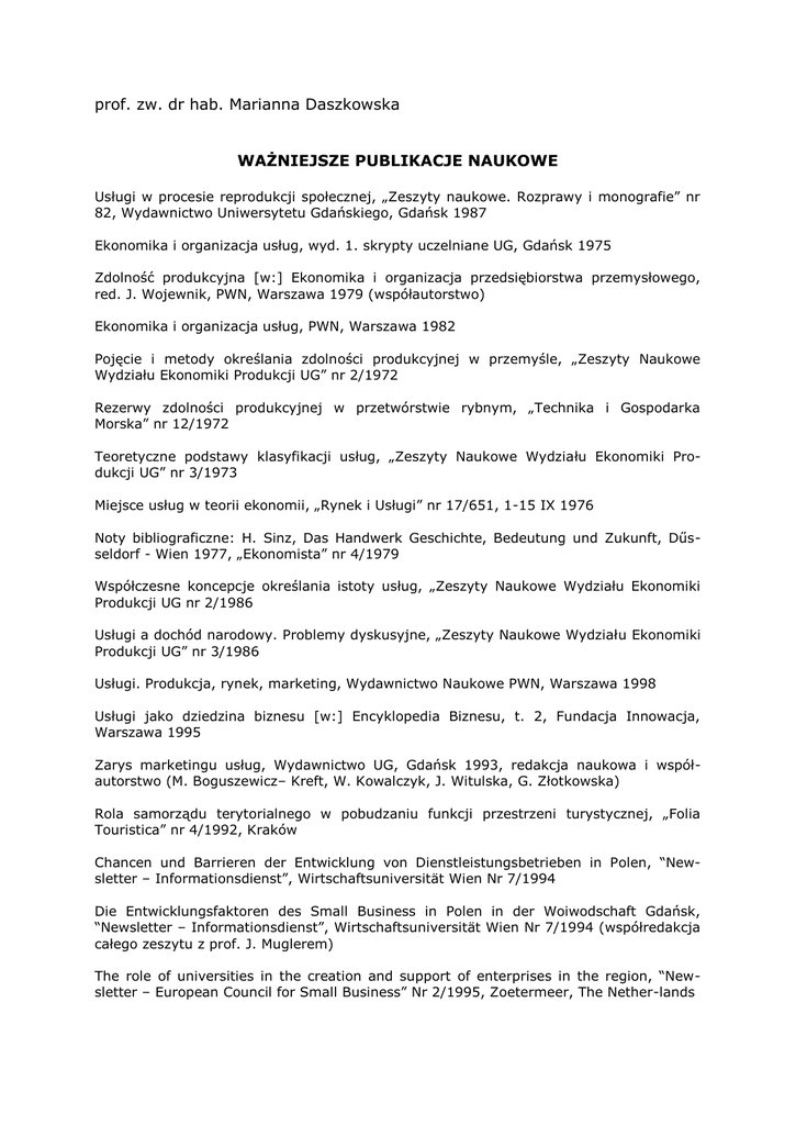 Zarys marketingu usług, Wydawnictwo UG, Gdańsk 1993, redakcja naukowa i współautorstwo (M. Boguszewicz– Kreft, W. Kowalczyk, J. Witulska, G. Złotkowska)