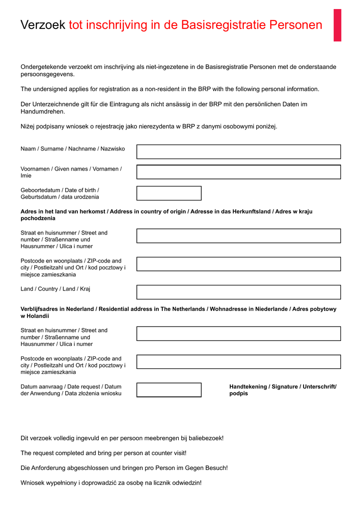 Verzoek tot inschrijving in de Basisregistratie Personen Ondergetekende verzoekt om inschrijving als niet-ingezetene in de Basisregistratie Personen met de onderstaande persoonsgegevens. The undersigned applies for registration as a non-resident in the BRP with the following personal information. Der Unterzeichnende gilt für die Eintragung als nicht ansässig in der BRP mit den persönlichen Daten im Handumdrehen. Niżej podpisany wniosek o rejestrację jako nierezydenta w BRP z danymi osobowymi poniżej. Naam / Surname / Nachname / Nazwisko Voornamen / Given names / Vornamen / Imie Geboortedatum / Date of birth / Geburtsdatum / data urodzenia Adres in het land van herkomst / Address in country of origin / Adresse in das Herkunftsland / Adres w kraju pochodzenia Straat en huisnummer / Street and number / Straßenname und Hausnummer / Ulica i numer Postcode en woonplaats / ZIP-code and city / Postleitzahl und Ort / kod pocztowy i miejsce zamieszkania Land / Country / Land / Kraj Verblijfsadres in Nederland / Residential address in The Netherlands / Wohnadresse in Niederlande / Adres pobytowy w Holandii Straat en huisnummer / Street and number / Straßenname und Hausnummer / Ulica i numer Postcode en woonplaats / ZIP-code and city / Postleitzahl und Ort / kod pocztowy i miejsce zamieszkania Datum aanvraag / Date request / Datum der Anwendung / Data złożenia wniosku Dit verzoek volledig ingevuld en per persoon meebrengen bij baliebezoek! The request completed and bring per person at counter visit! Die Anforderung abgeschlossen und bringen pro Person im Gegen Besuch! Wniosek wypełniony i doprowadzić za osobę na licznik odwiedzin! Handtekening / Signature / Unterschrift/ podpis