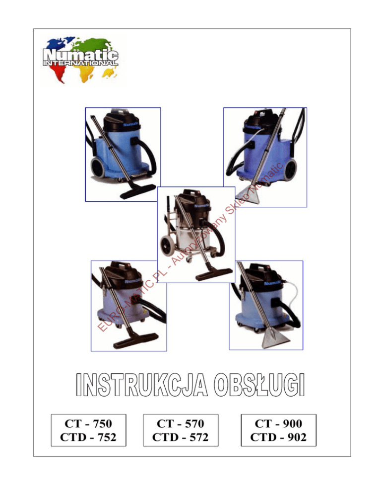 at ic N um ep Sk l y an ow yz or ut -A L IC .P AT -M O EU R CT - 750 CTD - 752 CT - 570 CTD - 572 CT - 900 CTD - 902 Szanowni Państwo ! Dziękujemy za zaufanie i zakup urządzenia Firmy „NUMATIC” N um at ic Przekazujemy Państwu wyrób spełniający wysokie wymogi jakościowe i eksploatacyjne. Przekazane urządzenie jest wyrobem nowoczesnym i łatwym w obsłudze. ut or yz ow an y Sk l ep Niniejsza instrukcja obsługi pozwoli na szybkie i dokładne zaznajomienie się z warunkami pracy urządzenia. Instrukcja jest integralną częścią maszyny. Ważnym jest, by znajdowała się ona zawsze w posiadaniu użytkownika urządzenia. EU R O -M AT IC .P L -A Prosimy o dokładne i wnikliwe zapoznanie się z treścią instrukcji ze szczególnym uwzględnieniem uwag i zaleceń producenta wyrobu a zwłaszcza zaleceń dotyczących bezpieczeństwa użytkowania. Firma „ NUMATIC„ , zastrzega sobie możliwość dokonywania zmian w konstrukcji, mających na celu podwyższenie walorów technicznych i użytkowych wyrobu. PRZED ROZPOCZĘCIEM UŻYTKOWANIA: Instrukcja bezpieczeństwa Przeczytaj dokładnie poniższe instrukcje i zachowaj je dla celów informacyjnych. Usunięcie opakowania i kontrola urządzenia: or yz ow an y Sk l ep N um at ic Po rozpakowaniu urządzenia, należy sprawdzić czy nie zostało ono uszkodzone w czasie transportu oraz czy wszystkie elementy wyposażenia są w komplecie z maszyna. W przypadku zaistnienia jakichkolwiek wątpliwości nie wolno uruchamiać maszyny. Należy wówczas skontaktować się z dystrybutorem firmy Numatic. Nieprzestrzeganie instrukcji może łączyć się zagrożeniem życia i mienia. Jeśli urządzenie wykazuje uszkodzenia powstałe podczas transportu, nie należy go uruchamiać. Należy się zwrócić do serwisu lub sprzedawcy towaru. Opakowanie jest w 100% wykonane z materiałów nadających się na surowce wtórne i jest oznakowane symbolem surowców wtórnych. L -A ut W przypadku jakichkolwiek wątpliwości należy się zwrócić do sprzedawcy. O -M AT IC .P UWAGA: Opakowanie odkurzacza (torebki plastikowe, spinacze itd.) może stanowić potencjalne zagrożenie i dlatego powinno być trzymane z dala od dzieci i osób trzecich. Akcesoria odkurzacza znajdują się w wewnątrz opakowania. EU R DYSTRYBUTOR : PRODUCENT : Numatic International Chard Somerset , TA 200 2GB Wielka Brytania UWAGA: Nie wolno odkurzać płonących lub gorących materiałów. Nie wolno zasysać rozpuszczalników, substancji toksycznych, palnych lub wybuchowych oraz silnie żrących kwasów. O -M AT IC .P L -A ut or yz ow an y Sk l ep N um at ic - Przed podłączeniem maszyny do prądu należy sprawdzić, czy napięcie w sieci zasilającej odpowiada napięciu podanemu na tabliczce znamionowej odkurzacza. - Odkurzacz powinien być używany tylko zgodnie z jego przeznaczeniem tzn. do czyszczenia na mokro. Używanie maszyny do innych celów jest zarówno niewłaściwe i niebezpieczne. - Po podłączeniu odkurzacza do prądu, nie wolno trzymać dyszy,ssawy blisko wrażliwych części ciała, takich jak oczy, usta, uszy itd. - Odkurzacza nie powinno się nigdy pozostawiać bez nadzoru w obecności dzieci lub osób trzecich. - Należy pamiętać o wyjęciu wtyku zasilania z gniazda w czasie, gdy maszyna nie jest używana. - Nie wolno podnosić odkurzacza za przewód ani wyszarpywać wtyczki z gniazda. - Przed użyciem należy sprawdzić wszystkie przewody. Nie wolno używać wadliwych przewodów. - Jeżeli używane sa przewody przedłużające, ich połączenia powinny być suche i trzymane z dala od wilgotnych powierzchni. - Należy pamiętać o odłączeniu odkurzacza od prądu przed otwarciem go w celu konserwacji, etc. Odkurzacza nie powinno się nigdy zanurzać w wodzie. Nie wolno używać rozpuszczalników ani silnych detergentów. - Nie wolno używać odkurzacza w miejscach nasyconych gazem (niebezpieczeństwo wybuchu). Producent nie odpowiada za obrażenia osób i zwierząt oraz zniszczenia obiektów spowodowane niewłaściwym lub nieracjonalnym używaniem odkurzacza lub nieprzestrzeganiem instrukcji EU R 1. Podłączenie elektryczne urządzenia: Należy przestrzegać obowiązujących lokalnych przepisów Zakładu Energetycznego. Zgodnie z przepisami uziemienie urządzenia zależy od zastosowanego przy nim przewodu zasilającego. Przed przystąpieniem do jakiejkolwiek czynności czyszczenia lub konserwacyjnych, należy wyciągnąć wtyczkę z gniazdka sieciowego. KABEL ZASILAJACY MOŻE BYĆ WYMIENIANY WYŁĄCZNIE PRZEZ WYKWALIFKOWANEGO SERWISANTA. OPIS URZĄDZENIA: W skład urządzenia wchodzą: yz ow an y Sk l ep - instrukcja obsługi - karta gwarancyjna (okres gwarancji: 24m-cy) - opakowanie N um at ic - odkurzacz z przewodem zasilającym - zestaw akcesoriów kit : * wąż 2 m Nuflex * rury połączeniowe 3 elementowe * filtr workowy do odkurzania na sucho * ssawka na mokro * dysz natryskowa do tapicerki i powierzchni płaskich * wąż do ekstraktora EU R O -M AT IC .P L -A ut or Każde urządzenie ma własny numer identyfikacyjny, umieszczony na tabliczce znamionowej znajdującej się głowicy odkurzacza i karcie gwarancyjnej. Wypełniona karta gwarancyjna jest wymagana w przypadku naprawy gwarancyjnego urządzenia. Tabliczka jest jedynym uznawanym przez producenta świadectwem identyfikacyjnym urządzenia i zawiera wszystkie dane pozwalające udzielać producentowi ( serwisowi) wszelkich informacji technicznych oraz ułatwiające nabywanie części zamiennych. Należy uważać, aby nie uległa ona zniszczeniu. at ic N um ep Odblokowanie zamocowania głowicy poprzez odciągniecie zamocowania. Zamkniecie głowicy następuje poprzez naciśniecie dzwigni zamocowania. EU R O -M AT IC .P L -A ut or yz ow an y Sk l Standardowy zestaw ssawek dostarczany z odkurzaczem KIT AA 14 (wąż NVA 3 B, rury chromowane NVA 9D, ssawka do tapicerki NVA 25 B, ssawka do wykładzin NVA 23 D). Łączenie akcesoriów poprzez złożenie węża ssącego z rurą chromowaną. Połączenie węża natrys
