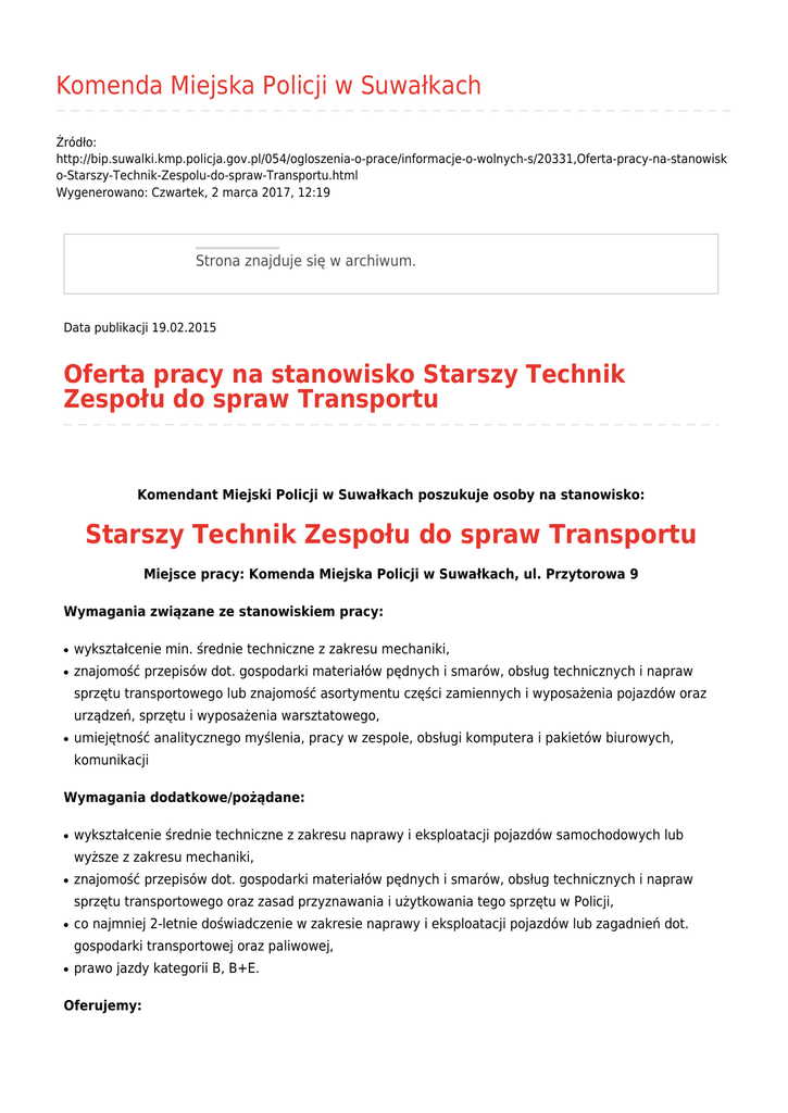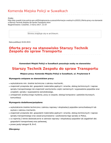 Komenda Miejska Policji w Suwałkach Źródło: http://bip.suwalki.kmp.policja.gov.pl/054/ogloszenia-o-prace/informacje-o-wolnych-s/20331,Oferta-pracy-na-stanowisk o-Starszy-Technik-Zespolu-do-spraw-Transportu.html Wygenerowano: Czwartek, 2 marca 2017, 12:19 Strona znajduje się w archiwum. Data publikacji 19.02.2015 Oferta pracy na stanowisko Starszy Technik Zespołu do spraw Transportu Komendant Miejski Policji w Suwałkach poszukuje osoby na stanowisko: Starszy Technik Zespołu do spraw Transportu Miejsce pracy: Komenda Miejska Policji w Suwałkach, ul. Przytorowa 9 Wymagania związane ze stanowiskiem pracy: ● wykształcenie min. średnie techniczne z zakresu mechaniki, ● znajomość przepisów dot. gospodarki materiałów pędnych i smarów, obsług technicznych i napraw sprzętu transportowego lub znajomość asortymentu części zamiennych i wyposażenia pojazdów oraz urządzeń, sprzętu i wyposażenia warsztatowego, ● umiejętność analitycznego myślenia, pracy w zespole, obsługi komputera i pakietów biurowych, komunikacji Wymagania dodatkowe/pożądane: ● wykształcenie średnie techniczne z zakresu naprawy i eksploatacji pojazdów samochodowych lub wyższe z zakresu mechaniki, ● znajomość przepisów dot. gospodarki materiałów pędnych i smarów, obsług technicznych i napraw sprzętu transportowego oraz zasad przyznawania i użytkowania tego sprzętu w Policji, ● co najmniej 2-letnie doświadczenie w zakresie naprawy i eksploatacji pojazdów lub zagadnień dot. gospodarki transportowej oraz paliwowej, ● prawo jazdy kategorii B, B+E. Oferujemy: ● umowę o pracę, ● pracę w administracji państwowej, ● niezbędne narzędzia pracy, ● dobre warunki pracy, praca jednozmianowa ● wynagrodzenie 1750 zł brutto (w tym wynagrodzenie zasadnicze, premia, wysługa lat) Wymagane dokumenty i oświadczenia: ● CV, list motywacyjny (z dopiskiem: „Rekrutacja – Starszy technik”), dane do kontaktu, ● kopie dokumentów potwierdzających wykształcenie, doświadczenie zawodowe, uprawnienia. Warunkiem rozpatrzenia oferty jest zawarcie w dokumentach aplikacyjnych klauzuli: Wyrażam zgodę na przetwarzanie podanych danych osobowych w celu realizacji procesu rekrutacyjnego, zgodnie z ustawą z dnia 29 sierpnia 1997 r. o ochronie danych osobowych (Dz.U.2014.1182 j.t. ze zm.). Wskaźnik zatrudnienia w KMP w Suwałkach osób niepełnosprawnych: w miesiącu poprzedzającym datę upublicznienia ogłoszenia, w rozumieniu przepisów o rehabilitacji zawodowej i społecznej oraz zatrudnieniu osób niepełnosprawnych przekracza 6%. Termin składania dokumentów (osobiście): 27 luty 2015 r. . Miejsce składania dokumentów: Komenda Miejska Policji w Suwałkach ul. Gen. Kazimierza Pułaskiego 26 16-400 Suwałki z dopiskiem: „Rekrutacja – Starszy technik” Pracodawca zastrzega sobie prawo do przeprowadzenia rozmowy kwalifikacyjnej z wybranymi osobami. Dodatkowe informacje można uzyskać pod nr tel. (87) 564-11-85. Data publikacji 19.02.2015 Data modyfikacji 20.02.2015 Rejestr zmian Autor : Szymon Grygo Opublikowane przez Szymon Grygo Zespół Łączności i Informatyki Statystyka strony: 307 wizyt