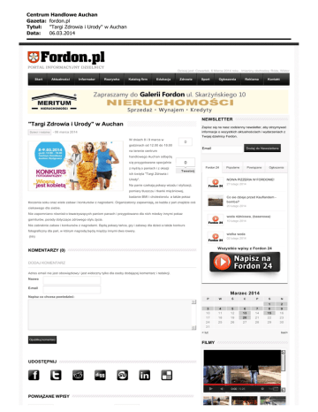 Centrum Handlowe Auchan Gazeta: fordon.pl Tytu³: "Targi Zdrowia i Urody" w Auchan Data: 06.03.2014 Dzisiaj jest: Czwartek, 6 Marca 2014 roku , Imieniny obchodzą: Róża, Wiktor Start Aktualności Informator Rozrywka Katalog firm Edukacja Zdrowie Sport Ogłoszenia Reklama Kontakt NEWSLETTER "Targi Zdrowia i Urody" w Auchan Dzieci i rodzina Zapisz się na nasz codzienny newsletter, aby otrzymywać informacje o wszystkich aktualnościach i wydarzeniach z Twojej dzielnicy Fordon. - 06 marca 2014 W dniach 8 i 9 marca w 0 godzinach od 12.00 do 18.00 Email na terenie centrum Dodaj do Newslettera handlowego Auchan odbędą 0 s ię przygotowane specjalnie Fordon 24 z myślą o paniach i z okazji Popularne Powiązane Ogłoszenia Tweetnij ich święta "Targi Zdrowia i Urody". NOWA PIZZERIA W FORDONIE! Na panie czekają pokazy wizażu i stylizacji, 27 lutego 2014 pomiary tłuszczu i tkanki mię śniowej, badanie BMI i cholesterolu a także pokaz Co sie dzieje przed Kauflandem bomba? tłoczenia soku oraz wiele zabaw i konkursów z nagrodami. Organizatorzy zapewniają, ze każda z pań znajdzie coś 20 lutego 2014 ciekawego dla siebie. Nie zapomniano również o towarzyszących paniom panach i przygotowano dla nich miedzy innymi pokaz woda różnicowa, (basenowa) garniturów, porady dotyczące zdrowego stylu życia. 10 lutego 2014 Nie zabraknie zabaw i konkursów z nagrodami. Będą pokazy tańca, gry i zabawy dla dzieci a także konkurs fotograficzny dla pań, w którym nagrodą będą m iędzy innymi dwa rowery. wielka woda (hh) 02 lutego 2014 Wszystkie wpisy z Fordon 24 KOMENTARZY (0) DODAJ KOMENTARZ Adres email nie jest obowiązkowy i jest widoczny tylko dla osoby dodającej komentarz i redakcji. Nazwa E-mail Marzec 2014 Napisz co chcesz powiedzieć: 5 6 P W Ś C P S N 3 10 4 11 5 12 6 13 7 14 1 8 15 2 9 16 17 24 31 18 25 19 26 20 27 21 28 22 29 23 30 < lut kwi> Opublikuj komentarz FILMY 5 UDOSTĘPNIJ 0:00 / 5:26 POWIĄZANE WPISY 6 Centrum Handlowe Auchan Gazeta: fordon.pl Tytu³: "Targi Zdrowia i Urody" w Auchan Data: 06.03.2014 Zaginiony Świat w Myślęcinku zaprasza po zimowej przerwie Koncert (nie tylko) dla Seniorów w Ostromecku 06 marca 2014 06 marca 2014 Prześlij życzenia z okazji Dnia Kobiet za pośrednictwem "Wiatrak" zaprasza rodziców na warsztaty naszego portalu 05 marca 2014 Dodaj nowy film 06 marca 2014 Poszukiwanie przebiśniegów w Uroczysku Prodnia Fordoński Klub Mam chce rozwinąć skrzydła 05 marca 2014 05 marca 2014 Babski Dzień w Galerii Fordon Kino Jeremi "Wielkie piękno" reż. Paolo Sorrentino 04 marca 2014 04 marca 2014 Kino Jeremi "Molier na rowerze" reż. Philippe Le Guay Spotkanie Koła Turystycznego Fordon RO PTTK "Szlak Brdy" 04 marca 2014 04 marca 2014 PROMOWANE Gazetka reklamowa Kwiaciarnia Projektowanie graficzne Salon Urody w Fordonie WYDARZENIA NAJNOWSZE WPISY OSTATNIE KOMENTARZE ZNAJDŹ SZYBKO "Autoprezentacje" wystawa wychowanek "Targi Zdrowia i Urody" w Auchan Anonim o Darmowe ogłoszenia MDK nr 5 Bilet za grosz na mecz Zawiszy w 27 Luty 2014 10:00 Światowy Tydzień eKsiążki Zaginiony Świat w Myślęcinku zaprasza po zimowej przerwie Kibice Zawiszy kontra kibole MaciejG o Koncert (nie tylko) dla Seniorów w Ostromecku w 6 Marzec 2014 10:00 Klub Młodych Mam w "Wiatraku" Jedzenie na telefon Kibol o w 6 Marzec 2014 05:00 Drzwi otwarte w Collegium Medicum Fordoński Klub Mam chce rozwinąć skrzydła Wiosenne porządki - zgłoś zanieczyszczone miejsca Zmiany na skrzyżowaniu ulic Akademickiej i Korfantego Anka o w 6 Marzec 2014 11:00 Kino Jeremi "Heli", reż. Amat Escalante Spotkanie Fordońskiego Klubu Mam Anonim o w 6 Marzec 2014 11:00 Kino Jeremi "Heli", reż. Amat Escalante 2014 Fordon.pl Oficjalny Serwis Portalu Informacyjnego Fordon.pl. Wszelkie prawa zastrzeżone. Ta(c)strona używa -cookies Akceptuję WięcejDzielnicy informacji Plan miasta Wszystkie