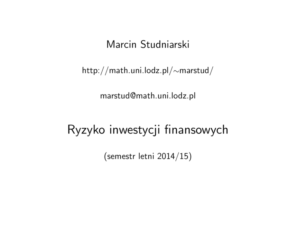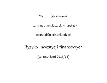 Marcin Studniarski http://math.uni.lodz.pl/ marstud/ [email protected] Ryzyko inwestycji …nansowych (semestr letni 2014/15) 1 1.1 Koncepcje i rodzaje ryzyka Dwie koncepcje ryzyka 1. Negatywna koncepcja ryzyka - ryzyko jako zagroz·enie; moz·liwość straty, szkody, nieosiagni ¾ ecia ¾ zamierzonego celu dzia÷ ania. 2. Neutralna koncepcja ryzyka - ryzyko jako zagroz·enie, ale jednocześnie szansa; moz·liwość uzyskania efektu róz·niacego ¾ sie¾ od zamierzonego celu (efekt ten moz·e być gorszy lub lepszy od oczekiwanego). 1.2 Rodzaje ryzyka 1. Ryzyko rynkowe - wynika ze zmian cen na rynkach …nansowych i towarowych (koncepcja neutralna). 2. Ryzyko kredytowe - wynika z moz·liwości niedotrzymania warunków kontraktu przez osobe¾ lub instytucje, ¾ której udzielono kredytu. 3. Ryzyko operacyjne - ryzyko straty wynikajacej ¾ z nieprawid÷ owo dzia÷ ajacych ¾ procesów wewnetrznych, ¾ ludzi i systemów informatycznych (koncepcja negatywna). 4. Ryzyko p÷ ynności - ryzyko nieoczekiwanego spadku p÷ ynności …nansowej podmiotu gospodarczego (p÷ ynność oznacza zdolność podmiotu do regulowania zobowiazań ¾ w terminie) (koncepcja neutralna lub negatywna). 5. Ryzyko prawne - ryzyko uchwalenia nowych aktów prawnych majacych ¾ wp÷ yw na sytuacje¾ danego podmiotu gospodarczego (koncepcja neutralna). 6. Ryzyko biznesu - ryzyko spowodowane zmianami warunków ekonomicznych prowadzenia dzia÷ alności gospodarczej przez podmiot (koncepcja neutralna lub negatywna). 7. Ryzyko wydarzeń - ryzyko wystapienia ¾ wydarzeń losowych majacych ¾ wp÷ yw na sytuacje¾ podmiotu gospodarczego (np. powódź, poz·ar, napad na bank) (koncepcja negatywna). 1.3 Podzia÷ryzyka rynkowego 1. Ryzyko kursu walutowego 2. Ryzyko stopy procentowej 3. Ryzyko cen akcji 4. Ryzyko cen towarów (takz·e nieruchomości) 1.4 Podzia÷ryzyka kredytowego 1. Ryzyko niedotrzymania warunków - ryzyko niedokonania przez druga¾ strone¾ p÷ atności wynikajacych ¾ z kontraktu (koncepcja negatywna). 2. Ryzyko wiarygodności kredytowej - moz·liwość zmiany wiarygodności kredytowej drugiej strony (koncepcja neutralna). 2 Przestrzeń probabilistyczna Niech bedzie ¾ dowolnym zbiorem zdarzeń elementarnych. Prawdopodobieństwo przypisujemy podzbiorom zbioru nalez·acym ¾ do tzw. klasy zdarzeń F , gdzie F 2 . Zak÷ adamy, z·e F jest -cia÷ em podzbiorów , tzn. spe÷ nia nastepuj ¾ ace ¾ warunki: S1. F = 6 ;. S2. Jez·eli A 2 F , to nA 2 F . S3. Jez·eli Ai 2 F dla i = 1; 2; :::, to S1 i=1 Ai 2 F . Z powyz·szych warunków wynika, z·e do F nalez·a¾ zdarzenia: pewne) i ; (zdarzenie niemoz·liwe). (zdarzenie Najmniejsze -cia÷ o zawierajace ¾ wszystkie zbiory otwarte w Rn nazywamy cia÷ em zbiorów borelowskich w Rn i oznaczamy B(Rn). - Prawdopodobieństwem nazywamy dowolna¾ funkcje¾ P : F ! R spe÷ niajac ¾ a¾ warunki: A1. P (A) 0 dla kaz·dego A 2 F , A2. P ( ) = 1, A3. Jez·eli Ai 2 F dla i = 1; 2; ::: oraz Ai \ Aj = ; dla i 6= j , to 0 P@ 1 [ i=1 1 AiA = 1 X i=1 P (Ai): (1) Przestrzenia¾ probabilistyczna¾ nazywamy trójke¾ ( ; F ; P ), gdzie jest dowolnym zbiorem, F jest -cia÷ em podzbiorów , a P jest prawdopodobieństwem określonym na F . W÷ asności prawdopodobieństwa. Jez·eli ( ; F ; P ) jest przestrzenia¾ probabilistyczna¾ i zbiory A; B; A1; :::; An nalez·a¾ do F , to spe÷ nione sa¾ poniz·sze warunki: W1. P (;) = 0. W2. Jez·eli Ai \ Aj = ; dla i 6= j , to P W3. P ( nA) = 1 W4. Jez·eli A Sn Pn A = i=1 i i=1 P (Ai). P (A). B , to P (BnA) = P (B ) P (A). W5. Jez·eli A W6. P (A) B , to P (A) P (B ). 1. W7. P (A [ B ) = P (A) + P (B ) W8. Jeśli P (A \ B ). jest zbiorem skończonym i F = 2 , to X !2 P (f!g) = 1: (2) Zadanie 1. Eksperci wskazali na 5 moz·liwych stanów gospodarki w ciagu ¾ najbliz·szego roku oraz na prawdopodobieństwa ich wystapienia: ¾ stan gospodarki duz·y rozwój niewielki rozwój stagnacja niewielka recesja duz·a recesja skrót DRO NRO STA NRE DRE prawdopodobieństwo 0; 1 0; 25 0; 2 0; 35 0; 1 Zde…niować przestrzeń probabilistyczna¾ tak, aby zdarzeniami elementarnymi by÷ y stany gospodarki, a ich prawdopodobieństwami liczby wymienione w powyz·szej tabeli. Wykazać, z·e przestrzeń ta spe÷ nia warunki (A1)–(A3). Zde…niować zdarzenia: “rozwój” i “brak rozwoju” oraz obliczyć ich prawdopodobieństwa. 3 Zmienne losowe Niech ( ; F ; P ) bedzie ¾ przestrzenia¾ probabilistyczna. ¾ Zmienna¾ losowa¾ (wektorem losowym) o wartościach w Rn nazywamy odwzorowanie X : ! Rn takie, z·e dla dowolnego zbioru borelowskiego A w Rn zbiór X 1(A) nalez·y do F. Zadanie 2. Wykazać, z·e X jest zmienna¾ losowa¾ wtedy i tylko wtedy, gdy dla kaz·dego uk÷ adu liczb 1; :::; n 2 R mamy X 1(( 1; 1] ::: ( 1; n]) 2 F : Uwaga. Jeśli jest zbiorem skończonym i F = 2 , to kaz·da funkcja X : ! Rn jest zmienna¾ losowa. ¾ Rozk÷ adem prawdopodobieństwa zmiennej losowej X : wamy funkcje¾ PX : B(Rn) ! R dana¾ wzorem PX (B ) := P (X 1(B )) ! Rn nazy- dla B 2 B(Rn): (3) Mówimy, z·e zmienna losowa X ma rozk÷ ad dyskretny, jez·eli istnieje taki zbiór przeliczalny S Rn, z·e PX (S ) = 1. Uwaga. Jeśli jest zbiorem skończonym i F = 2 , to moz·na przyjać ¾ S := X ( ) (zbiór skończony) i wtedy PX (S ) = PX (X ( )) = P (X 1(X ( ))) = P ( ) = 1: Zatem kaz·da zmienna losowa określona na skończonym zbiorze zdarzeń elementarnych ma rozk÷ ad dyskretny. 3.1 Wartość oczekiwana zmiennej losowej o rozk÷ adzie dyskretnym Wartościa¾ oczekiwana¾ (lubśrednia) ¾ zmiennej losowej X : ! R o rozk÷ adzie dyskretnym, przyjmujacej ¾ skończenie wiele wartości, nazywamy liczbe¾ EX := X xi P ( X = xi ) ; (4) i2I gdzie X ( ) = fxigi2I , I – skończony zbiór indeksów, a P (X = xi) jest skróconym zapisem wyraz·enia P (f! 2 : X (! ) = xig). Wartościa¾ oczekiwana¾ wektora losowego X = (X1; :::; Xn) : ! Rn, gdzie wszystkie zmienne losowe Xi przyjmuja¾ skończenie wiele wartości, nazywamy wektor EX := (EX1; :::; EXn): (5) 3.2 Wartość oczekiwana 