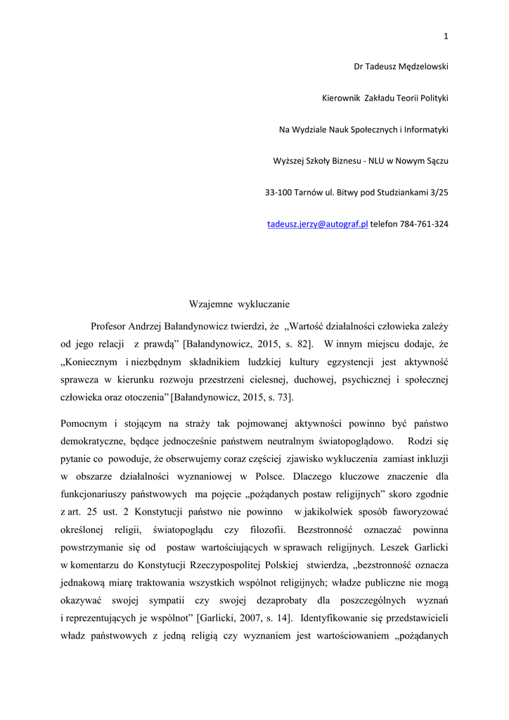 1 Dr Tadeusz Mędzelowski Kierownik Zakładu Teorii Polityki Na Wydziale Nauk Społecznych i Informatyki Wyższej Szkoły Biznesu - NLU w Nowym Sączu 33-100 Tarnów ul. Bitwy pod Studziankami 3/25 [email protected] telefon 784-761-324 Wzajemne wykluczanie Profesor Andrzej Bałandynowicz twierdzi, że „Wartość działalności człowieka zależy od jego relacji z prawdą” [Bałandynowicz, 2015, s. 82]. W innym miejscu dodaje, że „Koniecznym i niezbędnym składnikiem ludzkiej kultury egzystencji jest aktywność sprawcza w kierunku rozwoju przestrzeni cielesnej, duchowej, psychicznej i społecznej człowieka oraz otoczenia” [Bałandynowicz, 2015, s. 73]. Pomocnym i stojącym na straży tak pojmowanej aktywności powinno być państwo demokratyczne, będące jednocześnie państwem neutralnym światopoglądowo. Rodzi się pytanie co powoduje, że obserwujemy coraz częściej zjawisko wykluczenia zamiast inkluzji w obszarze działalności wyznaniowej w Polsce. Dlaczego kluczowe znaczenie dla funkcjonariuszy państwowych ma pojęcie „pożądanych postaw religijnych” skoro zgodnie z art. 25 ust. 2 Konstytucji państwo nie powinno określonej religii, światopoglądu powstrzymanie się od czy filozofii. w jakikolwiek sposób faworyzować Bezstronność oznaczać powinna postaw wartościujących w sprawach religijnych. Leszek Garlicki w komentarzu do Konstytucji Rzeczypospolitej Polskiej stwierdza, „bezstronność oznacza jednakową miarę traktowania wszystkich wspólnot religijnych; władze publiczne nie mogą okazywać swojej sympatii czy swojej dezaprobaty dla poszczególnych wyznań i reprezentujących je wspólnot” [Garlicki, 2007, s. 14]. Identyfikowanie się przedstawicieli władz państwowych z jedną religią czy wyznaniem jest wartościowaniem „pożądanych 2 postaw religijnych” i prowadzi do marginalizowania pozostałych Kościołów czy Związków Wyznaniowych dopuszczając tym samym możliwość redukcji czy zwalczania postaw odmiennych od pożądanych. Artykuł 25 ust. 2 ustawy zasadniczej nakazuje władzom publicznym równe traktowanie wszystkich obywateli, bez względu na ich stosunek do religii czy przynależność bądź jej brak do jakiegokolwiek Kościoła czy Związku Wyznaniowego. Jeżeli Polska ma być państwem neutralnym w sprawach religii i przekonań to władze powinny pamiętać, że mniejszości religijne w Polsce to około 3% wszystkich mieszkańców kraju [Gudaszewski, Chmielewski, 2008]. Zalicza się do nich wiernych należących do Związków Wyznaniowych wpisanych do Rejestru Kościołów i innych Związków Wyznaniowych czyli oficjalnie uznanych. Jest ich około 170. Oprócz nich funkcjonują nowe ruchy religijne i alternatywne ruchy religijne. Członkowie tych ruchów realizują swoją doktrynę religijną bez rejestracji. Działają pod nazwami stowarzyszeń świeckich, naukowych paranaukowych, sportowych czy spółek prawa handlowego. Nie jest to zjawisko nowe. Podobnie było przed I wojną światową na ziemiach polskich i w II Rzeczypospolitej, a także w Polsce Ludowej [Brożyniak, Winiarczyk – Kossakowska, 2014, s. 9 – 10]. Co zatem jest powodem takiej sytuacji w relacjach światopoglądowych na styku obywatel – państwo? Nowe ruchy religijne jak twierdzi Maria Libiszowska Żółtkowska są formą odpowiedzi na duchowe potrzeby coraz bardziej zagubionego i osamotnionego w odpersonalizowanej cywilizacji człowieka [Libiszowska – Żółtkowska, 1993, s. 104 – 105]. Aspiracje wynikające z potrzeby funkcjonowania we wspólnocie są jednym ze źródeł motywacji, które skłaniają ludzi do zainteresowania się ideologią nowych ruchów religijnych gdy przynależność do istniejących Kościołów czy Związków Wyznaniowych napotyka na trudności z samoidentyfikacją. Trudno też nie zgodzić się z profesor Libiszowską - Żółtkowską, że uczestnictwo w nowych ruchach religijnych „warunkowane jest poszukiwaniem nowych wartości, nowego sensu życia, samookreślenia własnej tożsamości i nowych pogłębionych form życia religijnego” [Libiszowska – Żółtkowska, 1993, s. 107]. Poszukiwanie nowej orientacji życiowej wynika z braku zaufania do oferowanych wzorców, z negacji życia nastawionego na konsumpcję czy wreszcie z poczucia wyobcowania. Może mieć także swoje podłoże w ocenie cywilizacji jako źródła destrukcji i zagrożenia dla egzystencji człowieka. Nie bez znaczenia jest brak zaufania dla ideologii i praktyk politycznych rządzących. Nie należy również zapominać o niezrealizowanych jednostkowych potrzebach 3 i oczekiwaniach konwertytów. Nie znajdują oni zrozumienia i wsparcia w tradycyjnych Kościołach czy Związkach Wyznaniowych. Rozwój nowych ruchów religijnych jaki obserwujemy od II połowy XX wieku i przemiany w Polsce po 1989 roku wydawać by się mogło zmuszą Kościół rzymskokatolicki do porzucenia tradycyjnego negatywnego stanowiska wobec wyznań mniejszościowych. Terminami „sekta” i „kult” posługuje się Kościół rzymskokatolicki nadal w sposób zamierzony. Dane socjologów mówiące o kryzysie tożsamości chrześcijańskiej i tradycyjnej religijności, a także spadku uczestników praktyk religijnych nie zmieniają tego stanowiska. Raport watykański z 2 maja 1986 roku zatytułowany „Sekty albo nowe ruchy religijne. Wyzwanie duszpasterskie” [Sekty albo nowe ruchy religijne. Wyzwanie duszpasterskie] jest pierwszym obowiązującym dokumentem w dziejach Stolicy Apostolskiej poświęconym nowym ruchom religijnym. Już we wstępie autorzy dokumentu zauważają trudności w zakresie zdefiniowania podstawowych pojęć. Przyznają, że słowa „sekta” i „kult” mają pejoratywne zabarwienie i właściwsze jest posługiwanie się takimi terminami jak „nowe ruchy religijne” czy „nowe grupy religijne”, to jednak w dalszej części raportu konsekwentnie ruchy te określa się jako sekty i taką terminologię stosuje. Lektura tego dokumentu co podkreśl