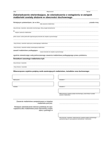 .............................................. ....................................................................................................................................... .............................................. 0LHMVFRZRĞü Data Numer =DĞZLDGF]HQLHVWZLHUG]DMąFHĪHRĞZLDGF]HQLDRZVWąSLHQLXZ]ZLą]HN PDáĪHĔVNL]RVWDá\]áRĪRQHZREHFQRĞFLGXFKRZQHJR 1LQLHMV]\PSRWZLHUG]DPĪHZGQLX «««««««SU]HGHPQą data zawarcia mDáĪHĔVWZD ......................................................................................................................................................................................................................................... LPLĊLPLRQDQD]ZLVNRVWDQRZLVNRGXFKRZQHJRNWyU\SU]\MąáRĞZLDGF]HQLD w .................................................................................................................................................................................................................................... PLHMVFH]DZDUFLDPDáĪHĔVWZD ......................................................................................................................................................................................................................................... SHáQDQD]ZDLDGUHVMHGQRVWNLRUJDQL]DF\MQHMNRĞFLRáDOXE]ZLą]NXZ\]QDQLRZHJR ......................................................................................................................................................................................................................................... ......................................................................................................................................................................................................................................... LPLĊLPLRQDQD]ZLVNRPĊĪF]\]Q\]DZLHUDMąFHJRPDáĪHĔVWZR ......................................................................................................................................................................................................................................... LPLĊLPLRQDQD]ZLVNRNRELHW\]DZLHUDMąFHMPDáĪHĔVWZR ]DZDUOLPDáĪHĔVWZRSRGOHJDMąFH .................................................................................................................................................................... QD]ZDNRĞFLRáDOXE]ZLą]NXZ\]QDQLRZHJR ]JRGQLHRĞZLDGF]DMąFZROĊMHGQRF]HVQHJR]DZDUFLDPDáĪHĔVWZDSRGOHJDMąFHJRSUDZXSROVNLHPX ĝZLDGNDPL]DZDUWHJRPDáĪHĔVWZDE\OL ......................................................................................................................................................................................................................................... ,PLĊLPLRQDLQD]ZLVNR ......................................................................................................................................................................................................................................... ,PLĊLPLRQDLQD]ZLsko :áDVQRUĊF]QHF]\WHOQHSRGSLV\RVyE]DZLHUDMąF\FKPDáĪHĔVWZRĞZLDGNyZRUD]GXFKRZQHJR 0ĊĪF]\]QD ĝZLDGHN Kobieta ĝZLDGHN :áDVQRUĊF]Q\F]\WHOQ\SRGSLVGXFKRZQHJRSU]HGNWyU\P]RVWDáR ]DZDUWHPDáĪHĔVWZR =DZDUFLHPDáĪHĔVWZD]DUHMHVWURZDQRZNVLĊG]H mDáĪHĔVWZSRGSR] ««««««««««««««««««««««« 1LQLHMV]H]DĞZLDGF]HQLHVWDQRZLSRGVWDZĊGRVSoU]ąG]HQLDDNWXPDáĪHĔVWZDSU]H]NLHURZQLNDXU]ĊGX stanu cywilnego w ««««««««««««««««««««««« ,PLĊLPLRQDQD]ZLVNRLZáDVQRUĊF]Q\F]\WHOQ\SRGSLVGXFKRZQHJR XSRZDĪQLRQHJRGRVSRU]ąG]DQLD]DĞZLDGF]HĔVWDQRZLVNo