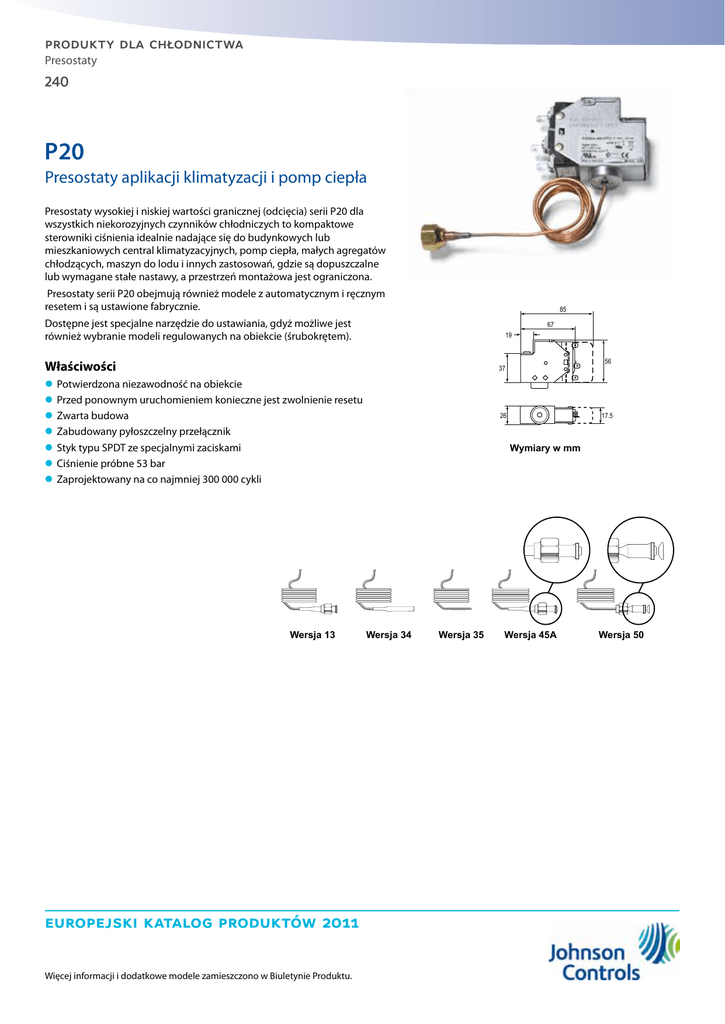 produkty dla chłodnictwa Presostaty 240 P20 Presostaty aplikacji klimatyzacji i pomp ciepła Presostaty wysokiej i niskiej wartości granicznej (odcięcia) serii P20 dla wszystkich niekorozyjnych czynników chłodniczych to kompaktowe sterowniki ciśnienia idealnie nadające się do budynkowych lub mieszkaniowych central klimatyzacyjnych, pomp ciepła, małych agregatów chłodzących, maszyn do lodu i innych zastosowań, gdzie są dopuszczalne lub wymagane stałe nastawy, a przestrzeń montażowa jest ograniczona. Presostaty serii P20 obejmują również modele z automatycznym i ręcznym resetem i są ustawione fabrycznie. 85 Dostępne jest specjalne narzędzie do ustawiania, gdyż możliwe jest również wybranie modeli regulowanych na obiekcie (śrubokrętem). 67 19 Właściwości 37 zz Potwierdzona niezawodność na obiekcie zz Przed ponownym uruchomieniem konieczne jest zwolnienie resetu zz Zwarta budowa zz Zabudowany pyłoszczelny przełącznik zz Styk typu SPDT ze specjalnymi zaciskami zz Ciśnienie próbne 53 bar zz Zaprojektowany na co najmniej 300 000 cykli Wersja 13 europejski katalog produktów 2011 Więcej informacji i dodatkowe modele zamieszczono w Biuletynie Produktu. 3 2 56 Ò 1 17.5 26 Wymiary w mm Wersja 34 Wersja 35 Wersja 45A Wersja 50 3 produkty dla chłodnictwa Presostaty 241 P20 Presostaty aplikacji klimatyzacji i pomp ciepła Kody zamówień Zakres (bar) Histereza stała P20EA-9610C P20EA-9611D P20EA-9620D 0.9 7 do 29 P20EA-9670 Działanie przełącznika Długość kapilary Aprobata PED 90 cm 13 2 1.5 P20EA-9160L Wersja 1.5 0.5 do 10 P20EA-9621D P20EA-9561K Nastawa (bary) 120 cm 90 cm SPDT, 8 A, otw. przy niskim sygnale, Auto reset --- SPDT, 8 A, otw. przy wysokim sygnale, Auto reset 120 cm 3.1 17 45A 1.2 16 50 5.2 28 13 90 cm P20 Presostaty wysokociśnieniowe Zakres (bar) Histereza stała Nastawa (bary) Wersja Długość kapilary --- --- 18 13 90 cm P20EA-9681T 7.1 24 13 120 cm P20EA-9950C 1.1 10 1.2 16 Kody zamówień P20EA-9670X P20EA-9950K P20GA-9650X 7 do 29 P20GA-9651N 34 28 --- P20GA-9650T 19 Działanie przełącznika SPDT, 8 A, otw. przy wysokim sygnale, Auto reset Cechy dodatkowe Aprobata PED --- 90 cm 13 24 SPDT, 8 A, otw. przy wysokim sygnale, ręczny reset Regulacja kluczem Uniwersalne zamienniki presostatów nisko- i wysokociśnieniowych P20 Kody zamówień P20EA-9530FC P20EA-9630FC P20EA-9570XC P20EA-9670XC P20EL-9670TC P20FA-9510FC P20FA-9610FC P20GA-9550XC P20GA-9650XC P20GL-9650TC Zakres (bar) 0.5 do 10 7 do 29 Histereza stała Nastawa (bary) Wersja 2.1 3 50 2.1 3 13 5.2 28 50 5.2 28 14 do 42 37 0.5 do 10 3 6.5 7 do 29 14 do 42 28 37 Długość kapilary Działanie przełącznika Otwiera przy niskim sygnale SPDT, 8 A, Auto reset Otwiera przy wysokim sygnale 13 50 13 europejski katalog produktów 2011 Więcej informacji i dodatkowe modele zamieszczono w Biuletynie Produktu. Aprobata PED --- 90 cm 13 50 Cechy dodatkowe SPDT, 8 A, Ręczny reset Otwiera przy niskim sygnale --- Otwiera przy wysokim sygnale