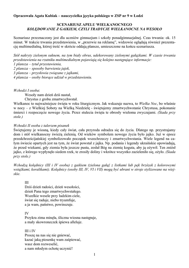 Opracowała Agata Kubiak – nauczycielka języka polskiego w ZSP nr 9 w Łodzi SCENARIUSZ APELU WIELKANOCNEGO KOLĘDOWANIE Z GAIKIEM, CZYLI TRADYCJE WIELKANOCNE NA WESOŁO Scenariusz przeznaczony jest dla uczniów gimnazjum i szkoły ponadgimnazjalnej. Czas trwania: ok. 15 minut. W trakcie trwania przedstawienia, w „przerwie na reklamę”, widzowie oglądają również prezentację multimedialną, której treść w skrócie oddają plansze, umieszczone na końcu scenariusza. Stół nakryty zielonym suknem, na tym biały obrus, udekorowany zielonymi gałązkami. W czasie trwania przedstawienia na rzutniku multimedialnym pojawiają się kolejno następujące informacje: 1 plansza – tytuł przestawienia, 2 plansza – sposoby barwienia jajek, 3 plansza – przysłowia związane z jajkami, 4 plansza – osoby biorące udział w przedstawieniu. Wchodzi I osoba: Wesoły nam dzień dziś nastał, Chrystus z grobu zmartwychwstał. Wielkanoc to najważniejsze święta w roku liturgicznym. Jak wskazuje nazwa, to Wielka Noc, bo właśnie w nocy – z Wielkiej Soboty na Wielką Niedzielę - świętujemy zmartwychwstanie Chrystusa, pokonanie śmierci i rozpoczęcie nowego życia. Przez stulecia święta te obrosły wieloma zwyczajami. (Siada przy stole.) Wchodzi II osoba z talerzem pisanek Świętujemy je wiosną, kiedy cały świat, cała przyroda odradza się do życia. Dlatego np. przystrajamy dom i stół wielkanocny świeżą zielenią. Od wieków symbolem nowego życia było jajko. Już w epoce przedchrześcijańskiej symbolizowało początek wszechrzeczy i zmartwychwstania. Wiele legend na całym świecie opartych jest na tym, że świat powstał z jajka. Np. podania i legendy ukraińskie opowiadają, że przed wiekami, gdy ziemia była jeszcze pusta, zesłał Bóg na ziemię koguta, aby ją ożywił. Ten zniósł jajko, z którego wypłynęło siedem rzek, te zrosiły doliny i wkrótce wszystko zazieleniło się, ożyło. (Siada przy stole.) Wchodzą kolędnicy (III i IV osoba) z gaikiem (zielona gałąź z listkami lub pęk brzózek z kolorowymi wstążkami, koralikami). Kolędnicy (osoby III, IV, VI i VII) mogą być ubrani w stroje stylizowane na wiejskie. III Dziś dzień radości, dzień wesołości, dzień Pana tego zmartwychwstałego. Wszelkie wesele przy ludzkim ciele, świat się raduje, niebo tryumfuje, a ja wam, państwo, powinszuje. IV Przykra zima minęła, śliczna wiosna następuje, a mały skowroneczek śpiewa alleluje. III i IV Proszę na nas się nie gniewać, kazać jaką piosenkę wam zaśpiewać, wasz dom rozweselić, a nam młodym ochotę uczynić! 1 Śpiewać czy nie? V (wchodzi) Kolędników przyjmujecie? II Właśnie, to nie Boże Narodzenie! A co wy tu w ogóle robicie? III Na wsi jest taki zwyczaj, że po kolędzie chodzi się też na Wielkanoc. Życzy się gospodarzom wszystkiego dobrego, śpiewa piosenki... No to co, mam śpiewać czy nie? I Śpiewać! A jakże! Kolędnicy spoglądają po sobie. IV A... to może ja już lepiej powiem.... My z gaikiem wstępujemy, Szczęścia, zdrowia winszujemy. Gaiku zielony, pięknieś ustrojony, pięknie sobie chodzisz, bo ci się tak godzi. I Ale chwileczkę, jaki gaik??? III Tak jak na Boże Narodzenie chodzi się z gwiazdą i turoniem, tak na Wielkanoc chodzi się z gaikiem. Jest to zielona gałąź przyozdobiona wstążkami, wydmuszkami, ozdobami z kolorowego papieru. Symbolizująca wiosnę i odradzające się po zimie życie. I Prosimy pięknie kolędników do nas, do stołu. Kolędnicy siadają do stołu. Wchodzi druga para kolędników (osoba VI i VII). VI i VII Witomy wsyskich pieknie! III No ładnie, konkurencja przyszła... VI A dajcie, że nam, dajcie całą kiełbasę, Niech ja se gaiczek trzy razy łopasze. VII A dajcie nam, dajcie, chleba z olejem, żeby wasz syneczek nie był złodziejem. 2 VI A dajcie nam, dajcie kawałek placka, to wam naraimy zięcia Jacka. VII Czy to jajko, czy to pieróg, niech to będzie pański wyrok. Proszę dać, nie żałować, żeby było za co dziękować. Dajcie par pięć, będę wasz zięć, dajcie par kilka, przyprowadzę do waszych świń wilka. (...) Dajcie, nie żałujcie, niech wam w polu, w ogrodzie rodzi, niech wam Pan Jezus stokrotnie wynagrodzi. I Wszyscy są teraz tacy wymagający... V Ojojoj, dziękujemy za piosenkę, ale my tu nic nie mamy do jedzenia. II Wszyscy na diecie. V Ale zapraszamy do stołu. Odwdzięczymy się opowieścią o tradycjach Świąt Wielkanocnych. III Faktycznie, pusto na tym stole macie... Tylko pisanki... II Owszem, pisanki, ale to właśnie jajko jest najważniejszym symbolem Wielkanocy... I Za pozwoleniem, to już było. Czy wiecie, że… IV (na stronie do III) Patrz, jajko mądrzejsze od kury... I (gromiąc wzrokiem IV) Czy wiecie, że… kiedyś zdobieniem jajek zajmowały się tylko kobiety. Np. na Podlasiu kobiety „piszące” jajka zbierały się w jednej izbie, do której wzbraniano wstępu mężczyznom. Gdy któryś z nich wszedł do wnętrza, kobiety wypędzały go i zacierały ślady po intruzie, spluwając ukradkiem lub rzucając za siebie odrobinę soli. V A czy znacie legendy dotyczące początków malowania jajek? Podanie greckie z X wieku mówi, że zwyczaj malowania jajek wielkanocnych wprowadziła święta Magdalena. Kiedy płakała przy pustym grobie Zbawiciela, ukazał się jej anioł i pocieszył ją. Uradowana kobieta pobiegła do domu i zobaczyła, że 3 wszystkie jajka zaczerwieniły się. Poszła więc do apostołów i rozdając im czerwone jajka, opowiadała o zmartwychwstaniu Pana. II A w innej wersji Maria Magdalena przyszedłszy do Heroda z prośbą, aby ulitował się nad Jezusem, podarowała mu kilka malowanych jajek. Odtąd wierzono, że to same dziewczęta powinny malować jajka, a najładniejsze z nich ofiarować swoim chłopcom, co zjedna im miłość. VIII (wstaje z sali, z widowni, dołącza do siedzących przy stole) Co tam jajka, na dziewczyny najlepszy jest dyngus. (podbiega do sceny z wiadrem) Kied