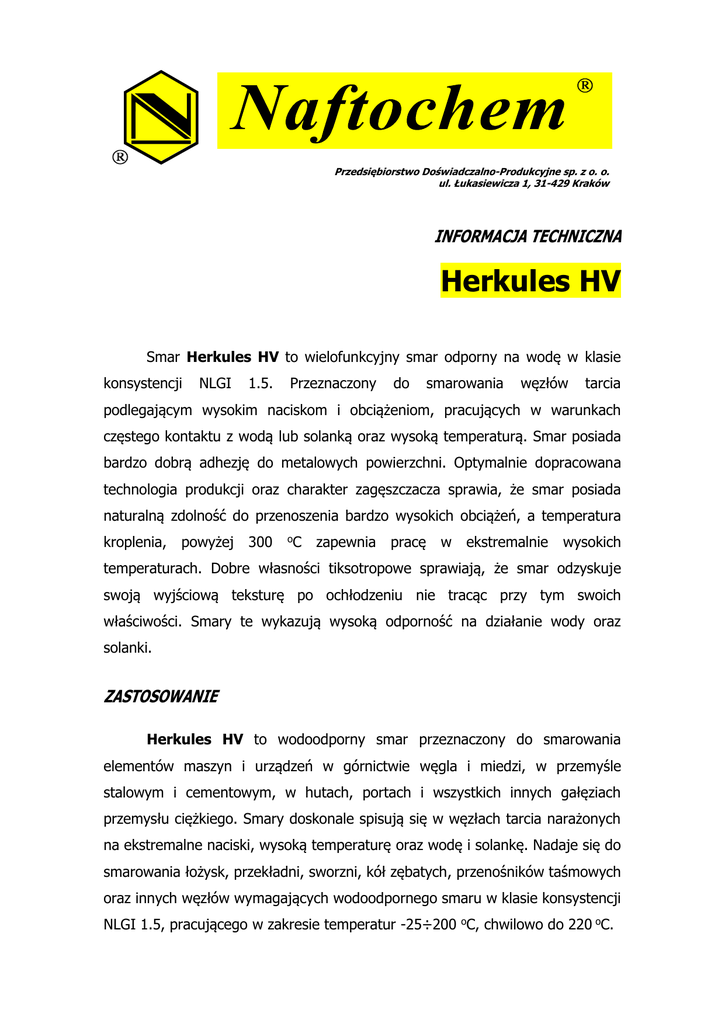 Przedsiębiorstwo Doświadczalno-Produkcyjne sp. z o. o. ul. Łukasiewicza 1, 31-429 Kraków INFORMACJA TECHNICZNA Herkules HV Smar Herkules HV to wielofunkcyjny smar odporny na wodę w klasie konsystencji NLGI 1.5. Przeznaczony do smarowania węzłów tarcia podlegającym wysokim naciskom i obciążeniom, pracujących w warunkach częstego kontaktu z wodą lub solanką oraz wysoką temperaturą. Smar posiada bardzo dobrą adhezję do metalowych powierzchni. Optymalnie dopracowana technologia produkcji oraz charakter zagęszczacza sprawia, że smar posiada naturalną zdolność do przenoszenia bardzo wysokich obciążeń, a temperatura kroplenia, powyżej 300 oC zapewnia pracę w ekstremalnie wysokich temperaturach. Dobre własności tiksotropowe sprawiają, że smar odzyskuje swoją wyjściową teksturę po ochłodzeniu nie tracąc przy tym swoich właściwości. Smary te wykazują wysoką odporność na działanie wody oraz solanki. ZASTOSOWANIE Herkules HV to wodoodporny smar przeznaczony do smarowania elementów maszyn i urządzeń w górnictwie węgla i miedzi, w przemyśle stalowym i cementowym, w hutach, portach i wszystkich innych gałęziach przemysłu ciężkiego. Smary doskonale spisują się w węzłach tarcia narażonych na ekstremalne naciski, wysoką temperaturę oraz wodę i solankę. Nadaje się do smarowania łożysk, przekładni, sworzni, kół zębatych, przenośników taśmowych oraz innych węzłów wymagających wodoodpornego smaru w klasie konsystencji NLGI 1.5, pracującego w zakresie temperatur -25÷200 oC, chwilowo do 220 oC. WŁAŚCIWOŚCI FIZYKOCHEMICZNE Lp. Badany parametr Herkules HV 1 Klasa konsystencji NLGI 1.5 2 Lepkość oleju bazowego w 40oC, [cst] 420 3 Barwa 4 Penetracja po ugniataniu w temperaturze 250C 5 Temperatura kroplenia, [0C] > 300 6 Obciążenie zespawania, [kG] 620 7 Obciążenie graniczne, Goz, przy obciążeniu 39,2 [daN/mm2] 185 8 Obciążenie niezacierające - Timken, [kG, lb] 9 Badanie odporności na wymywanie wodą metodą dynamiczną 79 0C, [%] 10 Średnica skazy (40 kG, 60 min.), [mm] 0,35 11 Badanie własności przeciwkorozyjnych metodą dynamiczną EMCOR, Woda słona 0-0 12 Korozja Cu/24h/1000C bursztynowa 297 29 / 65 2 wytrzymuje MAGAZYNOWANIE Smar Herkules HV należy przechowywać w zamkniętych opakowaniach w pomieszczeniach suchych, zabezpieczonych przed bezpośrednim działaniem promieni słonecznych. Termin ważności wynosi 3 lata od daty produkcji. KONTAKT Dział sprzedaży tel.: +48 12 421 59 08 mobile: +48 664 099 045 e-mail: [email protected] Dział technologiczny tel.: +48 12 632 51 11 mobile: +48 664 133 569 e-mail: [email protected] e-mail: [email protected] Sprzedaż dla przemysłu Sprzedaż hurtowa mobile: +48 513 049 288 mobile: +48 666 854 642 www.naftochem.pl