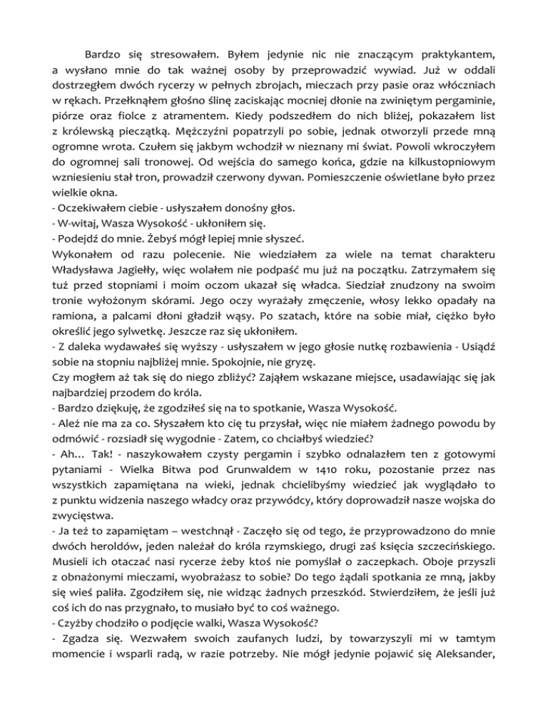 Bardzo się stresowałem. Byłem jedynie nic nie znaczącym praktykantem, a wysłano mnie do tak ważnej osoby by przeprowadzić wywiad. Już w oddali dostrzegłem dwóch rycerzy w pełnych zbrojach, mieczach przy pasie oraz włóczniach w rękach. Przełknąłem głośno ślinę zaciskając mocniej dłonie na zwiniętym pergaminie, piórze oraz fiolce z atramentem. Kiedy podszedłem do nich bliżej, pokazałem list z królewską pieczątką. Mężczyźni popatrzyli po sobie, jednak otworzyli przede mną ogromne wrota. Czułem się jakbym wchodził w nieznany mi świat. Powoli wkroczyłem do ogromnej sali tronowej. Od wejścia do samego końca, gdzie na kilkustopniowym wzniesieniu stał tron, prowadził czerwony dywan. Pomieszczenie oświetlane było przez wielkie okna. - Oczekiwałem ciebie - usłyszałem donośny głos. - W-witaj, Wasza Wysokość - ukłoniłem się. - Podejdź do mnie. Żebyś mógł lepiej mnie słyszeć. Wykonałem od razu polecenie. Nie wiedziałem za wiele na temat charakteru Władysława Jagiełły, więc wolałem nie podpaść mu już na początku. Zatrzymałem się tuż przed stopniami i moim oczom ukazał się władca. Siedział znudzony na swoim tronie wyłożonym skórami. Jego oczy wyrażały zmęczenie, włosy lekko opadały na ramiona, a palcami dłoni gładził wąsy. Po szatach, które na sobie miał, ciężko było określić jego sylwetkę. Jeszcze raz się ukłoniłem. - Z daleka wydawałeś się wyższy - usłyszałem w jego głosie nutkę rozbawienia - Usiądź sobie na stopniu najbliżej mnie. Spokojnie, nie gryzę. Czy mogłem aż tak się do niego zbliżyć? Zająłem wskazane miejsce, usadawiając się jak najbardziej przodem do króla. - Bardzo dziękuję, że zgodziłeś się na to spotkanie, Wasza Wysokość. - Ależ nie ma za co. Słyszałem kto cię tu przysłał, więc nie miałem żadnego powodu by odmówić - rozsiadł się wygodnie - Zatem, co chciałbyś wiedzieć? - Ah… Tak! - naszykowałem czysty pergamin i szybko odnalazłem ten z gotowymi pytaniami - Wielka Bitwa pod Grunwaldem w 1410 roku, pozostanie przez nas wszystkich zapamiętana na wieki, jednak chcielibyśmy wiedzieć jak wyglądało to z punktu widzenia naszego władcy oraz przywódcy, który doprowadził nasze wojska do zwycięstwa. - Ja też to zapamiętam – westchnął - Zaczęło się od tego, że przyprowadzono do mnie dwóch heroldów, jeden należał do króla rzymskiego, drugi zaś księcia szczecińskiego. Musieli ich otaczać nasi rycerze żeby ktoś nie pomyślał o zaczepkach. Oboje przyszli z obnażonymi mieczami, wyobrażasz to sobie? Do tego żądali spotkania ze mną, jakby się wieś paliła. Zgodziłem się, nie widząc żadnych przeszkód. Stwierdziłem, że jeśli już coś ich do nas przygnało, to musiało być to coś ważnego. - Czyżby chodziło o podjęcie walki, Wasza Wysokość? - Zgadza się. Wezwałem swoich zaufanych ludzi, by towarzyszyli mi w tamtym momencie i wsparli radą, w razie potrzeby. Nie mógł jedynie pojawić się Aleksander, który był w trakcie przygotowań do walki. Żeby zrozumieć przybyłych gości, musiał stać przy mnie Jan Mężyk. Nie przepadałem, kiedy akurat ten człowiek stał blisko mnie, jednak tego wymagała sytuacja i musiałem to wytrzymać - prychnął pod nosem- Oddali mi byle jak honory, bo tak im się spieszyło mówić, więc zignorowałem to i czekałem aż przekażą w końcu wiadomość od swego mistrza Ulryka. - Czy zdradzisz nam jej treść, Wasza Wysokość? - Właściwie nie ma co ukrywać. Po odczekaniu chwili, aż Jan przetłumaczy ich mowę na nasz język, dowiedziałem się, że ofiarują mi oraz Aleksandrowi dwa miecze, jakbyśmy swoich nie mieli i ruszyli jak najprędzej do walki. Śmieli powiedzieć, że się ociągam oraz chowam po lasach! Niedorzeczność! Do tego, jeżeli uważałem, że mam mało przestrzeni do walki, mogłem wybrać sobie inne miejsce. To akurat było miłe z ich strony. Tyle mieli mi do powiedzenia - zamyślił się - Chwilę po tym jak skończyli mówić, przekazano nam informację, o wycofaniu się wojska krzyżackiego na rozleglejsze tereny, jakby potwierdzając słowa posłańców. - Nie wydawało się to dziwne, Waszej Wysokości? Takie zachowanie wroga? - Na początku owszem, mieliśmy wątpliwości. Przedyskutowaliśmy to i uznaliśmy, że krzyżacy uważają zwycięstwo po swojej stronie, ponieważ oni dyktują nam reguły. Mało się wtedy nie roześmiałem na całą komnatę. - Co zrobiłeś dalej, królu? - Zgodziłem się! - krzyknął ożywiony - Przyjąłem ich dar oraz postanowiłem powiedzieć kilka słów od siebie. Swoją przemowę zacząłem od tego, że mam wystarczająco swoich mieczy i nie potrzebuję tych od wroga. Jednak przyjmę je jako wsparcie dla mojego wojska, zdrowia oraz zwycięstwa. Próbując nie obrazić dosłownymi słowami ich przywódcy, nadmieniłem, że skoro, ani moje prośby, ani próby rozwiązania konfliktu nie mają szans z walką, rozlewem krwi, połamanymi kośćmi oraz wyszarpanymi wnętrznościami, to proszę bardzo! Muszą być jednak świadomi iż Bóg nas nie opuści oraz wspomoże mój lud! - zerwał się z miejsca wczuwając bardzo w rolę - Ojciec Wszechmogący nigdy nie pozwoliłby, aby moi ludzie zginęli z rąk tak parszywych osób, którym jedynie śmierć w głowie niż pokój. Miejsce naszego starcia oraz jego wynik pozostawiam samemu Bogu! Mam nadzieję, że sprawiedliwość niebios położy kres niegodziwej krzyżackiej pychy… Jego spojrzenie znów wróciło do rzeczywistości. On naprawdę przeniósł się do tamtej chwili. Przez moją chwilę zamyślenia, na pergamin spadła kropla atramentu tworząc ogromnego kleksa. Jego Wysokość przyjrzał się powstałemu kształtowi oraz ponownie usiadł na tronie. - Powtórzyłem także kilka razy, że to my wygramy tą walkę - dodał patrząc gdzieś w bok. Zapadła cisza. Przez chwilę zupełnie zapomniałem po co tu przyszedłem i dlaczego siedzę tak bl