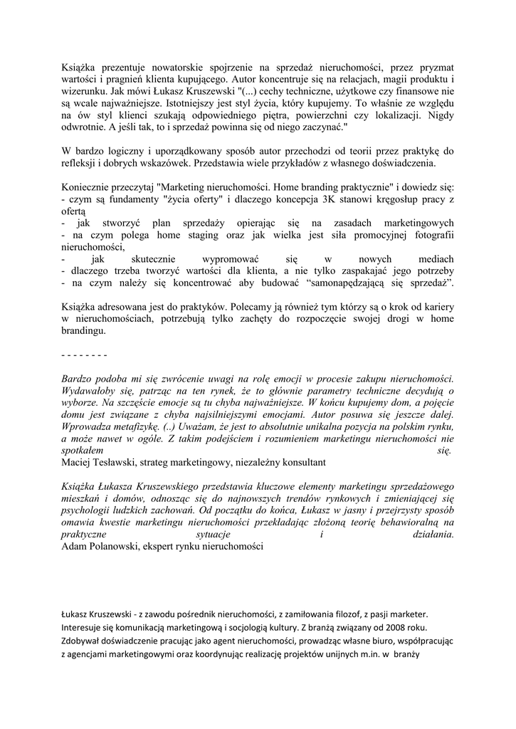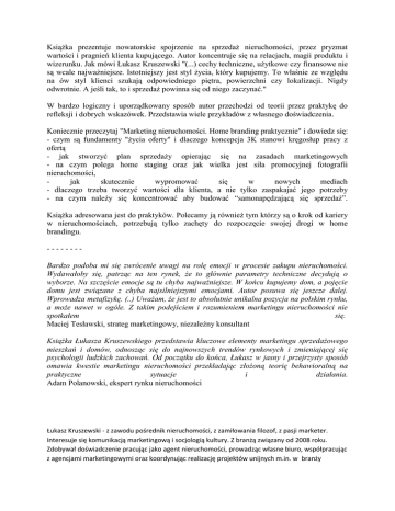 Książka prezentuje nowatorskie spojrzenie na sprzedaż nieruchomości, przez pryzmat wartości i pragnień klienta kupującego. Autor koncentruje się na relacjach, magii produktu i wizerunku. Jak mówi Łukasz Kruszewski "(...) cechy techniczne, użytkowe czy finansowe nie są wcale najważniejsze. Istotniejszy jest styl życia, który kupujemy. To właśnie ze względu na ów styl klienci szukają odpowiedniego piętra, powierzchni czy lokalizacji. Nigdy odwrotnie. A jeśli tak, to i sprzedaż powinna się od niego zaczynać." W bardzo logiczny i uporządkowany sposób autor przechodzi od teorii przez praktykę do refleksji i dobrych wskazówek. Przedstawia wiele przykładów z własnego doświadczenia. Koniecznie przeczytaj "Marketing nieruchomości. Home branding praktycznie" i dowiedz się: - czym są fundamenty "życia oferty" i dlaczego koncepcja 3K stanowi kręgosłup pracy z ofertą - jak stworzyć plan sprzedaży opierając się na zasadach marketingowych - na czym polega home staging oraz jak wielka jest siła promocyjnej fotografii nieruchomości, jak skutecznie wypromować się w nowych mediach - dlaczego trzeba tworzyć wartości dla klienta, a nie tylko zaspakajać jego potrzeby - na czym należy się koncentrować aby budować “samonapędzającą się sprzedaż”. Książka adresowana jest do praktyków. Polecamy ją również tym którzy są o krok od kariery w nieruchomościach, potrzebują tylko zachęty do rozpoczęcie swojej drogi w home brandingu. -------Bardzo podoba mi się zwrócenie uwagi na rolę emocji w procesie zakupu nieruchomości. Wydawałoby się, patrząc na ten rynek, że to głównie parametry techniczne decydują o wyborze. Na szczęście emocje są tu chyba najważniejsze. W końcu kupujemy dom, a pojęcie domu jest związane z chyba najsilniejszymi emocjami. Autor posuwa się jeszcze dalej. Wprowadza metafizykę. (..) Uważam, że jest to absolutnie unikalna pozycja na polskim rynku, a może nawet w ogóle. Z takim podejściem i rozumieniem marketingu nieruchomości nie spotkałem się. Maciej Tesławski, strateg marketingowy, niezależny konsultant Książka Łukasza Kruszewskiego przedstawia kluczowe elementy marketingu sprzedażowego mieszkań i domów, odnosząc się do najnowszych trendów rynkowych i zmieniającej się psychologii ludzkich zachowań. Od początku do końca, Łukasz w jasny i przejrzysty sposób omawia kwestie marketingu nieruchomości przekładając złożoną teorię behawioralną na praktyczne sytuacje i działania. Adam Polanowski, ekspert rynku nieruchomości Łukasz Kruszewski - z zawodu pośrednik nieruchomości, z zamiłowania filozof, z pasji marketer. Interesuje się komunikacją marketingową i socjologią kultury. Z branżą związany od 2008 roku. Zdobywał doświadczenie pracując jako agent nieruchomości, prowadząc własne biuro, współpracując z agencjami marketingowymi oraz koordynując realizację projektów unijnych m.in. w branży nieruchomości i finansów. Związany z marką Freedom Nieruchomości, w której odpowiada za zarządzanie działem marketingu. RECENZJE: Najnowsze rozwiązania brandingowe w realiach polskiego rynku pośrednictwa nieruchomościami – tak w największym skrócie można podsumować książkę Łukasza Kruszewskiego „Marketing nieruchomości”.(...) W książce Łukasza Kruszewskiego udało się przedstawić najnowsze trendy w marketingu, psychologii zachowań konsumenckich oraz antropologii, a następnie odnieść je do praktycznej rzeczywistości sprzedażowej agentów nieruchomości. To solidna dawka rzetelnej, zintensyfikowanej wiedzy – na zaledwie 142 stronach. Pełny tekst recenzji tutaj Autor: Tomasz Piętowski Uważasz, że wszystko doskonale wiesz i nie potrzebujesz żadnych rad od profesjonalisty zajmującego się marketingiem nieruchomości? A może tak Ci się tylko wydaje? Książka Łukasza Kruszewskiego przedstawia kluczowe elementy marketingu sprzedażowego mieszkań i domów, odnosząc się do najnowszych trendów rynkowych i zmieniającej się psychologii ludzkich zachowań. Od początku do końca, Łukasz w jasny i przejrzysty sposób omawia kwestie marketingu nieruchomości przekładając złożoną teorię behawioralną na praktyczne sytuacje i działania. Jestem przekonany, że książka będzie znakomitą i praktyczną lekturą zarówno dla pośredników w obrocie nieruchomościami, jak i dla osób planujących samodzielną sprzedaż nieruchomości. Autor: Adam Polanowski, ekspert rynku nieruchomości Książka, do której recenzji podchodziłem z rezerwą. Z rezerwą dlatego, że uważam, że nie ma wielu „marketingów" uzależnionych od branży, a jest jeden niezależny. Po pierwszych rozdziałach wiedziałem już, że autor uważa podobnie. Bardzo podoba mi się zwrócenie uwagi na rolę emocji w procesie zakupu nieruchomości. Wydawałoby się, patrząc na ten rynek, że to głównie parametry techniczne decydują o wyborze. Na szczęście emocje są tu chyba najważniejsze. W końcu kupujemy dom, a pojęcie domu jest związane z chyba najsilniejszymi emocjami. Autor posuwa się jeszcze dalej. Wprowadza metafizykę. Tu również się z nim zgadzam, bo tym różni się dom od mieszkania. Wchodzimy dzięki autorowi w całą filozofię zakupu/sprzedaży czegoś tak bardzo materialnego jak nieruchomość. W technikach sprzedaży wprowadza nas w podstawowe rozumienie heurystyki. Jak miło. Uważam, że jest to absolutnie unikalna pozycja na polskim rynku, a może nawet w ogóle. Z takim podejściem i rozumieniem marketingu nieruchomości nie spotkałem się. Niestety nawet w innych, mniej „nieruchomościowych" branżach." Autor: Maciej Tesławski, strateg marketingowy, niezależny konsultant Wstęp Rozdział I. Podstawy marketingu nieruchomości Markowy świat konsumenta Nowy paradygmat Home branding Rozdział II. Jak pracować z ofertą nieruchomości Koncepcja 3k Cykl życia oferty Rozdział III. Układanie strategii sprzedaży Cele sprzeda
