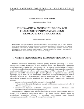 PRACE NAUKOWE POLITECHNIKI WARSZAWSKIEJ z. 102 Transport 2014 Anna Kulbacka, Piotr Ko#oda Akademia Morska w Gdyni INNOWACJE W MORSKICH (RODKACH TRANSPORTU PODNOSZ+CE JEGO EKOLOGICZNY CHARAKTER RHkopis dostarczono: luty 2014 Streszczenie: ArtykuM przedstawia innowacyjne metody dostosowywania siH do coraz bardziej restrykcyjnych przepisów dotyczRcych ochrony Srodowiska naturalnego. Wymienione sR rozwiRzania najbardziej nowoczesnych UródeM napHdów gMównych i pomocniczych statków morskich oraz konstrukcyjne sposoby obniVenia zuVycia paliwa i emisji szkodliwych zwiRzków do atmosfery. S#owa kluczowe: transport morski, energia odnawialna, ekologia 1. ASPEKT EKOLOGICZNY ROZWOJU TRANSPORTU Ochrona Srodowiska naturalnego stanowi gMówny problem cywilizacji XXI wielu. Szczególnie wysokie wymagania w tym zakresie stawia Unia Europejska. Sposobem obniVenia emisji pochodzRcych z transportu w UE i na Swiecie majR byZ nowe technologie w zakresie pojazdów i zarzRdzania ruchem. Bez wprowadzania Vadnych zmian przewiduje siH, Ve zaleVnoSZ transportu od ropy moVe wynosiZ prawie 90%, a jedynie ok 10 % energii pochodziZ ze UródeM odnawialnych [4]. Zasoby opMacalne w wydobycie ropy naftowej wyczerpiR siH za 40-50 lat, co determinuje koniecznoSZ rozwoju alternatywnych paliw i rodzajów napHdów [1]. Wprowadzenie nowych technologii ma na celu pomoc w oszczHdnym gospodarowaniu zasobami bez koniecznoSci ograniczenia mobilnoSci poprzez: " zastosowanie nowych silników, materiaMów i konstrukcji, " wykorzystanie bardziej ekologicznej energii dziHki zastosowaniu nowych paliw i ukMadów napHdowych, " zastosowanie lepszych systemów zarzRdzania ruchem i informacji oraz zaawansowanych Srodków logistycznych [2]. Morza i oceany stanowiR coraz wiHksze znaczenie jako droga komunikacyjna, obecnie ponad 70% przewozów Swiatowych odbywa siH drogR morskR, dlatego wody sR przedmiotem szczególnej ochrony, co powoduje wprowadzanie coraz bardziej wymagajRcych przepisów dotyczRcych transportu morskiego [3]. ! 68 Anna Kulbacka, Piotr KoModa Kluczowym elementem jest obecnie ograniczanie emisji CO2 oraz szkodliwych zawiRzków siarki i azotu do atmosfery. W 2013 roku MiHdzynarodowa Organizacja Morska (IMO) wprowadziMa nowe przepisy regulujRce VeglugH morskR i wymagania odnoSnie norm emisji substancji zanieczyszczajRcych. Zgodnie z VI aneksem konwencji MARPOL O ograniczeniu emisji zaniczyszczei do powietrza. – rozdziaM 4 [5], zmniejszanie iloSci wydzielania gazów przez statki morskie podzielono na fazy czasowe. W tablicy 1 pokazano prognozH obniVania emisji CO2 w latach 2015–2050. Tablica 1 Prognozowanie obni4enia emisji CO2 w czasie wg IMO [11] Termin Do 2013 Do 2015 Do 2020 Do 2025 Do 2030 Do 2050 ObniVenie iloSci emisji CO2 statków morskich WejScie przepisów do stosowania przez okoMo 90% statków we flocie Swiatowej Wymagania speMnienia warunków wskaUników EEDI przez nowe statki Nowe statki muszR zmniejszyZ emisjH CO2 o 20% na tonH/km Statki nowobudowane muszR wykazywaZ zmniejszonR emisjH CO2 o dalsze 20% ObowiRzek zmniejszenia iloSci emitowanych gazów o dalsze 20% Redukcja emisji CO2 o 50% na tonH/km Redukcja emisji CO2 w transporcie morskim zwiRzana jest ze zmniejszeniem zuVycia paliwa, a to prowadzi do mniejszych kosztów eksploatacyjnych. 2. LNG, JAKO PALIWO PRZYJAZNE (RODOWISKU Ostatnio daje siH zauwaVyZ trend wyposaVania coraz wiHkszej liczby projektowanych i nowo budowanych statków bliskiego zasiHgu w systemy napHdowe z silnikami zasilanymi skroplonym gazem ziemnym (LNG). Jest on bogatym UródMem energii i bardziej przyjaznym dla Srodowiska w procesie spalania, a wedMug Komisji Europejskiej [4] najbardziej perspektywicznym alternatywnym paliwem dla transportu wodnego. Od 2015 roku obowiRzywaZ bHdR nowe normy UE odnoszRce siH do limitów zawartoSci siarki w paliwie jednostek pMywajRcych na BaMtyku i Morzu PóMnocnym. DziHki przejSciu na paliwo LNG moVna osiRgnRZ znaczne korzySci m.in. prawie caMkowitR redukcjH SOx i czRsteczek staMych, zmniejszenie emisji NOx nawet do 90%, a CO2 o ok. 20% [7]. 2.1. STATEK CA9KOWICIE NAP:DZANY SPR:;ONYM GAZEM ZIEMNYM PrzykMadem statku napHdzanego paliwem LNG moVe byZ dwustronny prom fiordowy, Moldefjord, zbudowany przez gdaiskR stoczniH RemontowR Shipbuilding S.A. dla norweskiego armatora! Fjord1 MRF AS [10]. Jednostka napHdzana jest wyMRcznie LNG i awaryjnie gazem CNG.! Statek o dMugoSci 122 m. moVe pomieSciZ 390 pasaVerów, 128 samochodów osobowych lub 12 zestawów drogowych i 55 samochodów. Jest wprawiany ! Innowacje w morskich Srodkach transportu podnoszRce jego ekologiczny charakter 69 w ruch za pomocR elektrycznych pHdników, które zasila energia elektryczna wytwarzana przez generatory napHdzane silnikami gazowymi o mocy po 900 kW kaVdy. Silniki i zbiornik gazu umieszczone zostaMy w kontenerach o minimalnej objHtoSci tuV pod pokMadem. DziHki temu w przypadku wycieku gaz rozprzestrzenia siH w minimalnej przestrzeni, a rozprHVajRce siH paliwo jako lVejsze od powietrza, ulatuje, nie dostajRc siH do pozostaMych pomieszczei statku, w czym pomaga równieV system wentylacyjny. ZewnHtrzna warstwa sieci rurociRgów doprowadzajRcych gaz do silnika jest wentylowana, a iloSZ gazu monitorowana w celu szybkiego wykrycia ewentualnego wycieku. Moldefjeld, pierwszy wSród czterech bliUniaczych jednostek otrzymaM tytuM „Ekologicznego Statku Roku 2010”. 3. STATKI ELEKTRYCZNE CiekawR alternatywR na przyszMoSZ sR statki wykorzystujRce energiH elektrycznR do napHdzania jednostki, co wykorzystuje siH na okrHtach podwodnych. Na typowych statkach z generatorem diesla i oddzielnym silnikiem diesla napHdzajRcym gMówny waM ze SrubR prHdkoSZ obrotowa Sruby i silnika sR ze sobR sprzHVone, a efektywnoSZ zuVycia paliwa spada przy niskich prHdkoSciach. NapHd spalinowo-elektryczny, czyli generatory napHdzane silnikiem diesla i silnik elektryczny napHdzajRcy gMównR SrubH napHdowR, utrzymuje pracH silnika na optymalnym poziomie, niezaleVnie od prHdkoSci statku. EnergiH elektrycznR stosuje siH m.