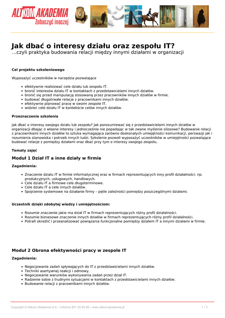 Jak dbać o interesy działu oraz zespołu IT? …czyli praktyka budowania relacji między innymi działami w organizacji Cel projektu szkoleniowego Wyposażyć uczestników w narzędzia pozwalające efektywnie realizować cele działu lub zespołu IT. bronić interesów działu IT w kontaktach z przedstawicielami innych działów. bronić się przed manipulacją stosowaną przez pracowników innych działów w firmie. budować długotrwałe relacje z pracownikami innych działów. efektywnie planować pracę w swoim zespole IT. widzieć cele działu IT w kontekście celów innych działów. Przeznaczenie szkolenia Jak dbać o interesy swojego działu lub zespołu? Jak porozumiewać się z przedstawicielami innych działów w organizacji dbając o własne interesy i jednocześnie nie popadając w tak zwane myślenie silosowe? Budowanie relacji z pracownikami innych działów to sztuka wymagająca zarówno doskonałych umiejętności komunikacji, perswazji jak i rozumienia stanowiska i potrzeb innych ludzi. Szkolenie pozwoli wyposażyć uczestników w umiejętności pozwalające budować relacje z pomiędzy działami oraz dbać przy tym o interesy swojego zespołu. Tematy zajęć Moduł 1 Dział IT a inne działy w firmie Zagadnienia: Znaczenie działu IT w firmie informatycznej oraz w firmach reprezentujących inny profil działalności: np. produkcyjnych, usługowych, handlowych. Cele działu IT a firmowe cele długoterminowe. Cele działu IT a cele innych działów. Spojrzenie systemowe na działanie firmy – pętle zależności pomiędzy poszczególnymi działami. Uczestnik dzięki zdobytej wiedzy i umiejętnościom: Rozumie znaczenie jakie ma dział IT w firmach reprezentujących różny profil działalności. Rozumie biznesowe znaczenie innych działów w firmach reprezentujących różny profil działalności. Potrafi określić i przeanalizować powiązania funkcjonalne pomiędzy działem IT a innymi działami w firmie. Moduł 2 Obrona efektywności pracy w zespole IT Zagadnienia: Negocjowanie zadań spływających do IT z przedstawicielami innych działów. Techniki asertywnej reakcji i odmowy. Negocjowanie warunków wykonywania zadań przez dział IT. Radzenie sobie z trudnymi sytuacjami w kontaktach z przedstawicielami innych działów. Budowanie relacji z pracownikami innych działów. Copyright © Altkom Akademia S.A. • Infolinia 801 25 85 66 • www.altkomakademia.pl 1/3 Uczestnik dzięki zdobytej wiedzy i umiejętnościom: Potrafi skutecznie negocjować z przedstawicielami innych działów zakres oraz warunki prac, które są zlecane działowi IT. Potrafi skutecznie stosować techniki komunikacji asertywnej i odmowy. Potrafi radzić sobie w sytuacjach trudnych podczas rozmów z przedstawicielami innych działów. Potrafi budować partnerskie relacje z pracownikami innych działów. Moduł 3 Sytuacje konfliktowe w relacjach z pracownikami innych działów Zagadnienia: Najczęstsze przyczyny konfliktów pracowników działów IT z pracownikami innych działów. Fazy i rodzaje konfliktów. Strategie reakcji na konflikt. Metody rozwiązywania konfliktów i dochodzenia do konsensusu. Uczestnik dzięki zdobytej wiedzy i umiejętnościom: Zna najczęstsze przyczyny konfliktów między działami i potrafi ich unikać. Potrafi zapobiegać eskalacji konfliktów między działem IT a innymi działami. Zna strategie reakcji na konflikt i potrafi dobrać je w taki sposób aby zmaksymalizować szanse osiągnięcia porozumienia z przedstawicielami innych działów. Moduł 4 Kiedy inni nie działają fair… Zagadnienia: Obrona przed manipulacją stosowaną przez pracowników innych działów. Obrona przed nielogiczną i niewłaściwą argumentacją ze strony innych – radzenie sobie z argumentacją erystyczną. Wpływ społeczny – czyli jak etycznie wpływać na innych. Uczestnik dzięki zdobytej wiedzy i umiejętnościom: Potrafi bronić się przed manipulacją stosowaną przez pracowników innych działów. Potrafi radzić sobie z nielogiczną i erystyczną argumentacją innych. Potrafi wykorzystać techniki wpływu społecznego aby wpływać na zdanie innych osób. Moduł 5 Planowanie efektywnej pracy w dziale IT Zagadnienia: Wyznaczenie priorytetów działań z uwzględnieniem celów działu IT oraz celów innych działów. Copyright © Altkom Akademia S.A. • Infolinia 801 25 85 66 • www.altkomakademia.pl 2/3 Zarządzanie zadaniami zgodnie z modelem naturalnego planowania. Estymowanie niezbędnego do realizacji poszczególnych zadań – planning poker. Uczestnik dzięki zdobytej wiedzy i umiejętnościom: Potrafi efektywnie zarządzać pracą zespołu IT z uwzględnieniem kluczowych celów innych działów. Potrafi wykorzystać w praktyce model naturalnego planowania. Potrafi wykorzystać w praktyce planning pokera. Moduł 6 Budowanie relacji czyli długoterminowa współpraca Zagadnienia: Narzędzia budowania relacji między działem IT a innymi działami w firmie. Budowanie wizerunku działu IT. Plany na przyszłość – czyli co mogę zrobić aby dział IT efektywnie współpracował z innymi działami w firmie? Uczestnik dzięki zdobytej wiedzy i umiejętnościom: Potrafi budować relacje z pracownikami innych działów. Korzyści wynikające z ukończenia szkolenia Po ukończeniu szkolenia uczestnik potrafi: radzić sobie z nierealistycznymi zadaniami zlecanymi IT przez inne działy bronić interesów swojego zespołu. radzić sobie z manipulacją innych osób. wykorzystać techniki wpływu społecznego w celu obrony interesów działu IT. rozwiązywać konflikty na linii dział IT – inne działy. budować długoterminowe relacje z innymi działami. budować pozytywny wizerunek działu IT. Metoda szkolenia Warsztaty Wykład Kod szkolenia HR-BRwIT Czas trwania 2 dni / 16 h Poziom szkolenia Podstawowy Autoryzacja Copyright © Altkom Akademia S.A. • Infolinia 801 25 85 66 • www.altkomakademia.pl 3/3