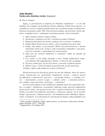 John Ruskin Sztuka jako dziedzina wiedzy (fragment)1 W. Pan F. Tempie 2 S dz , i powinienem tu dopisa do Pa skiej wiadomo ci – co nie dla ka dego, kto zajmuje si projektem reformy edukacji, byłoby do przyj cia – e zasadnicza warto mojego projektu mo e by uzyskana drog rozumnej kondensacji programu nauki. Dla zilustrowania podaj , jak powinna, moim zdaniem, wygl da karta z zadaniami egzaminacyjnymi z kursu botaniki: Opisz budow takiej a takiej ro liny. Naszkicuj (z pami ci) jej li i odcinek jej gał zi (łodygi). Wyja nij matematyczne prawa rz dz ce jej wzrostem i struktur . Podaj skład chemiczny jej soków w poszczególnych porach roku. Podaj, jaki mamy z niej po ytek. Okre l jej pokrewie stwa z innymi rodzinami ro lin oraz zaznacz, jaki ewentualny widziałby z niej po ytek poza znanymi ci sposobami jej zastosowania. 6. Jaka jest jej warto handlowa w Londynie? Jakie s metody jej uprawiania? 7. Czy znana ci jest jaka legenda o niej? Podaj najbardziej rozpowszechnione lub najpi kniejsze ba nie, w których ona wyst puje. 8. Przytocz odnosz ce si do niej słowa z utworów wielkich poetów. 9. Okre l czasy, w których ludzie j poznali lub zacz li uprawia . 10. Opisz wpływ, jaki miała na rozwój cywilizacji. 1. 2. 3. 4. 5. W ród powy szych dziesi ciu pyta nie ma ani jednego, które by oprócz wiedzy botanicznej nie sprawdzało wiadomo ci ucznia z zakresu innych przedmiotów, a mianowicie: pierwsze – z geografii, drugie – z rysunku, trzecie – z matematyki, czwarte i pi te – z chemii, szóste – z ekonomii politycznej, siódme, ósme dziewi te i dziesi te – z literatury. Liczba ro lin obj ta a tak wnikliwymi studiami mo e by naturalnie bardzo szczupła i obejmowa racjonalnie dobran grup spo ród najbardziej u ytecznych ro lin, tak egzotycznych, jak i rozpowszechnionych w tym kraju. Nauka wszystkich przedmiotów powinna w wi kszym stopniu, ni to bywało dot d, zapoznawa z faktami ani eli z ich kompleksowymi układami. Opanowanie rozległych, wszechstronnych i powi zanych mi dzy sob pogl dów jest Tekst z ksi ki J. Ruskina, Sztuka, społecze stwo, wychowanie (wybór pism). Ossolineum, Wrocław 1977, s. 249-258. 2 Fragment listu z 25 wrze nia 1857 r. 1 niemo liwe dla wi kszo ci ludzi. Systemy, których ich ucz , s dla nich niczym wi cej jak szkieletami. Prawie wszyscy s jednak w stanie poj stosunki ł cz ce nieliczne fakty maj ce wpływ na ycie codzienne, których przykłady wyst powania znajduj si w zasi gu ich do wiadczenia. Nauka za stanie si wkrótce tak rozległa, i najbardziej wszechstronnie wykształceni ludzie obraca si b d jeszcze i tak w w skim kr gu zagadnie . Przekonamy si wówczas, e warto raczej uczy młodzie koncentrowa cał energi intelektu na okre lonych punktach, ani eli rozprasza j na niesko czenie rozległe horyzonty wiedzy, z której niczego nie b d mogli dla siebie czerpa ani niczego jej z siebie u yczy .