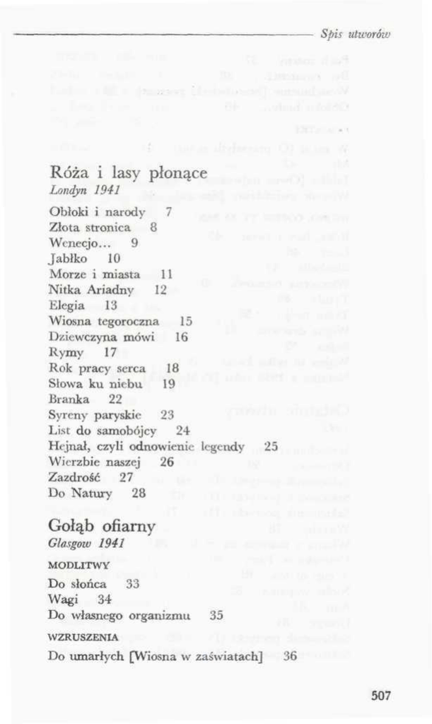 — Spis utworów Róża i lasy płonące Londyn 1941 Obłoki i narody 7 Złota stronica 8 Wenecjo... 9 Jabłko 10 Morze i miasta 11 Nitka Ariadny 12 Elegia 13 Wiosna tegoroczna 15 Dziewczyna mówi 16 Rymy 17 Rok pracy serca 18 Słowa ku niebu 19 Branka 22 Syreny paryskie 23 List do samobójcy 24 Hejnał, czyli odnowienie legendy Wierzbie naszej 26 Zazdrość 27 Do Natury 28 25 Gołąb ofiarny Glasgow 1941 MODLITWY Do słońca 33 Wagi 34 Do własnego organizmu 35 WZRUSZENIA Do umarłych [Wiosna w zaświatach] 36 507 Spis utworów Puch marny 37 Być kwiatem?... 38 Westchnienie [Staroświecki poemat] Obłoku biały... 40 39 PAMIĄTKI W maju [O przyszłym maju] 41 My... 42 Jabłko [Owoc najwyższy] 43 Wieczór gwiaździsty [Smuga] 44 WOJNO, CÓŻESZ TY ZA PANI... Róża, lasy i świat 45 Łuny 46 Bluebells 47 Wieczorna rozmowa 48 Tytuły 49 Tylko twój... 50 Wojna drzewna 51 Bajka 52 Wojna to tylko kwiat 53 Notatka z 1938 roku [Październik] Ostatnie utwory 1945 Wszechmocnemu [Modlitwa] 57 Odpowiedzi 59 Szkicownik poetycki (I) 60 Szkicownik poetycki (II) 67 Szkicownik poetycki (III) 71 Wierzby 78 Wiosna z marsem na czole 79 Ucieczka w Tatry 80 A cup of tea 81 Niobe wojenna 82 Ann 83 George 84 Szkicownik poetycki (IV) 85 Szkicownik poetycki (V) 90 508 54 — Spis utworów WIERSZE O LIŚCIACH Zielone miasto 95 Łodzie bez wioseł 96 „...Leci liście z drzewa" Tej jesieni 98 97 WIERSZE Na chmurnych skrzydłach 99 W deszczu nadmorskim 100 Przeciw „keep smiling" 101 Mur wodny 102 Słowo życiodajne 103 Cień 104 Szkicownik poetycki (VI) Pejzaż pogodny 109 Wspomnienia z łąk 110 Maki obrodzą po wojnie W pajęczynie 105 111 112 Mucha 113 Obca duszo... 114 I ani lilii wodnej 115 Pociechy 116 Dla Minotaura 117 Sen 118 Zazdrość 119 Szkicownik wojenny (VII) 120 Lady Godiva i jeździec Apokalipsy O nieżywej 123 Nieruchomi 124 Cyganka mówi 125 Czarne algi... 126 Droga jedyna 127 Szkicownik poetycki (VIII) 128 122 Rubayaty wojenne (I) Blue sky... 135 Zdrowe miejsce 135 Burza ludzka 135 509 Spis utworów Samotne piękno 135 Krzak niepocieszony 136 Młodości, podaj mi skrzydła! 136 Maki obrodzą... 136 Rodacy 136 Smutno mi, Boże 136 Do rozgwiazdy 137 Lato wojenne 137 Rozmowa z Omarem 137 Barwy morza 137 Obojętność obcych poetów 137 Zapomniane Słowianki 138 Fiołek i róża 138 Czterej jeźdźcy Apokalipsy 138 Cud zieleni 138 Rubayaty wojenne (II) Wojna chmur 139 Śmierć przez lawinę 139 Za długo... 139 Jaskiniowcy 140 Passiflora 140 Nasz ogród... 140 Sztygar zasypany 140 Próba rozłąki w tym światem 140 Mrówcza przyszłość 141 Wróżby 141 Ruina wioski afrykańskiej 141 Wzajemność 141 Człowiek dzisiejszy 141 Upojna zemsta 142 Chwila zwątpienia 142 W gorączce 142 Słowo uprzykrzone 142 Nowy świat 142 Cień 143 Rubayaty wojenne (III) Niebo za niebem... 144 510 Spis utworów Opieka złego ducha 144 Bliźni 144 Samobójca 144 Skromne żądania... 145 Żurawie 145 Drogą wydarzeń 145 Przemijanie 145 Dziecko-człowiek 146 Szkicownik wojenny (IX) 147 Rubayaty wojenne (IV) Bezpieczna rodzina 149 Pobojowisko 149 Grobowce 149 Jeszcze jedno lato 149 Mrowisko 150 Któregoś dnia... 150 Zamęt 150 Obraz ziemi 150 Pejzaż z 39 roku 150 Trzy rubayaty o miłości Kto dzisiaj kocha... 151 Najcięższa z miłości 151 Nie wrócę więcej 151 Tajemnica 152 Pożar 153 Ranny... 154 Dwaj grenadierzy... 155 Co nam zostało 156 Wojna 157 Legenda Tatr 158 Kraków... 159 Rubayaty wojenne (V) Słowa wyczekiwane 160 Nieład pod ziemią 160 Obelga 160 Zamęt 161 511 Spis utworów Kobieta dzisiejsza 161 Anioł odszedł... 161 Marzenia dziewczęce 161 Głos świata 161 Ziemia grająca 162 Czarne wino 162 Łzy radości 162 Zwątpienie 162 Nie dla mnie... 162 Mgła 163 Perła 163 Zwodnicza przeszłość 163 Wiślane wino 163 Wiersze wigilijne Imię tej wojny 164 Samotnik 164 Życzenia... 164 Gwiazda odkryta w 42 roku W święto rodziny... 165 Christmas cards... 165 Poeta i radio 165 Bombomówstwo 166 Sepia 166 Rubayaty wojenne (VI) Jak lew 167 Zagmatwanie 167 Kompleks niższości 167 Rezygnacja 167 Twórczość ludzka 168 Ból fizyczny 168 Opinia lwa... 168 O zachodzie 168 „A jak poszedł król..." 169 Treny wiślane 171 Poetka i jej znajomy 173 Przepowiednie 174 512 164 Spis utworów Fraszka ironiczna 175 Owad ludzki 176 Liście krakowskie 177 Szkicownik poetycki (X) O miłości rodzinnej 178 Fraszka złośliwa 185 Jesień nasza 186 Złoto jesienne 187 Rozmowa z sercem 188 Wrażenia 189 Zwykłe matczysko 191 Kłosy na niebie 193 Westchnienie 194 Fatamorgany 195 Poczta na obczyźnie 196 Telegraf 197 Biały kwiat 198 Marność tęczowa 199 Na Księżycu 200 Wojenna nowela 201 Stary olejny obraz 202 Wiersze o Krakowie Błonia 203 Planty 203 Ogród Botaniczny na ul. Kopernika 203 Prawa Ogrodu Botanicznego 204 O śniegu w lecie 204 Omar Khayam i Droga Mleczna 206 Światło w ciemnościach... 208 Plejady 210 Pod mapą nieba... 211 Na promenadzie 212 „Piąty żywioł" 214 Chwasty morskie 216 Wierzba przydrożna 217 Wiersze o zimnie 218 33 — Poezje II 513 Spis utworów Popularne lekarstwa Bławatek... 221 Konwalia... 221 Naparstnica... 221 Wiersze 222 Wiersze rozproszone IUVENILIA Marzec 227 Morskie Oko 228 Jak szaleją gołębie na jaskrawym niebie Tyniec 230 Bielany 231 Polecieć mi ku tobie... 232 Niewolnica... 233 Natura 235 Las w deszczu 236 Noce świętego Mikołaja 238 Kapliczka na rozstajnych drogach 239 Ballada 241 Z cyklu: NIEWOLNICA Cisza 242 Chciałbym zaśpiewać ci... 243 O zachodzie 244 Chustki i serdaki 246 Twoje imię... 247 Pawie oko 248 Świt 249 Biały krzyżak 250 Wiosna 251 Droga 252 Oceanie... 253 Smutek 254 A gdy przyszedł 255 Jeśliś jest prawdą... 256 Ostatnia chwila 257 Niedobre, stare słońce 258 514 229 Spis utworów — Milczenie (1904) 259 O błękicie wód w okienku kajuty... 260 Modlitwa 262 Wiosna 264 Niewolnica 265 Ustom ich jedno te czereśnie... 266 Pieśń błękitu i róż 267 Wichrom 269 Deszcz nieustannie płacze na polanie 270 Wdeptałeś mnie Panie 272 Sluch