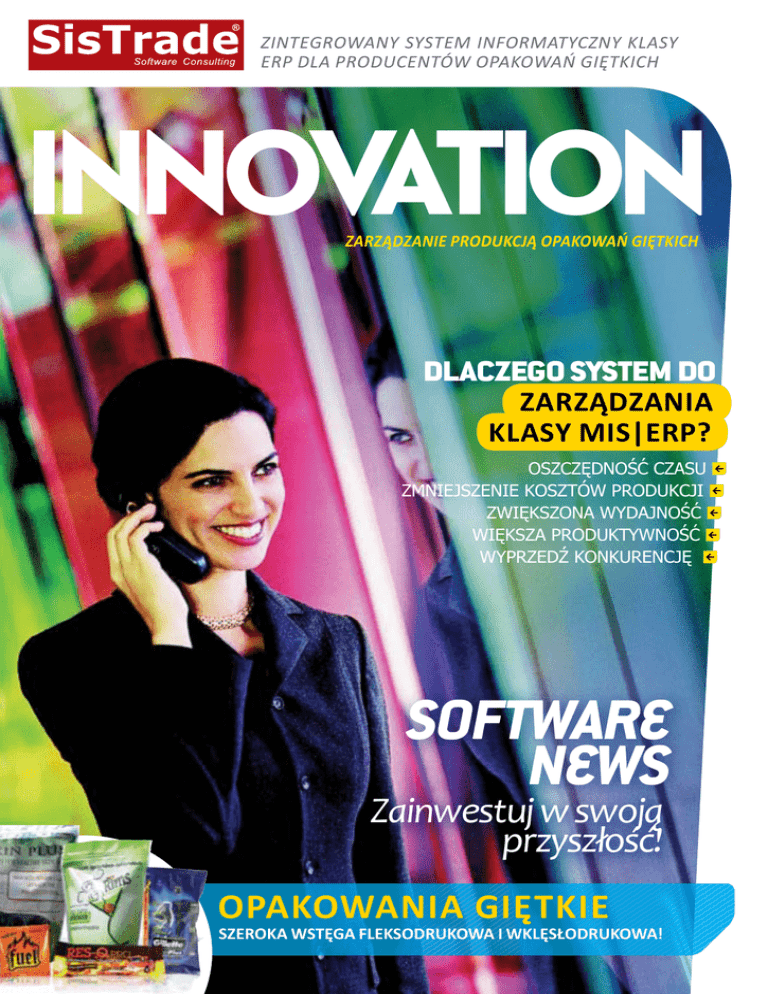 Zintegrowany system informatyczny klasy ERP dla producentów opakowań giętkich INNOVATion ZARZĄDZANIE PRODUKCJĄ OPAKOWAŃ GIĘTKICH Dlaczego system DO zarządzania klasy MIS|ERP? Oszczędność czasu Zmniejszenie kosztów produkcji Zwiększona wydajność Większa produktywność Wyprzedź konkurencję Software news Zainwestuj w swoją przyszłość! Opakowania giętkie Szeroka wstęga fleksodrukowa i wklęsłodrukowa! Rozwiązania ID Sistrade MIS|ERP Sistrade® Kim jesteśmy? SISTRADE – Software Consulting, S.A. jest międzynarodowym producentem zintegrowanych systemów informatycznych klasy MIS|ERP dla branży opakowaniowej. s 2 INNOVATION jakości, mobile business, zarządzanie projektami. Powyższe moduły są skonfigurowane, każdy odpowiednio pod potrzeby druku offsetowego, gazet, produkcji etykiet, opakowań twardych (pudełek) , tekturę falistą, opakowań giętkich (szeroka wstęga fleksograficzna i wklęsłodrukowa), oraz druku cyfrowego. Innowacyjność SISTRADE jest firmą certyfikowaną NP 4457: 2007 przez Portugalski Instytut Akredytacji (IPAC). Wdrożenie standardu, umożliwiło usystematyzowanie procesów innowacji, badań i rozwoju. Od momentu powstania, firma SISTRADE brała udział w projektach badawczych z wieloma jednostkami krajowego systemu naukowego taki- System Sistrade ISTRADE - Software Consulting, S.A. jest międzynarodowym producentem zintegrowanych systemów informatycznych klasy MIS|ERP dla branży opakowaniowej. Połączenie innowacyjnego oprogramowania, łącznie z doświadczonym zespołem doradców zapewnia firmie pozycję lidera w segmencie systemów MIS|ERP dla przemysłu opakowaniowego. Oprogramowanie Sistrade to wiedza poligraficzna i biznesowa, nabyta podczas wielu wdrożeń w najróżniejszych zakątkach świata. To wiedza o procesach technologicznych, biznesowych, kulturze pracy w przemyśle opakowaniowym. To również znajomość ograniczeń poligrafii oraz sposobów usprawnienia produkcji. • Kalkulacje • Zarządzanie sprzedażąt • Zarządzanie finansami • Zarządzanie zasobami ludzkimi • Zarządzanie aktywami trwałymi • Zarządzanie technologią • Magazyn i zakupy • Zarządzanie produkcją • MES - SCADA i Sterowanie produkcją • Zbieranie informacji z maszyn Zintegrowany informatyczny system MIS|ERP spinający wszystkie działy przedsiębiorstwa opakowaniowego. Sistrade oferuje rozbudowany moduł kalkulacyjny, zarządzanie sprzedażą, finansami, zasobami ludzkimi, aktywami trwałymi, technologią, działem jakości, magazynem i zakupami. To unikalne narzędzie do zarządzania produkcją, zbierania informacji z maszyn produkcyjnych (SCADA & SFC), sterowania produkcją, planowania, planowanie. To również rozwiązanie wykorzystujące mobile picking, e-biznes oraz JDF. Prawdziwymi unikatami są moduły Balanced Scorecard, moduł utrzymania ruchu, kontrola Sektory rynku gdzie można znaleźć SISTRADE Przemysł opakowaniowy • Druk offsetowy • Druk gazetowy • Druk etykietowy • Druki zabezpieczone • Druk opakowań twardych • Druk opakowań giętkich • Druk cyfrowy Branże pokrewne • Przemysł metalurgiczny • Produkcja etykiet tekstylnych • Przemysł włókienniczy • Przemysł spożywczy • Produkcja folii mi jak INESC (Instytut Systemów i Inżynierii Komputerowej) oraz FEUP (Wydział Inżynierii Uniwersytetu w Porto), szukając wspólnej płaszczyzny i miejsca wymiany wiedzy między środowiskami akademickimi i biznesowymi. Certyfikat jakości ISO 9001: 2008 SISTRADE posiada certyfikat ISO 9001: 2008. Dążenie do zapewnienia najwyższej jakości produktów i usług dla klientów, doprowadziły firmę do wdrożenia tego standardu. Nasz priorytet to zwiększenie satysfakcji klientów, jak i pracę na drodze ciągłego i nieustannego rozwoju. Wartości firmy W firmie SISTRADE dostęp do najnowocześniejszych technologii informatycznych jest codziennością. Wiedza technologiczna oraz doświadczenie jest przekazywane wielokierunkowo, pomiędzy poszczególnymi działami firmy. Konsultanci zobligowani są do posiadania wiedzy z zakresu najnowocześniejszych technologii informatycznych i poligraficznych. Firma posiada liczne certyfikaty poświadczające znajomość swojej branży (Microsoft Gold Certificate). Rozwój SISTRADE napędzany jest poprzez wprowadzenie do życia firmy podstawowych wartości, takich jak: zdolność do innowacji, praca grupowa, ciągłe samodoskonale- produkcyjnych • Planowanie • Mobile Picking • E-biznes • JDF • Balanced Scorecard • Utrzymanie ruchu • Kontrola jakości • Mobile Business • Zarządzanie projektami • Zarządzanie energią • Business Intelligence • Web2Print • Ekoefektywność nie, kreatywność, jakość, przejrzystość, elastyczność, profesjonalna etyka, skromność. Promujemy również w firmie wartości społeczne, z których solidarność ma szczególne znaczenie. Wartości kulturowe i czynniki, takie jak harmonia, poszanowanie środowiska i dążenie do doskonałości zawsze będą towarzyszyć rozwojowi firmy. Misja SISTRADE to partnerstwo z klientami mające jeden wspólny cel - stworzenie dobrych relacji . To wdrożenie systemu wspierającego podejmowanie decyzji, usprawniającego produkcję przy zachowaniu dobrych relacji z klientem i zaspokojeniu jego potrzeb biznesowych. Partnerzy Nieodłącznym aspektem firmy SISTRADE jest dbanie o dobre relacje z innymi dostawcami rozwiązań dla rynku poligraficznego. Wymiana wiedzy, doświadczeń, wspólne doskonalenie oferowanych produktów służą jednemu celowi. Służą podniesieniu zadowolenia klienta końcowego. Zintegrowany system informatyczny klasy ERP dla producentów opakowań giętkich 3 Alsecus Comércio e Indústria, SA Grupo Polivouga KLIENCI Alsecus – Comércio e Indústria, SA. jest portugalską drukarnią nalezącą do grupy POLIVOGUA. Wybór systemu Sistrade, firma uzasadnia tym, iż tylko w systemie firmy SISTRADE uwzględnione i doskonale sparametryzowane są proc