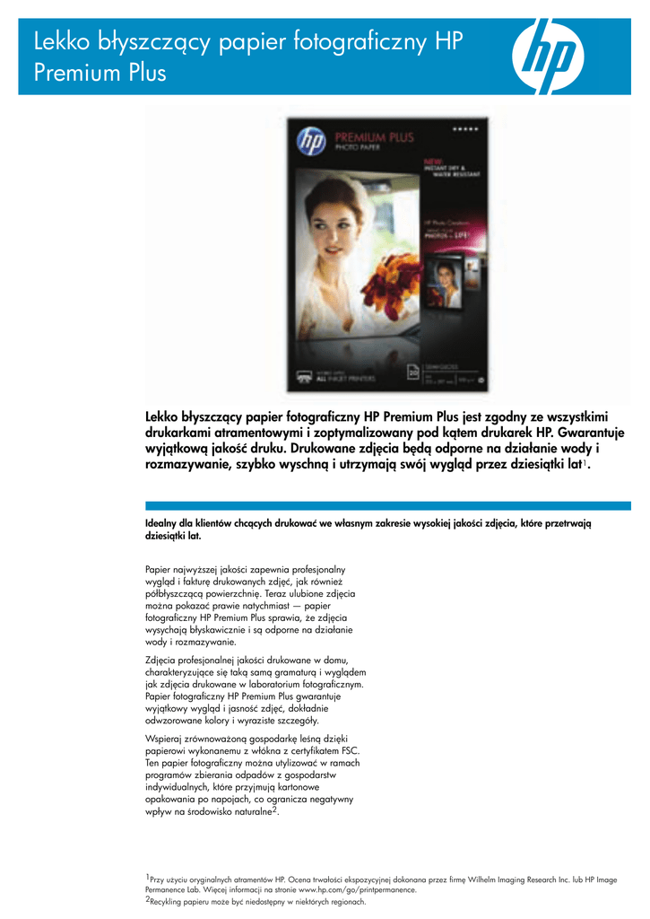 Lekko błyszczący papier fotograficzny HP Premium Plus Lekko błyszczący papier fotograficzny HP Premium Plus jest zgodny ze wszystkimi drukarkami atramentowymi i zoptymalizowany pod kątem drukarek HP. Gwarantuje wyjątkową jakość druku. Drukowane zdjęcia będą odporne na działanie wody i rozmazywanie, szybko wyschną i utrzymają swój wygląd przez dziesiątki lat 1. Idealny dla klientów chcących drukować we własnym zakresie wysokiej jakości zdjęcia, które przetrwają dziesiątki lat. Papier najwyższej jakości zapewnia profesjonalny wygląd i fakturę drukowanych zdjęć, jak również półbłyszczącą powierzchnię. Teraz ulubione zdjęcia można pokazać prawie natychmiast — papier fotograficzny HP Premium Plus sprawia, że zdjęcia wysychają błyskawicznie i są odporne na działanie wody i rozmazywanie. Zdjęcia profesjonalnej jakości drukowane w domu, charakteryzujące się taką samą gramaturą i wyglądem jak zdjęcia drukowane w laboratorium fotograficznym. Papier fotograficzny HP Premium Plus gwarantuje wyjątkowy wygląd i jasność zdjęć, dokładnie odwzorowane kolory i wyraziste szczegóły. Wspieraj zrównoważoną gospodarkę leśną dzięki papierowi wykonanemu z włókna z certyfikatem FSC. Ten papier fotograficzny można utylizować w ramach programów zbierania odpadów z gospodarstw indywidualnych, które przyjmują kartonowe opakowania po napojach, co ogranicza negatywny wpływ na środowisko naturalne2. 1Przy użyciu oryginalnych atramentów HP. Ocena trwałości ekspozycyjnej dokonana przez firmę Wilhelm Imaging Research Inc. lub HP Image Permanence Lab. Więcej informacji na stronie www.hp.com/go/printpermanence. 2Recykling papieru może być niedostępny w niektórych regionach. Lekko błyszczący papier fotograficzny HP Premium Plus Dane techniczne produktu P/N Opis Wykończenie Waga Format papieru arkuszy w opakowaniu CR673A Lekko błyszczący papier fotograficzny HP Premium Plus Półbłyszczący 300 g/m² 210 x 297 mm 20 Zgodny ze wszystkimi drukarkami atramentowymi © Copyright 2011 Hewlett-Packard Development Company, L.P. Informacje zawarte w tym dokumencie mogą bez uprzedzenia ulec zmianie. Jedyne gwarancje, jakich HP udziela na produkty i usługi, są określone w oświadczeniach gwarancyjnych dostarczanych wraz z takimi produktami i usługami. Żaden zapis niniejszego dokumentu nie może być uważany za dodatkową gwarancję. HP nie ponosi odpowiedzialności za błędy techniczne lub redakcyjne oraz braki występujące w niniejszym dokumencie. Aby uzyskać więcej informacji na temat materiałów konsumpcyjnych HP, odwiedź http://www.hp.com Publikacja na region EMEA 4AA3-4066PLE