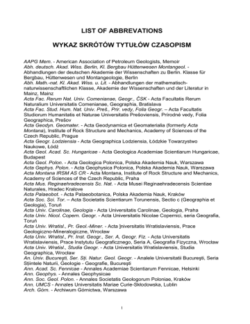 LIST OF ABBREVATIONS WYKAZ SKRÓTÓW TYTUŁÓW CZASOPISM AAPG Mem. - American Association of Petroleum Geologists, Memoir Abh. deutsch. Akad. Wiss. Berlin, Kl. Bergbau Hüttenwesen Montangeol. Abhandlungen der deutschen Akademie der Wissenschaften zu Berlin. Klasse für Bergbau, Hüttenwesen und Montangeologie, Berlin Abh. Math.-nat. Kl. Akad. Wiss. u. Lit. - Abhandlungen der mathematischnaturwissenschaftlichen Klasse, Akademie der Wissenschaften und der Literatur in Mainz, Mainz Acta Fac. Rerum Nat. Univ. Comenianae, Geogr., ČSK - Acta Facultatis Rerum Naturalium Universitatis Comenianae, Geographia, Bratislava Acta Fac. Stud. Hum. Nat. Univ. Preš., Prir. vedy, Folia Geogr. – Acta Facultatis Studiorum Humanitatis et Naturae Universitatis Prešoviensis, Prírodné vedy, Folia Geographica, Prešov Acta Geodyn. Geomater. - Acta Geodynamica et Geomaterialia (formerly Acta Montana), Institute of Rock Structure and Mechanics, Academy of Sciences of the Czech Republic, Prague Acta Geogr. Lodziensia - Acta Geographica Lodziensia, Łódzkie Towarzystwo Naukowe, Łódź Acta Geol. Acad. Sc. Hungaricae - Acta Geologica Academiae Scientiarum Hungaricae, Budapest Acta Geol. Polon. - Acta Geologica Polonica, Polska Akademia Nauk, Warszawa Acta Gephys. Polon. - Acta Geophysica Polonica, Polska Akademia Nauk, Warszawa Acta Montana IRSM AS CR - Acta Montana, Institute of Rock Structure and Mechanics, Academy of Sciences of the Czech Republic, Praha Acta Mus. Reginaehradecensis Sc. Nat. - Acta Musei Reginaehradecensis Scientiae Naturales, Hradec Kralove Acta Palaeobot. - Acta Palaeobotanica, Polska Akademia Nauk, Kraków Acta Soc. Sci. Tor. – Acta Societatis Scientiarum Torunensis, Sectio c (Geographia et Geologia), Toruń Acta Univ. Carolinae, Geologia - Acta Universitatis Carolinae, Geologia, Praha Acta Univ. Nicol. Copern. Geogr. - Acta Universitatis Nicolae Copernici, seria Geografia, Toruń Acta Univ. Wratisl., Pr. Geol.-Miner. - Acta ]niversitatis Wratislaviensis, Prace Geologiczno-Mineralogiczne, Wrocław Acta Univ. Wratisl., Pr. Inst. Geogr., Ser. A, Geogr. Fiz. - Acta Universitatis Wratislaviensis, Prace Instytutu Geograficznego, Seria A, Geografia Fizyczna, Wrocław Acta Univ. Wratisl., Studia Geogr. - Acta Universitatis Wratislaviensis, Studia Geographica, Wrocław An. Univ. Bucureşti, Ser. Sţi. Natur. Geol. Geogr. - Analele Universitatii Bucureşti, Seria Sţiintele Naturii, Geologie - Geografie, Bucureşti Ann. Acad. Sc. Fennicae - Annales Academiae Scientiarum Fennicae, Helsinki Ann. Geophys. - Annales Geophysicae Ann. Soc. Geol. Polon. - Annales Societatis Geologorum Poloniae, Kraków Ann. UMCS - Annales Universitatis Mariae Curie-Skłodowska, Lublin Arch. Górn. - Archiwum Górnictwa, Warszawa 1 Arch. Górn. Hutn. - Archiwum Górnictwa i Hutnictwa, Warszawa Art. Satellites - Artificial Satellites, Journal of Planetary Geodesy, Warszawa Baltica - Vilnius Berliner geogr. Arbeiten - Berliner geographische Arbeiten, Berlin Biul. Geol. Uniw. Warsz. - Biuletyn Geologiczny Uniwersytetu Warszawskiego, Warszawa Biul. Inst. Geol. - Biuletyn Instytutu Geologicznego, Warszawa Biul. Lub. Tow. Nauk. - Biuletyn Lubelskiego Towarzystwa Geologicznego, Lublin Biul. P.I.G. - Biuletyn Państwowego Instytutu Geologicznego, Warszawa Brandeburg. Geowiss. Beitr. - Brandenburgische Geowissenschaftliche Beiträge, Kleinmachnow Bull. Acad. Pol. Sc., Sér. Sc. de la Terre - Bulletin de l'Academie Polonaise des Sciences, Série de les Sciences de la Terre, Warszawa Bull. Čslov. Seism. Stanic - Bulletin Československych Seismickych Stanic, Praha Bull. Inform. Union Géodes. Géophys. Intern. - Bulletin d'Information de l'Union Géodésique et Géophysique International Bull. INQUA Neotect. Comm. - Bulletin of the INQUA Neotectonics Commission, Stockholm Bull. Pol. Acad. Sci., Earth Sci. - Bulletin of the Polish Academy of Sciences, Earth Sciences, Warszawa Contr. Geophys. Inst. Slov. Acad. Sci. - Contributions to Geophysics, Institute of the Slovak Academy of Sciences, Bratislava Czas. Geogr. - Czasopismo Geograficzne, Wrocław Czas. Przyr. - Czasopismo Przyrodnicze, Łódź Čas. miner. geol. - Časopis pro mineralogie a geologie, Praha Dokl. Akad. Nauk SSSR - Doklady Akademii Nauk SSSR, Moskva Dokum. Geogr. - Dokumentacja Geograficzna, Warszawa Dział. Nauk. PAN - Działalność Naukowa PAN (wybrane zagadznienia), Warszawa Earth Planet. Sci. Lettr. - Earth and Planetary Science Letters, Amsterdam Eng. Geol. - Engineering Geology Folia Geogr., ser. geogr.-phys. - Folia Geographica, series geographica-physica, Kraków Folia Quaternaria - Komisja Paleogeografii Czwartorzędu Polskiej Akademii Umiejętności, Kraków Folia Soc. Sc. Lublinensis - Biuletyn Lubelskiego Towarzystwa Naukowego, Lublin Geod. es Kart. - Geodezia es Kartografia - Kartografiai Vallalat, Budapest Geod. i Kartogr. - Geodezja i Kartografia, Warszawa Geodet. a Kartogr. Obzor - Geodeticky a Kartograficky Obzor, Praha Geodin. Acta – Geodinamica Acta Geof. Zhurn. - Geofizichnyi Zhurnal, Kyiv Geofiz. Geol. Naft. - Geofizyka i Geologia Naftowa, Przedsiębiorstwo Geofizyki Przemysłu Naftowego, Kraków Geofiz. Közl. - Geofizikai Közlemenyek. A Magyar Geofizikusok Egyesülemetek Hivatalos Lapja, Budapest Geofys. Sb. ČSAV - Geofysikalni Sbornik, Praha Geogr. Čas. - Geograficky Časopis, Bratislava Geogr. Polon. - Geographia Polonica, Warszawa Geogr. Zb. Geogr. Tov. Ukr. RSR - Geografichnyi Zbirnyk Geograficheskogo Tovaristva Ukraińskoi RSR, Lviv Geografia w Szkole - Wydawnictwa Szkolne i Pedagogiczne, Warszawa 2 Geol. Mijnb. - Netherlands Journal of Geosciences/ Geologie en Mijnbouw, Utrecht Geol. Quart. - Geological Quarterly [Kwartalnik Geologiczny], Państwowy Instytut Geologiczny, Warszawa Geol. Rundschau - Geologische Rundschau, Stuttgart Geol. Sb. Lvovsk. Geol. Obshch. - Geologicheskii Sbornik L'vovskogo Geologicheskogo Obshchestva, Lvov Geol. Soc. London, Spec. Publ. - Geological Society of London, Special Publication Geol. Zhurn. - G